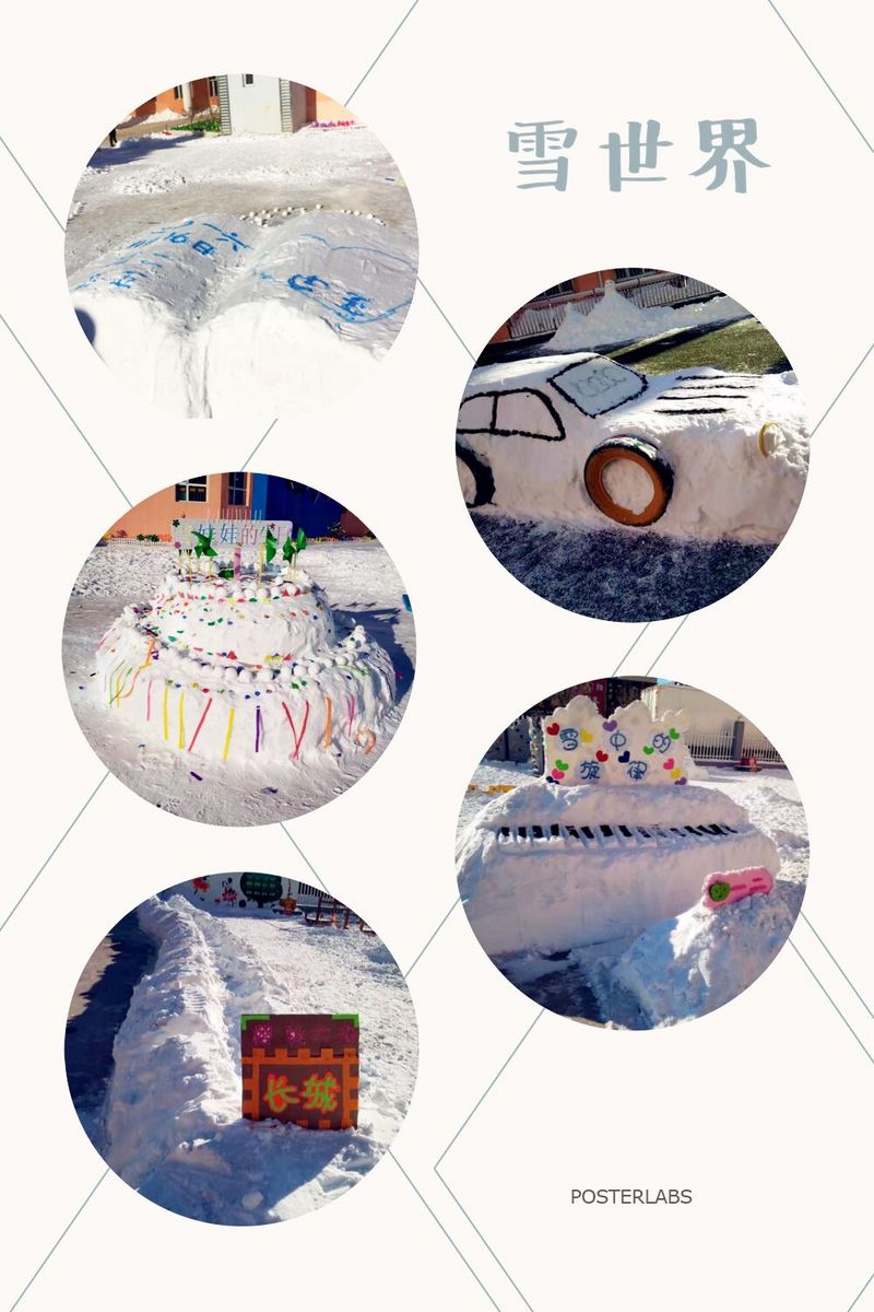小班开展了以主题名称为“冰雪王国”、“雪的世界,书的海洋”、“雪国长城,国防教育从娃娃抓起”的雪雕大比拼作品制作;中班开展了以主题名称为“雪中的旋律”、“雪娃娃的生日”的雪雕大比拼作品制作;大班开展了以主题名称为“相亲相爱一家人”雪雕大比拼作品制作。
