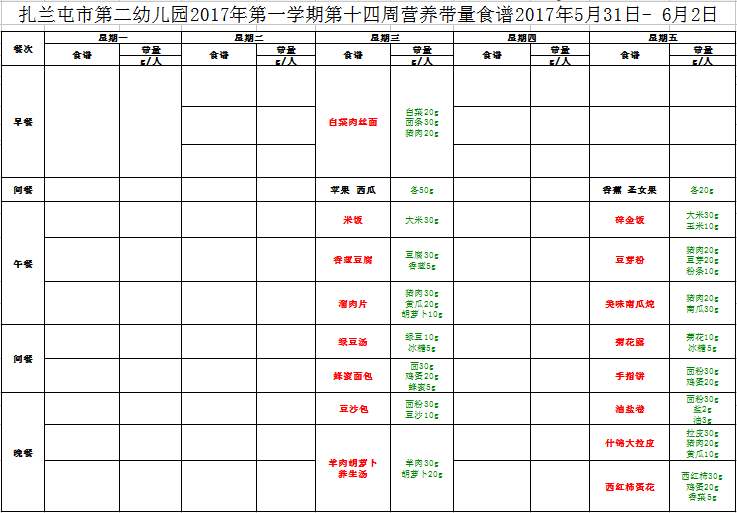 扎兰屯市第二幼儿园2017年第一学期第十四周营养带量食谱2017年5月31日- 6月2日