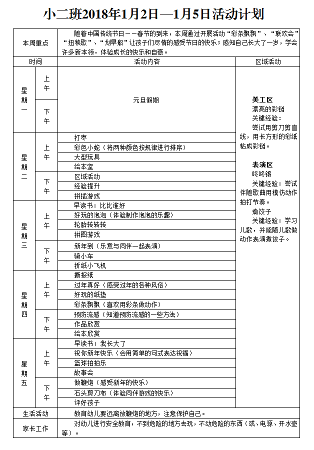 2018年一月第一周周计划
