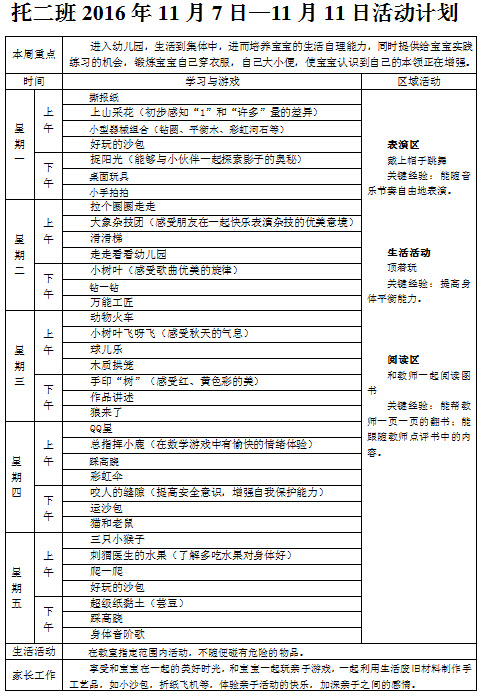 托二班2016年11月第一周计划