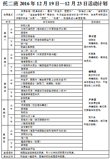 托二班2016年12月第三周教学计划