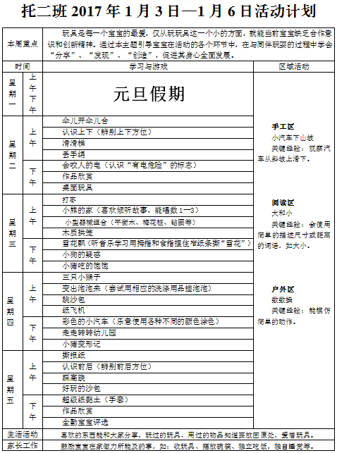 托二班2017年1月第一周教学计划