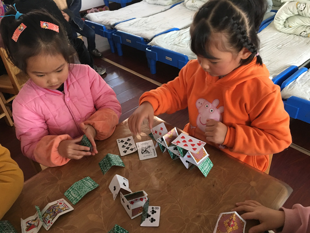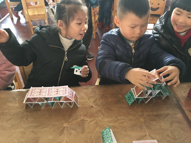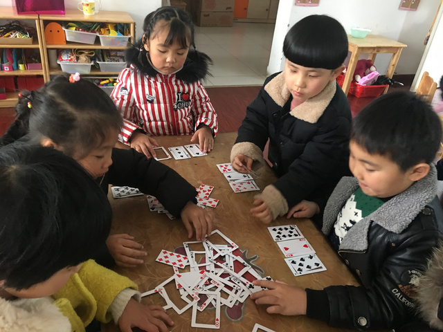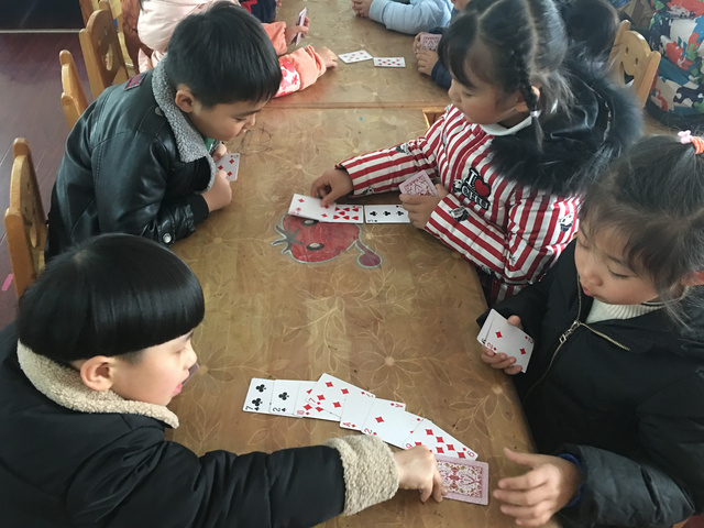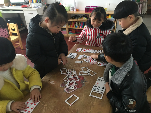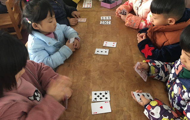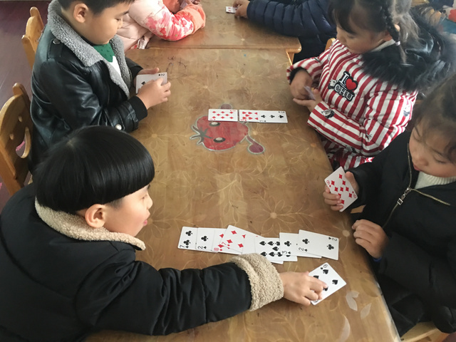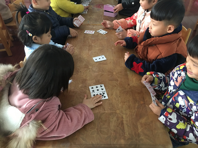 游戏背景: 一次偶然的机会,一个小朋友带来了一副扑克牌,不同图案不同数字的扑克牌立即引起了孩子们的注意,孩子们就利用小小的扑克牌做起游戏来,在游戏中探索、在游戏中探索起来! 1、大胆尝试扑克牌的多种玩法 3、能够与同伴合作,体验游戏的快乐 游戏准备:扑克牌若干 玩法二:我会搭 玩法三:方框对对碰 玩法四:大鱼吃小鱼 幼儿根据石头剪刀布游戏决定谁先出牌,每次出一张,数字较大的即为大鱼,数字较小的即为小鱼,然后进行比较,大鱼吃掉小鱼,即数字较大的幼儿将两张牌全都收回去。 游戏反思: 《纲要》中指出:教育内容的选择,既要适合幼儿的现有水平,又要有一定的挑战性。而扑克牌是幼儿生活中比较常见的,从中挖掘学习的元素,也符合了纲要中提到的--教学内容既要贴近幼儿的生活来选择幼儿感兴趣的事物和问题,又要有助于拓展幼儿经验和视野的原则。