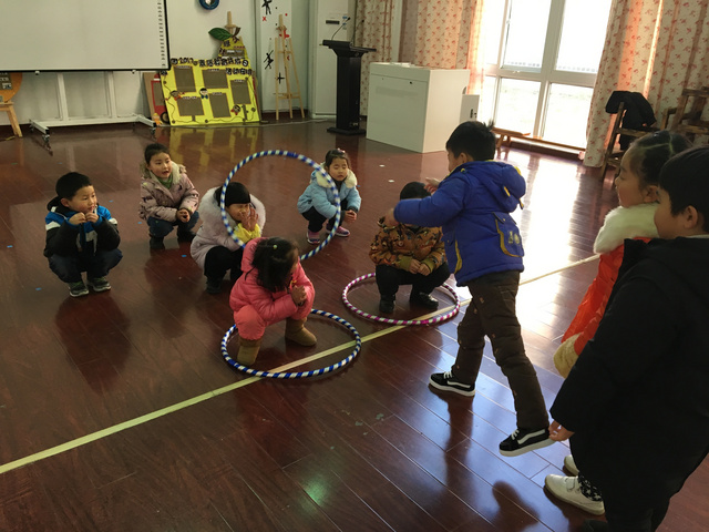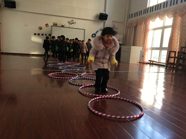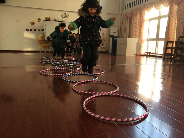3、跳跳乐:将呼啦圈以不同的形式摆放在地上,让小朋友们使用单脚、双脚跳的方式从呼啦圈里面跳过去。