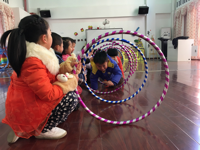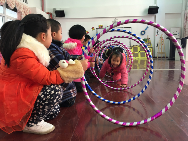 2、钻钻乐:小朋友们将呼啦圈变成各种造型的圈圈,让其他的小朋友们从呼啦圈中间钻过去。