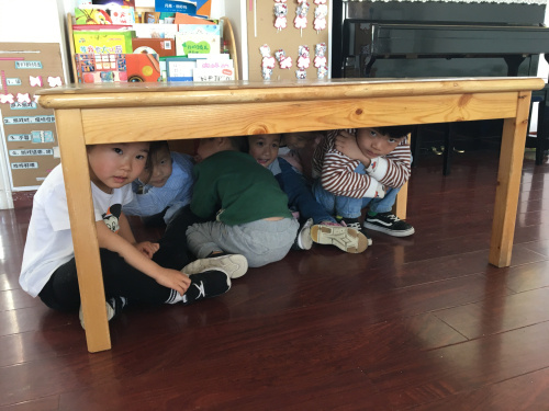 随着信号员的 “嘟,嘟……”哨响,紧接着传来了“地震了!地震了!”的紧急呼喊声,孩子们在我们的引导下,纷纷选择桌子、门背后等地方进行躲避,“抱头”、“闭眼”、“蹲下”,我们不时的提醒着孩子们。几分钟后全部人员撤出教室,哨声再次响起,孩子们快速集合,清点人数后汇报负责人,此次演习顺利结束。