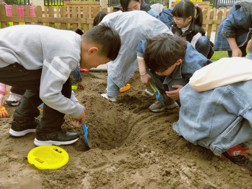 每到户外活动时间,我发现幼儿园的沙池里总是孩子们最喜欢的去处,他们极有兴致地玩弄着沙子,看上去是那么的专注。 今天户外活动时,本来是安排滑滑梯,可是冉冉却跑到我面前对我说:“老师咱们能不能玩沙子呀?”我想:何不借这次机会去看看他们到底在干什么呢!于是我领着孩子们来到沙地里,这时他们像一群放飞的小鸟,“飞”到沙地里忙了起来。不起眼的小小沙粒,在成人眼里不过是建筑用的材料而已,却能给孩子们带来这么大的乐趣。你瞧,他们用沙子做馒头、冰淇淋;在沙地里挖地洞、堆高山、筑铁路……瞧孩子们那股认真劲儿,没想到一块小小的沙地,却成了孩子们的乐园。