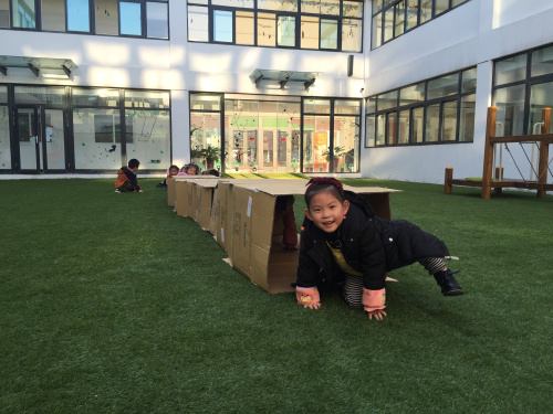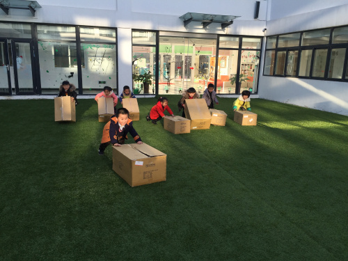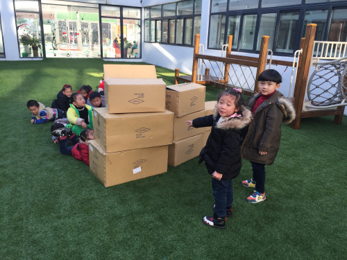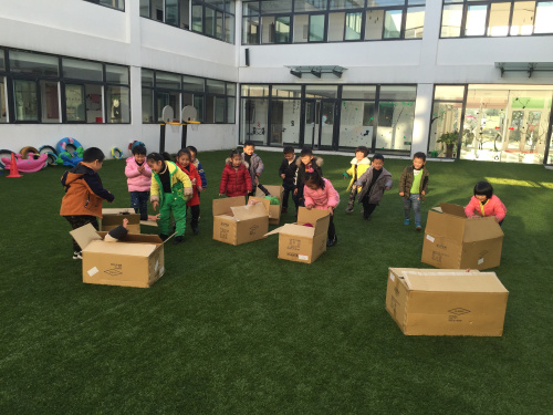 游戏背景: 在日常生活中常会有许多废弃的大小纸箱,如电视机、冰箱、微波炉等家用电器包装纸箱,周围生活中的废旧物品,只要你善于发现利用它们,就能变废为宝。我和幼儿一起收集很多纸箱,让幼儿上课时自由发挥他们的想象力,既能增加游戏的趣味性,又能充分发挥了幼儿的想象力,使幼儿上得有趣、玩得开心。在生活中很多孩子不愿意与同伴交流,为了能让幼儿体验与同伴合作的快乐。为了让游戏更具科学性、成效性,更富特色性、趣味性,于是根据幼儿的兴趣,特设计本次游戏活动——《纸箱变变变》。 游戏目标: 1、通过游戏,提高幼儿动作的协调性和灵活性。 2、能探索出箱子的多种玩法。 3、通过游戏活动,培养幼儿的合作和竞争意识。 游戏准备: 一样大小的纸箱若干、音乐、操场 游戏玩法: 玩法一:开坦克 幼儿分成两组,四个小朋友一组,并排站着,共同向前滚动,哪组最先到达终点哪组获胜。 玩法二:猜猜乐 幼儿分别躲在纸箱里,露出一只手在纸箱外面,其他幼儿猜猜纸箱里面躲了哪个小朋友。