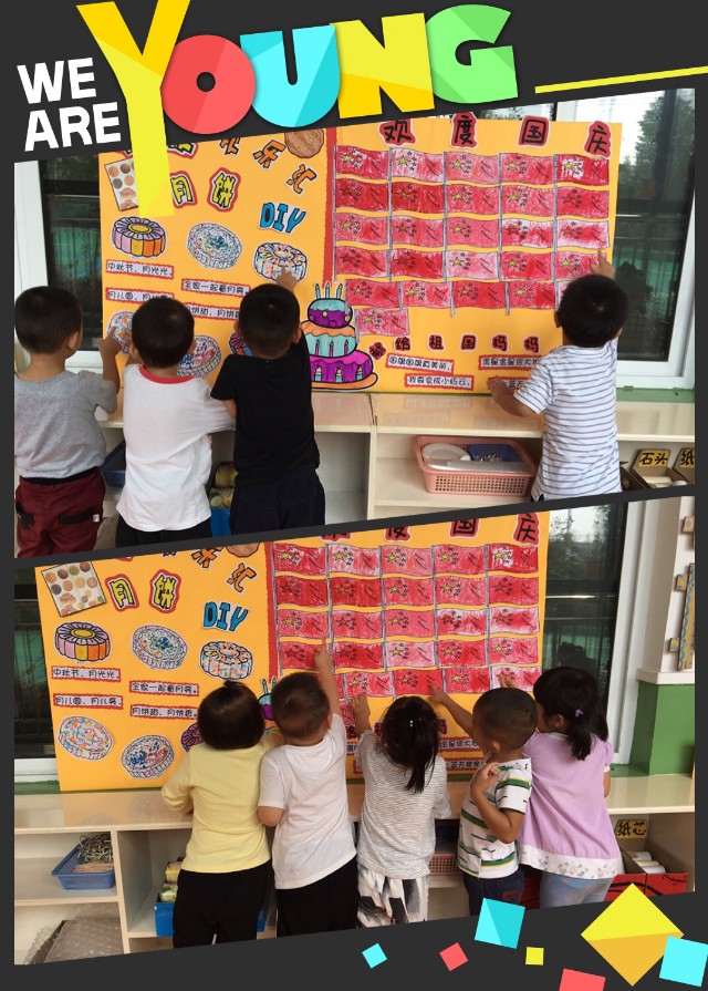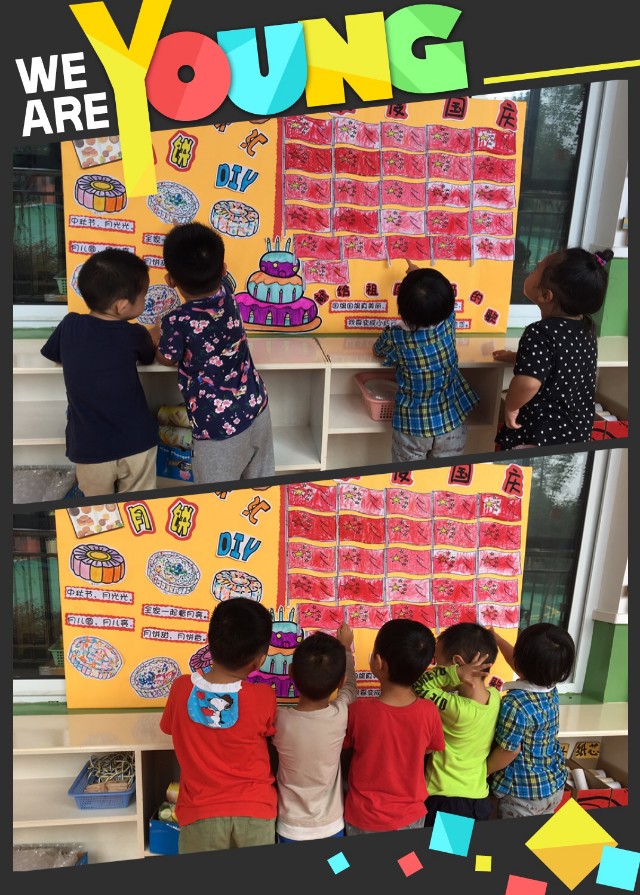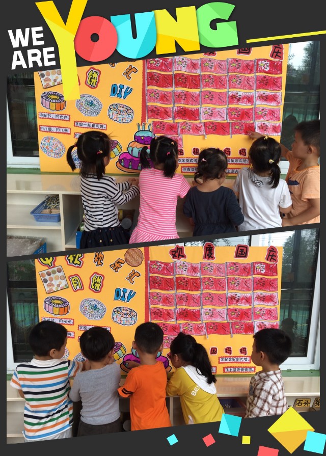 金秋送爽,举国欢庆,先是六十八年周年举国欢庆的国庆,再是家家团圆的中秋佳节。在国庆和中秋来临之际,我们小班的孩子也为祖国妈妈送上了生日礼物哦,孩子们看着用自己的小手为我们的五星红旗涂上鲜红的颜色。孩子看着自己的作品非常的开心和喜悦。紧接着又为中秋佳节具有代表性的月饼进行装饰,有涂色的、有粘贴的、有用颜料的等等,小朋友忙得不亦乐乎。