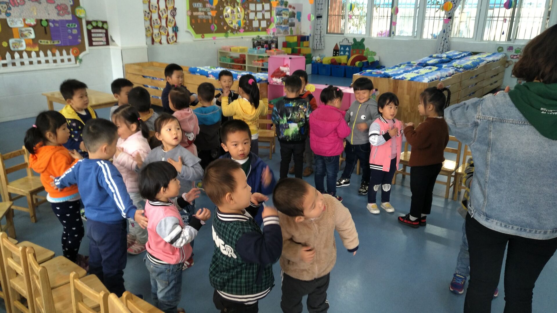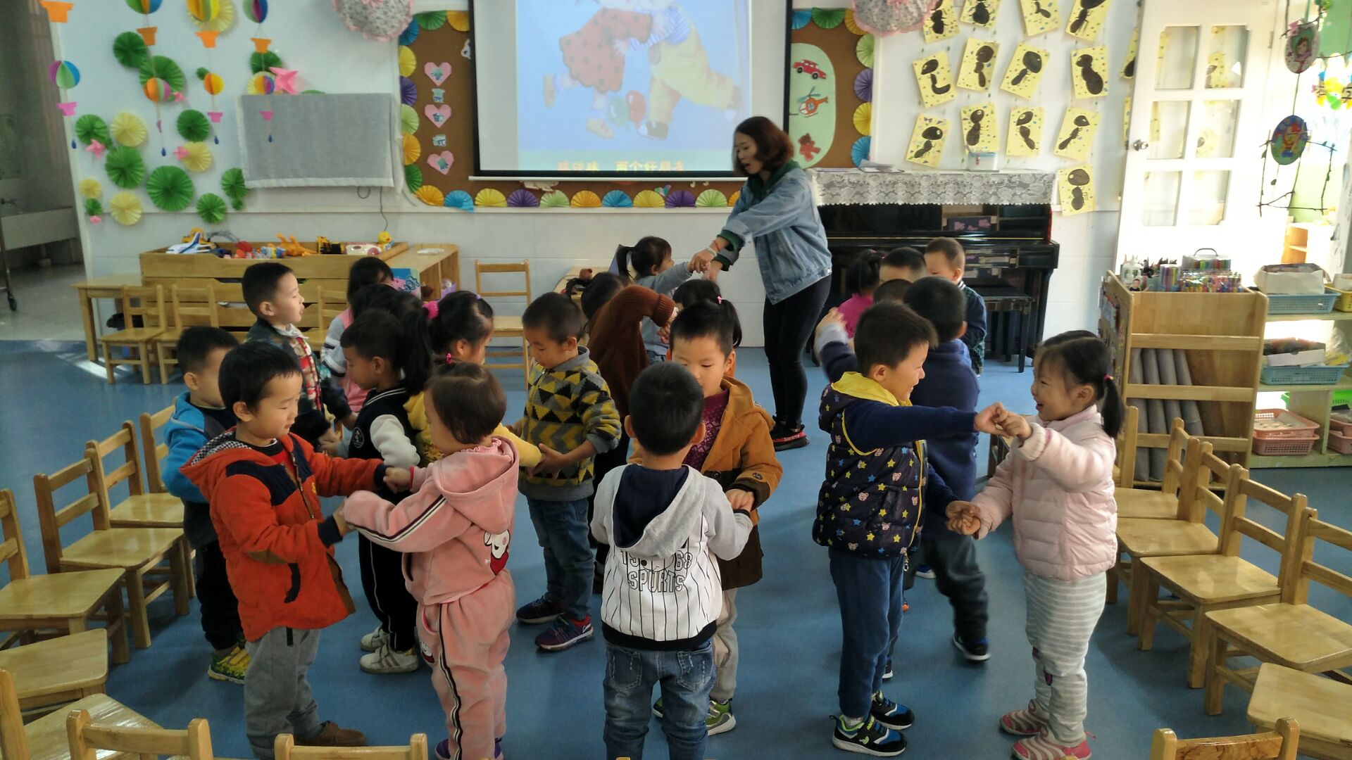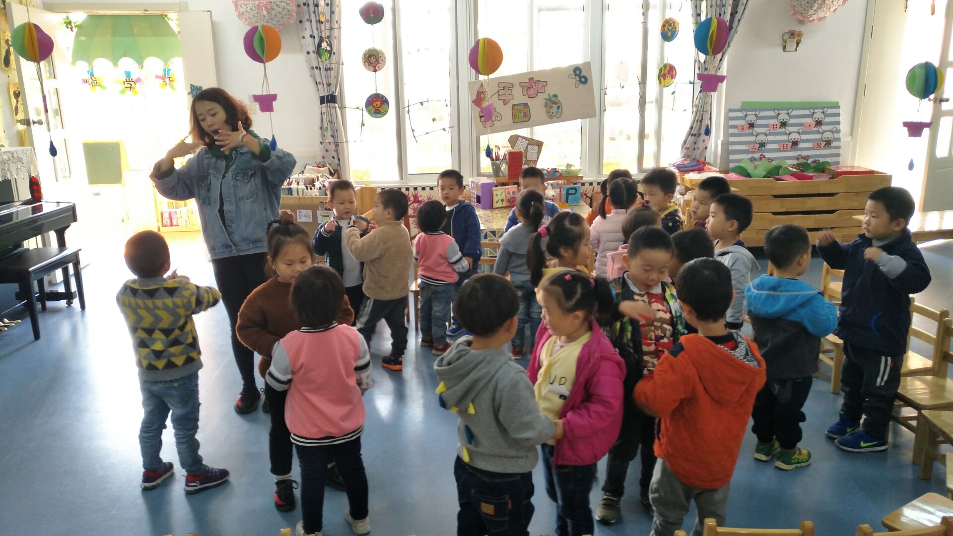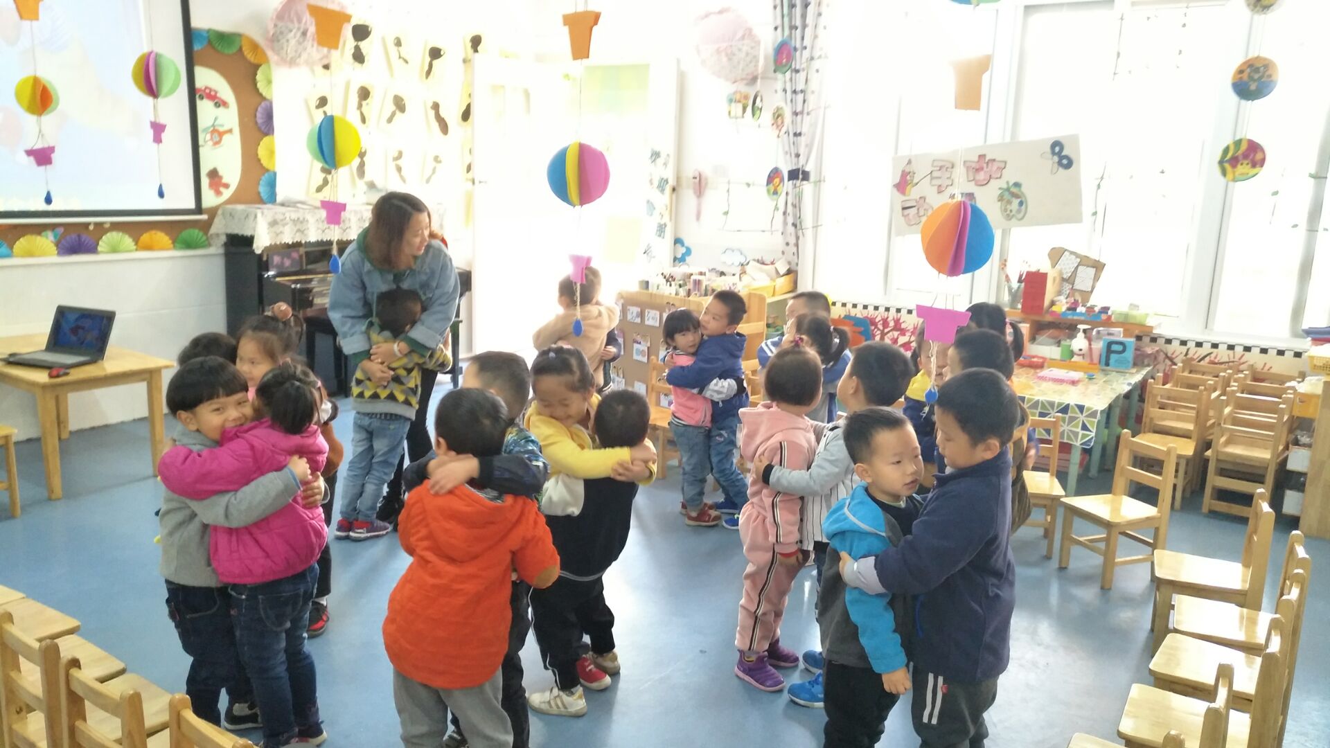 今天我们小朋友学习了儿歌:《大气球》,小朋友们都能找到自己的好朋友,根据儿歌内容做出相应的动作。回去后让孩子们把儿歌说给爸爸妈妈听,并和爸爸妈妈一同做游戏!