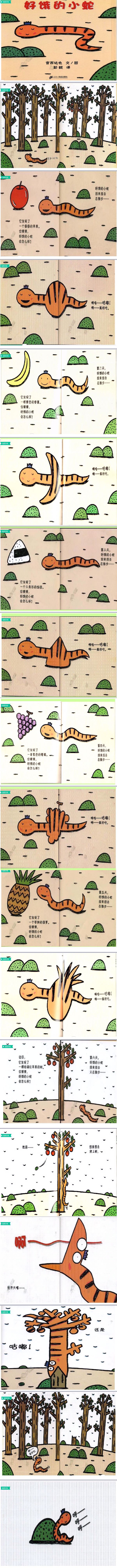 今天我们开展了语言活动绘本《好饿的小蛇》,故事内容简单,画面形象生动有趣。故事中的拟声词的出现,使故事充满了趣味性,小蛇贪吃的模样吸引着孩子,适合小班孩子的模仿与表演。因此我设计了《好饿的小蛇》这一课题。在活动中教师通过提炼幼儿的生活经验,让幼儿以主人公的形式,讲述自己见到苹果后会怎么样来开始故事,幼儿根据第一部分小蛇吃了苹果后变成苹果蛇,来反推后面的三个部分,不仅让孩子们回忆巩固自己对香蕉、葡萄、菠萝的认识,还让幼儿的思维有了一定的发展。故事中小蛇出乎常理的好吃,抓住了孩子的兴趣点,同时结合《纲要》精神在活动中鼓励幼儿大胆、清楚地表达自己的想法和感受,发挥幼儿的想象力,尝试描述简单的事物或过程,让幼儿溶入到故事的角色中去,在活动中加深对故事的体验和理解。