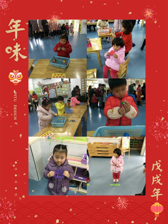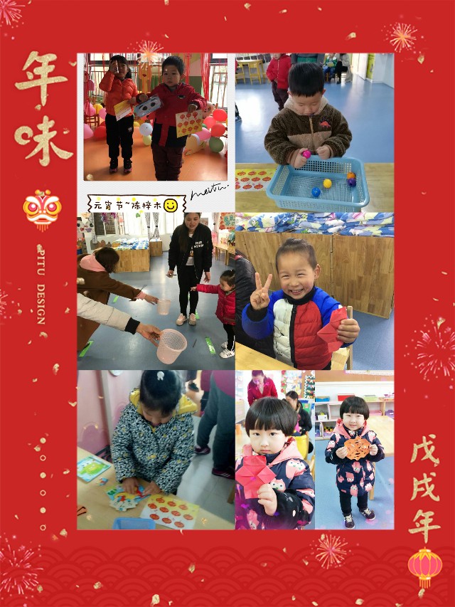 为了让幼儿感受我国传统节日的喜庆气氛和民俗风情,周五上午(正月十五)东门幼儿园举行“闹元宵亲子游园会”活动。我们教师根据传统节日和孩子的年龄特点设计了“折灯笼灯”、“猜灯谜”、“新年送祝福”、“剪窗花”、“写福字”等丰富多彩的活动,使孩子们更进一步了解元宵节的习俗同时也让家长与孩子共同合作完成每项游戏。和爸爸妈妈、小朋友还有老师共同度过一个难忘的元宵节。
