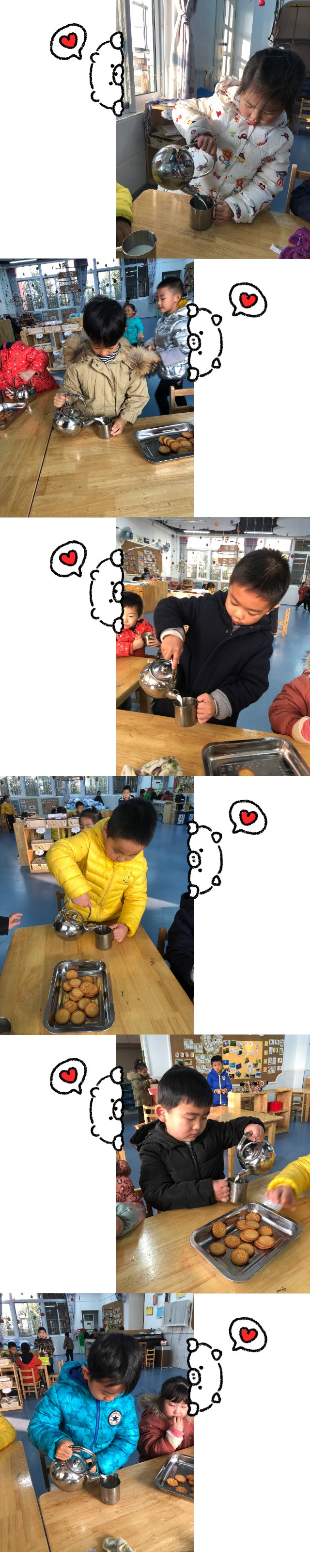 瞧,我们吃点心有什么不一样呢,告诉你们吧,以前我们吃点心都是老师给我们倒牛奶,现在我们自己倒了,自主吃点心啦,自己的事自己做。比如我们几个小朋友在喝牛奶,其他的小朋友还在区域里游戏呢,喝完的小朋友就可以进区游戏啦!老师会请在区域里游戏还没喝牛奶的小朋友洗手吃点心、、、、、现在孩子大部分时间都在游戏中。《幼儿园教育指导纲要》指出:幼儿园的教育要“以游戏为基本活动,寓教育于各项活动之中”。陈鹤琴先生说过,游戏是儿童的心理特征,游戏是儿童的工作,游戏是儿童的生命,从某种意义上说,幼儿的各种能力是在游戏中获的。