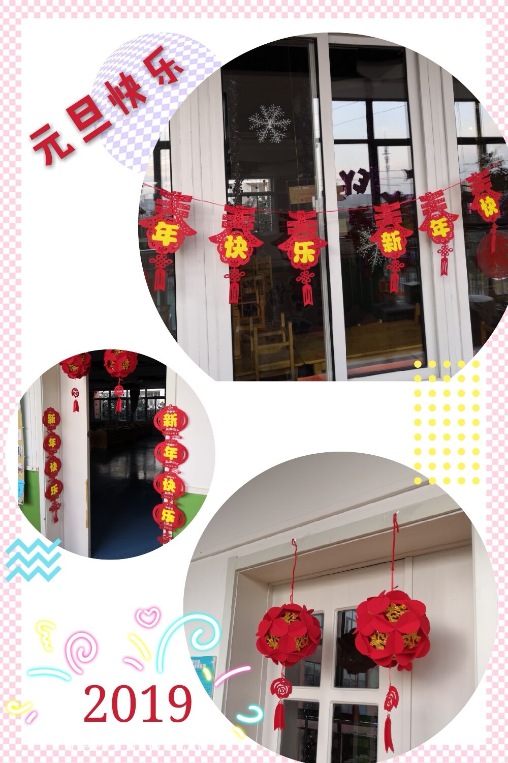 班级里张灯结彩,红色的大红灯笼、挂满了五颜六色的彩带,教室内彩色的霓虹灯,漂亮的拉花,新颖的窗花,手工编织的中国结,把班级里的环境装饰一新,家长、孩子、老师欢聚一堂,一起迎接新年的到来。