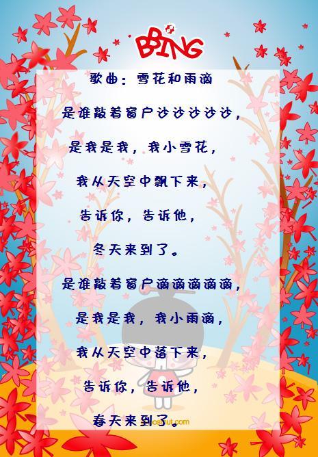 孩子们唱着好听的声音,迎接着小雪花。 冬天来了,小雪花在空中跳着美丽的舞蹈,轻柔地落下来,小声的告诉我们,冬天来到了。雨水滴的下着,我们一起学习了一首歌曲《雪花和雨滴》