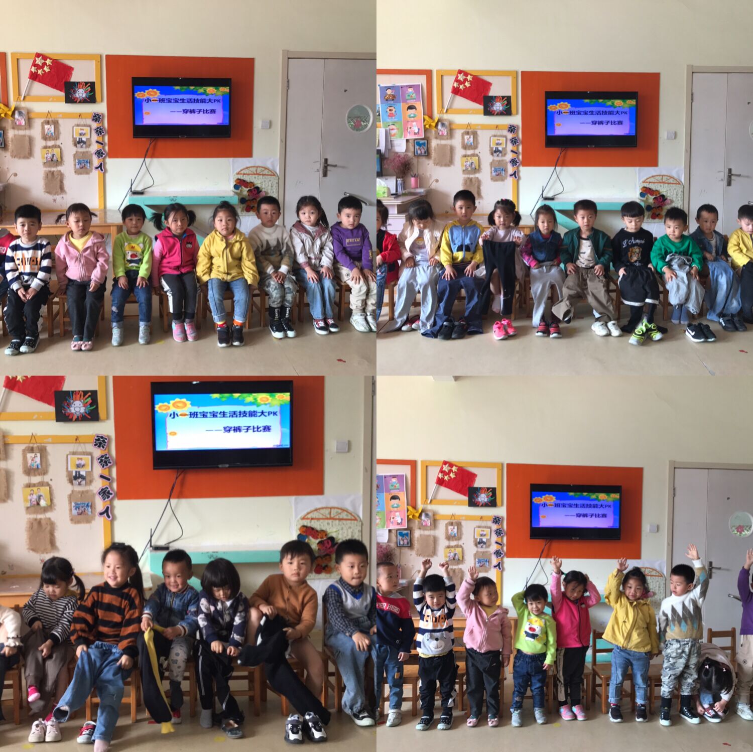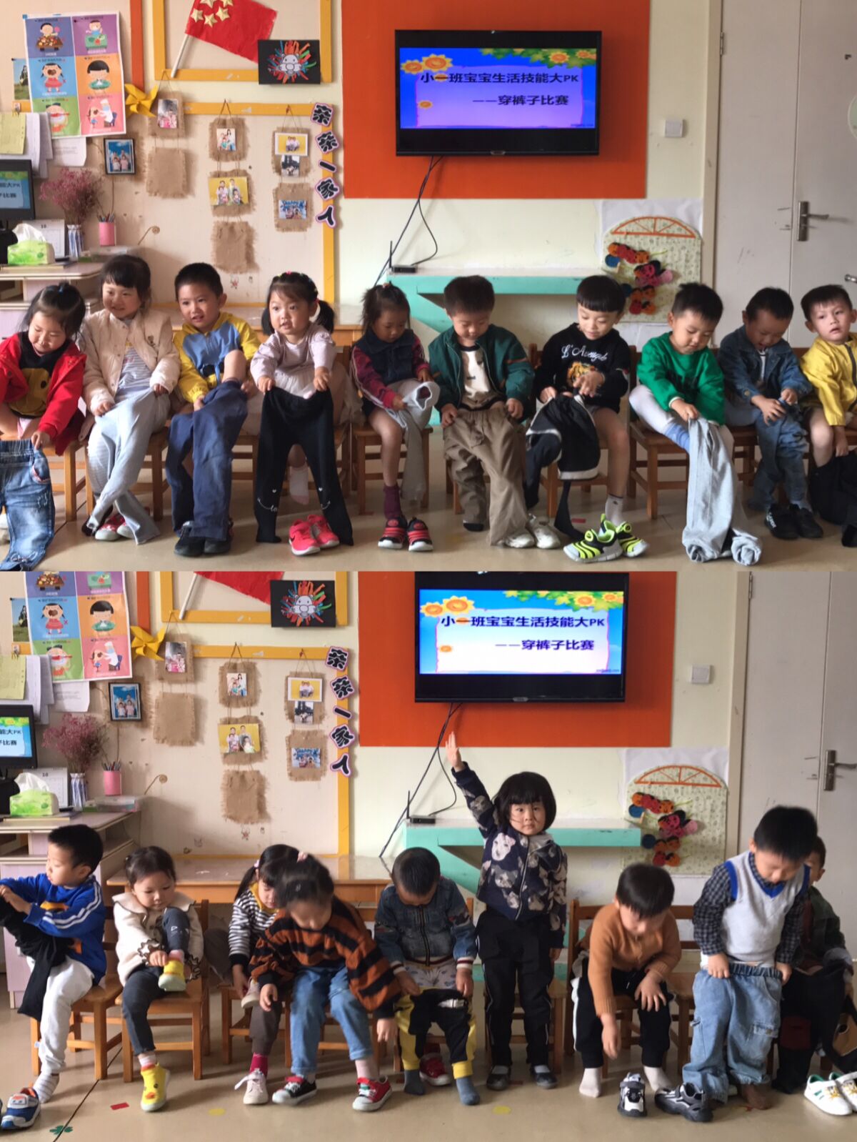 为了提高幼儿的生活自理能力,增强幼儿的自我服务意识,我们小一班举行了生活能力大PK---穿裤子比赛,随着老师一声令下,孩子们都积极行动起来,以最快的速度穿上裤子,穿好裤子的孩子会举手示意完成任务,整个比赛过程开心快乐,其他的孩子们也非常兴奋的为他们加油鼓掌. 通过本次活动,不仅提高了幼儿的自理能力,同时也激发了孩子的好胜心,竞争之中促进自理,增强了孩子们的自信心。