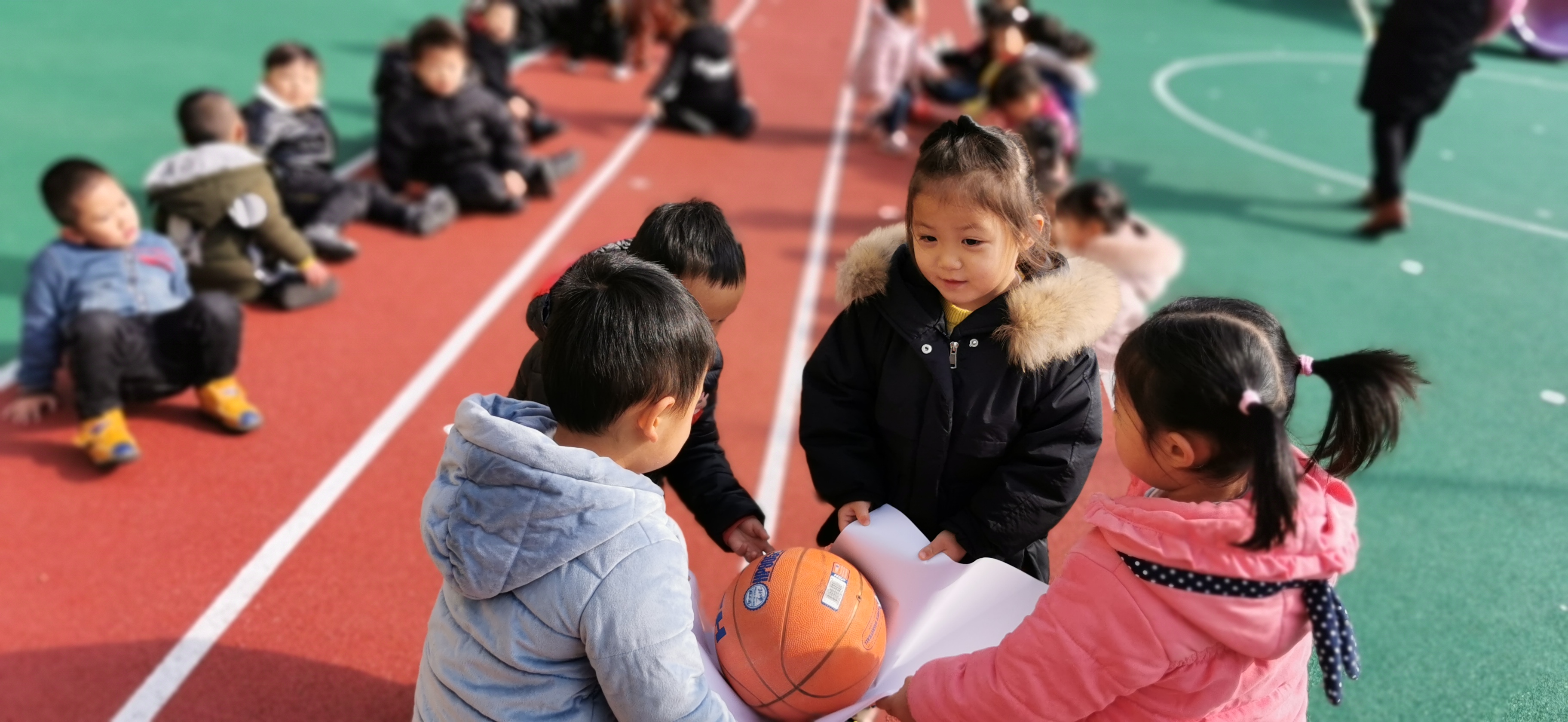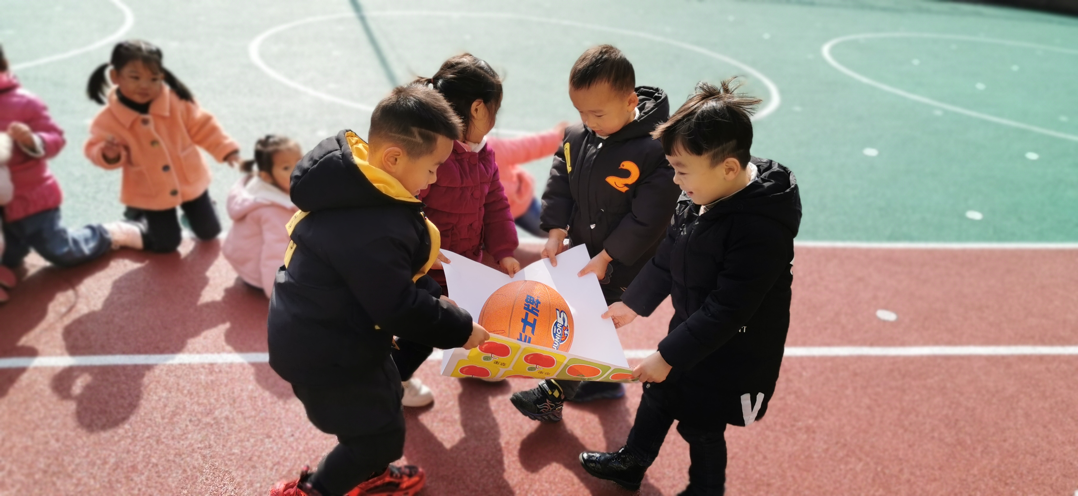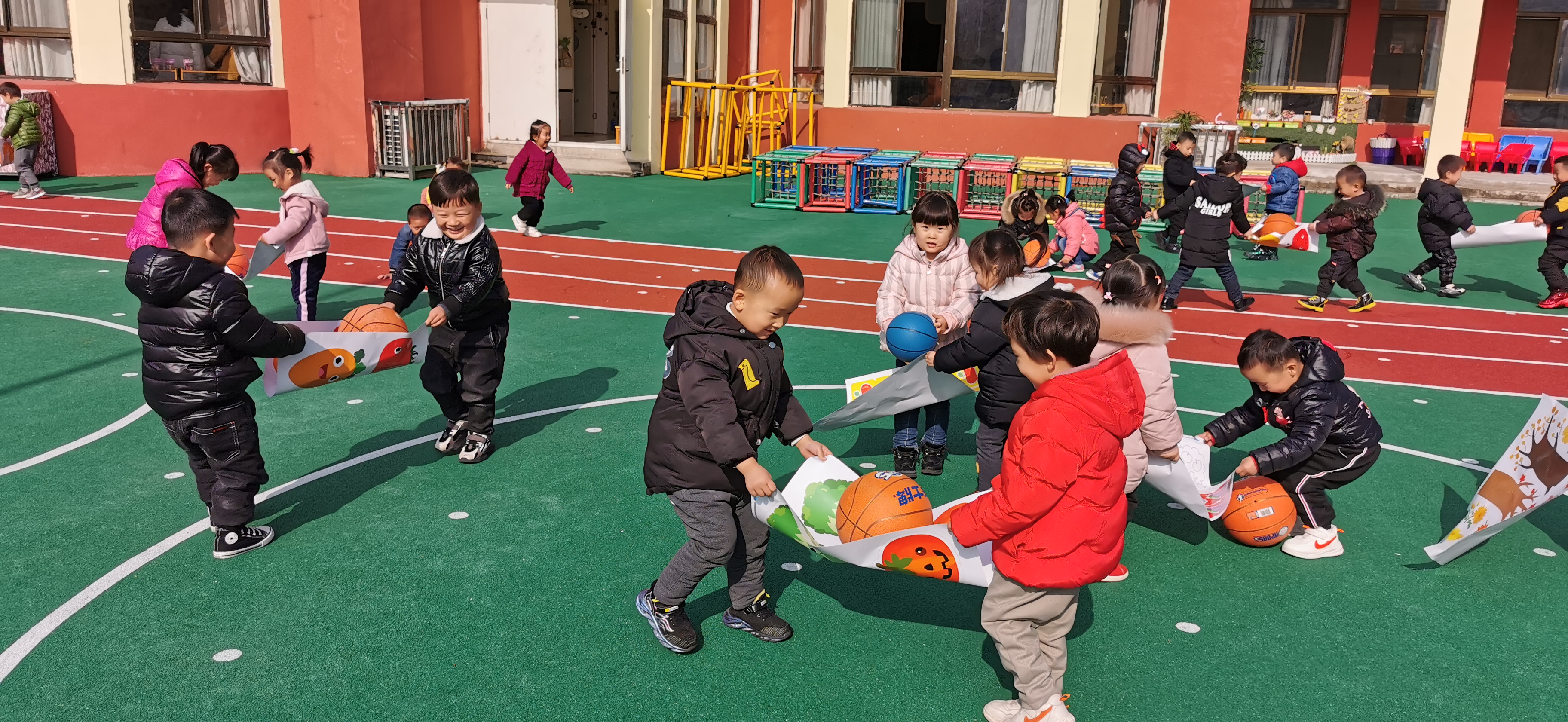 每天桌面游戏收玩具的时候,总是有三两个孩子喜欢抬着玩具筐送玩具宝宝回家,可总是因为合作的不是那么愉快而打翻了玩具筐。刚好前两天我们班的孩子学会了一首好听的儿歌《蚂蚁搬豆》,于是我便设计了这个户外游戏。 游戏目标是让幼儿在合作游戏中培养幼儿的灵活性和协调能力。先请幼儿俩俩一组,用一张大纸把篮球从一边运到另一边。幼儿自由探索方法。提请幼儿纸不能用力拉扯,会破的。大部分幼儿可以和小伙伴成功的把球运到终点处,还有的幼儿和好朋友没有合作好,球老是掉。所有幼儿都玩过一遍,开始增加游戏难度,四人一组抬球走,幼儿在游戏过程中小心翼翼的保护着篮球,努力的不让球掉下来。看!我们的“小蚂蚁”多厉害啊!