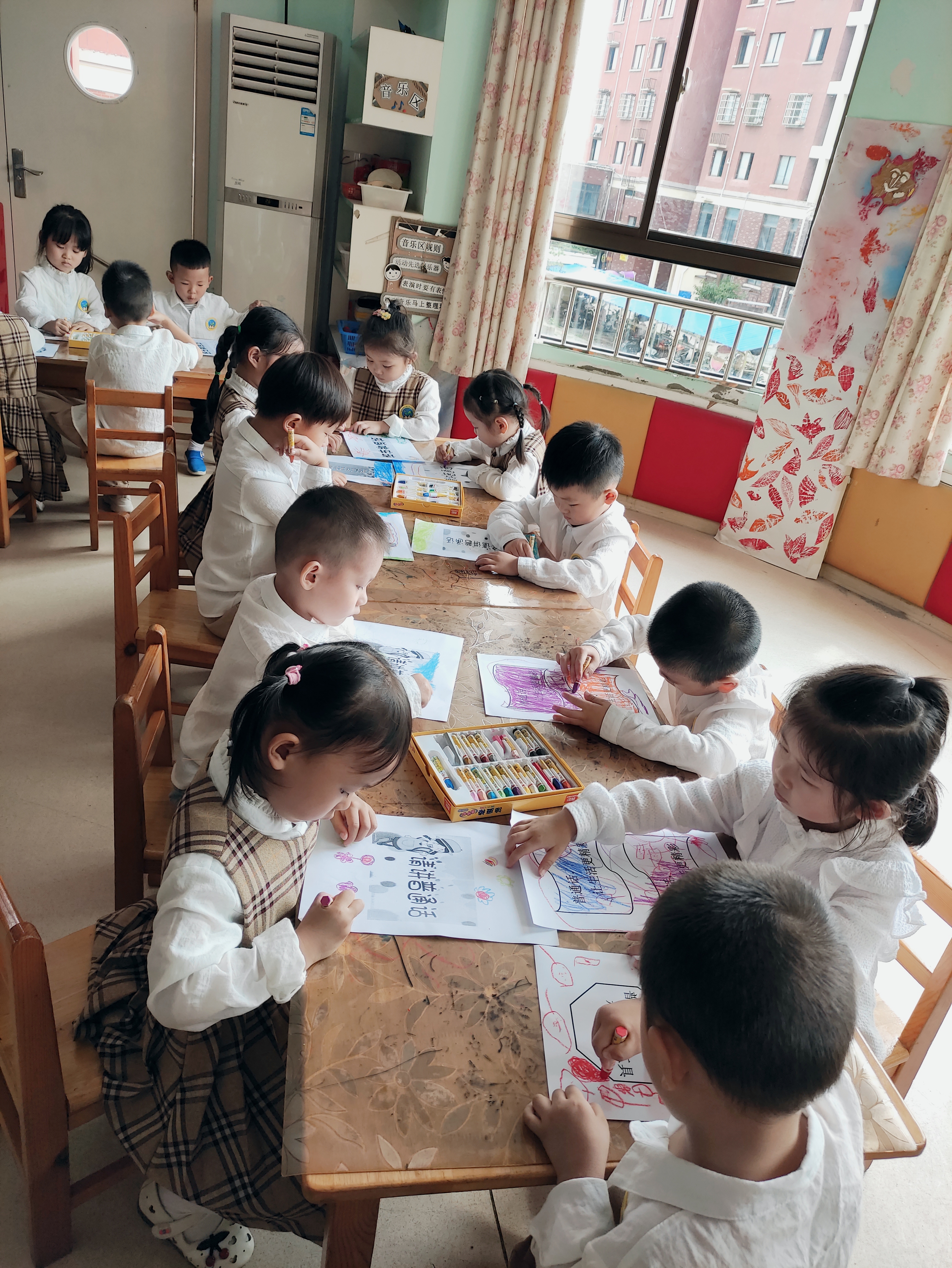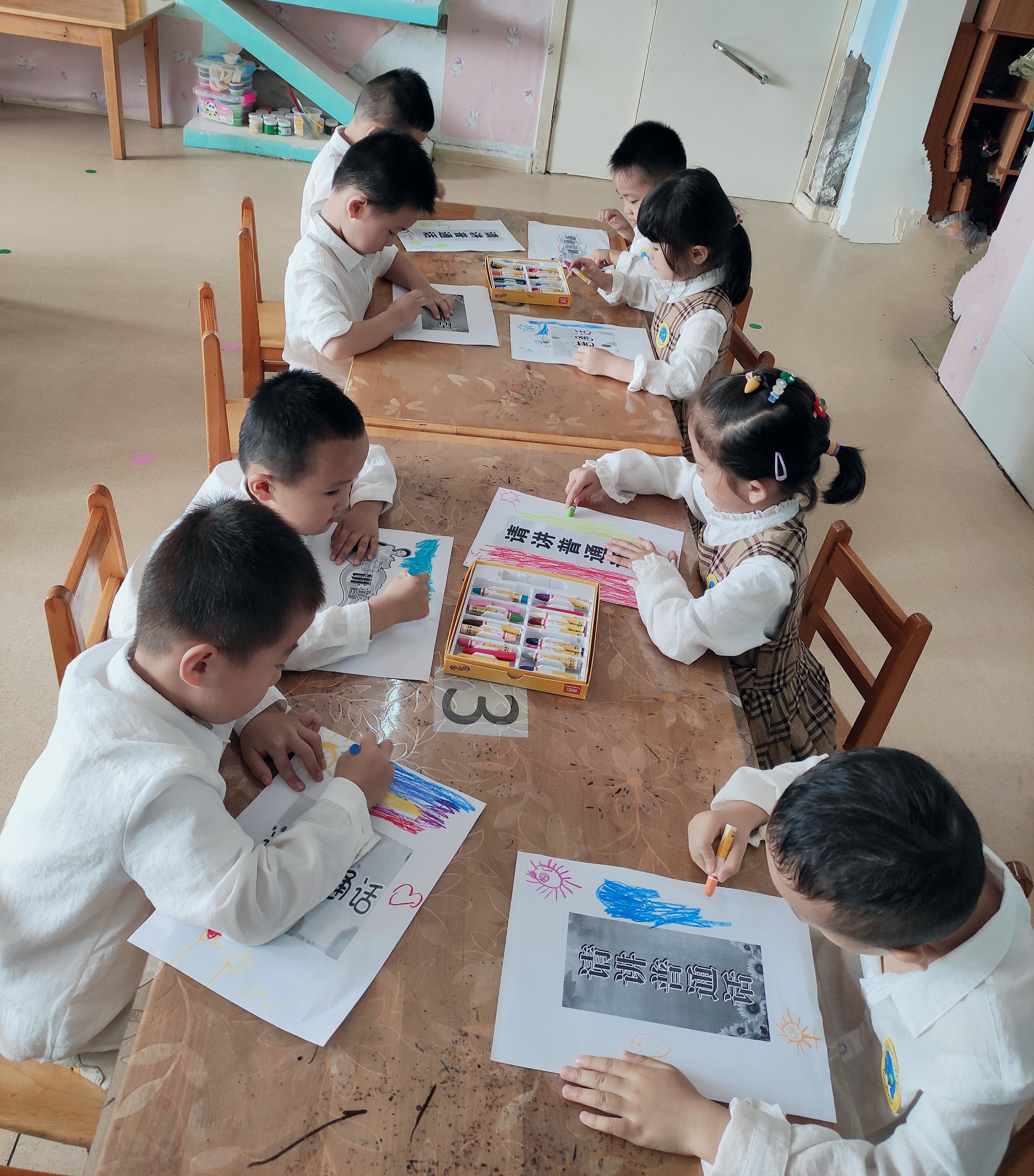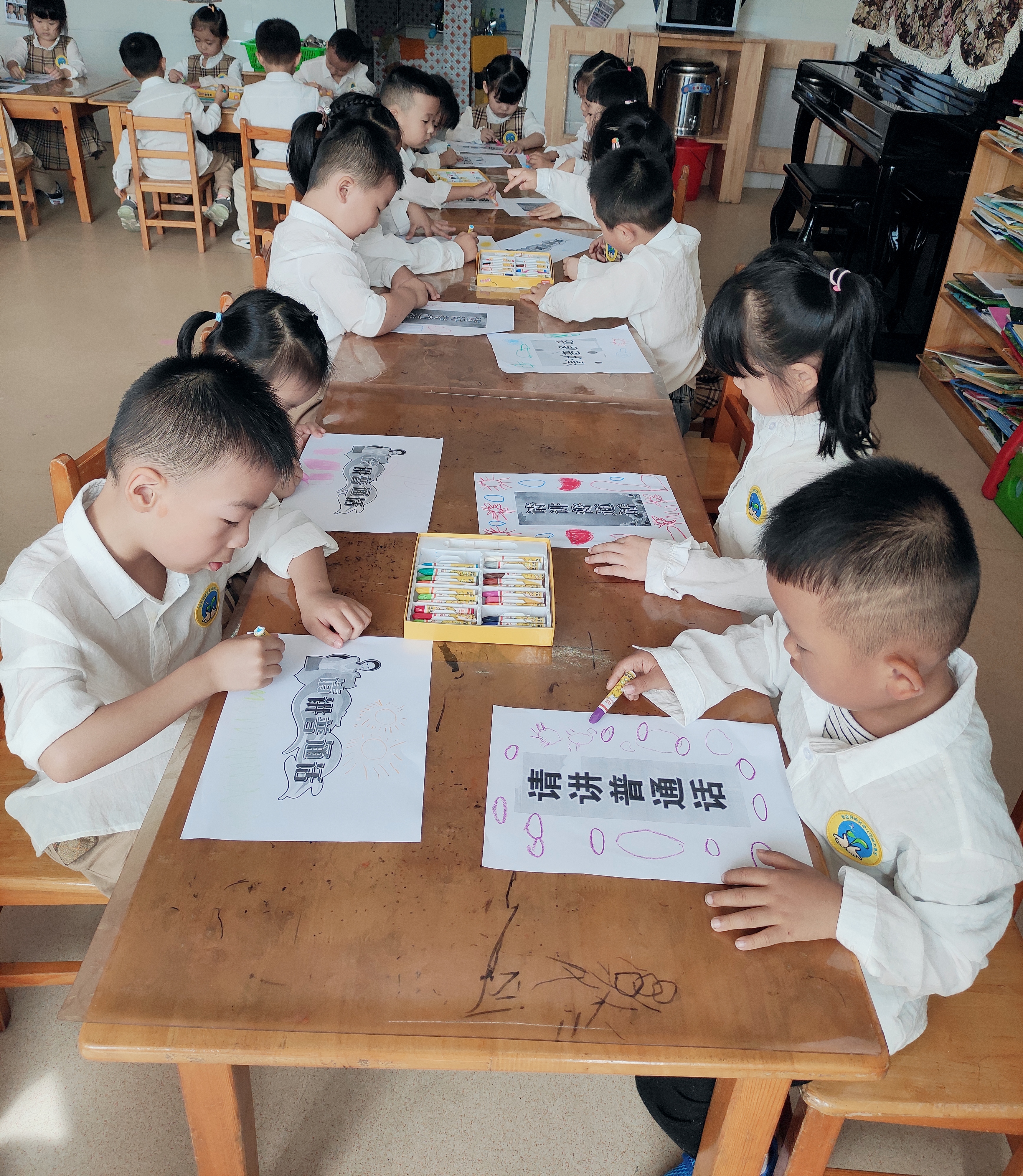 (2)我是小小设计师:制作并装饰普通话宣传标语,激发小朋友说普通话和爱说普通话的兴趣,推广普通话宣传标语,营造良好的语言环境。