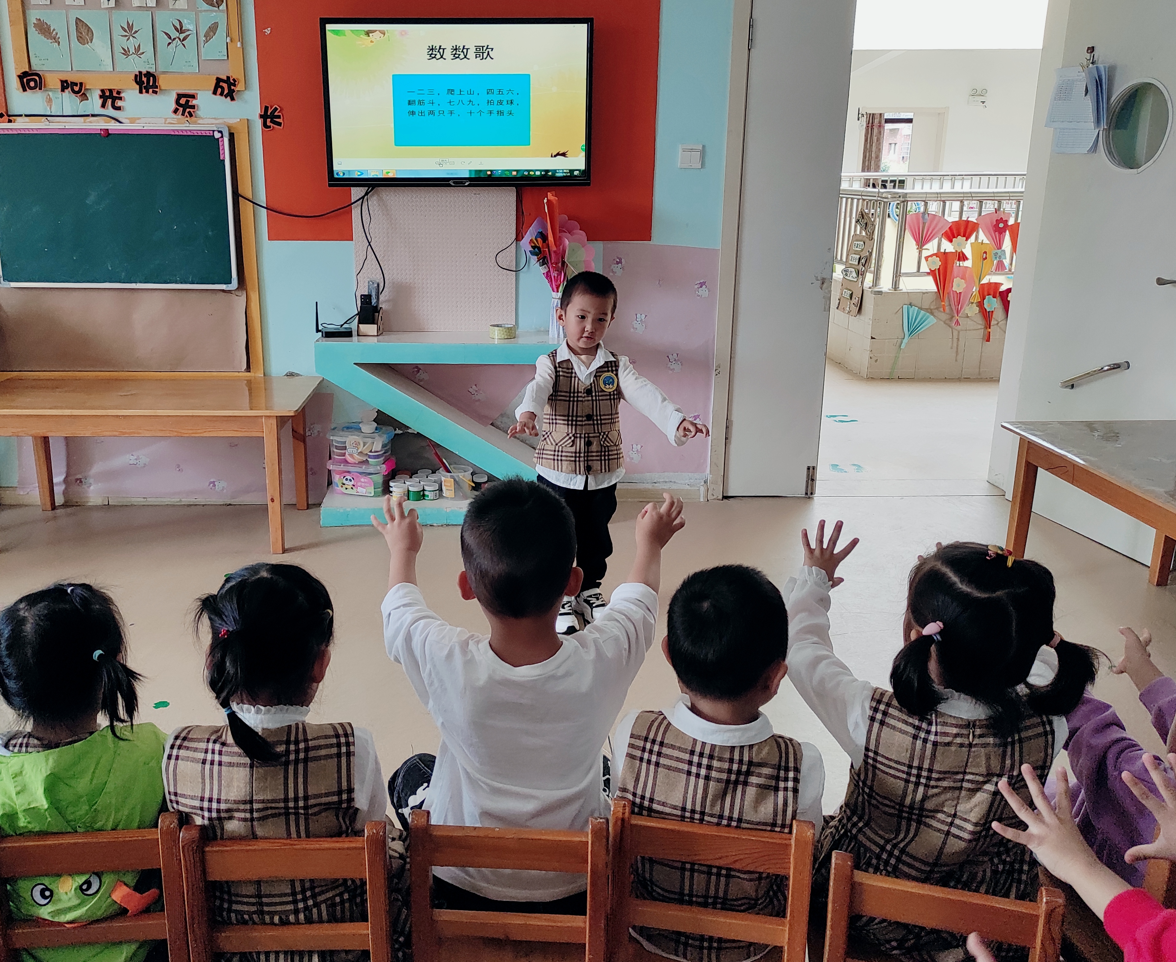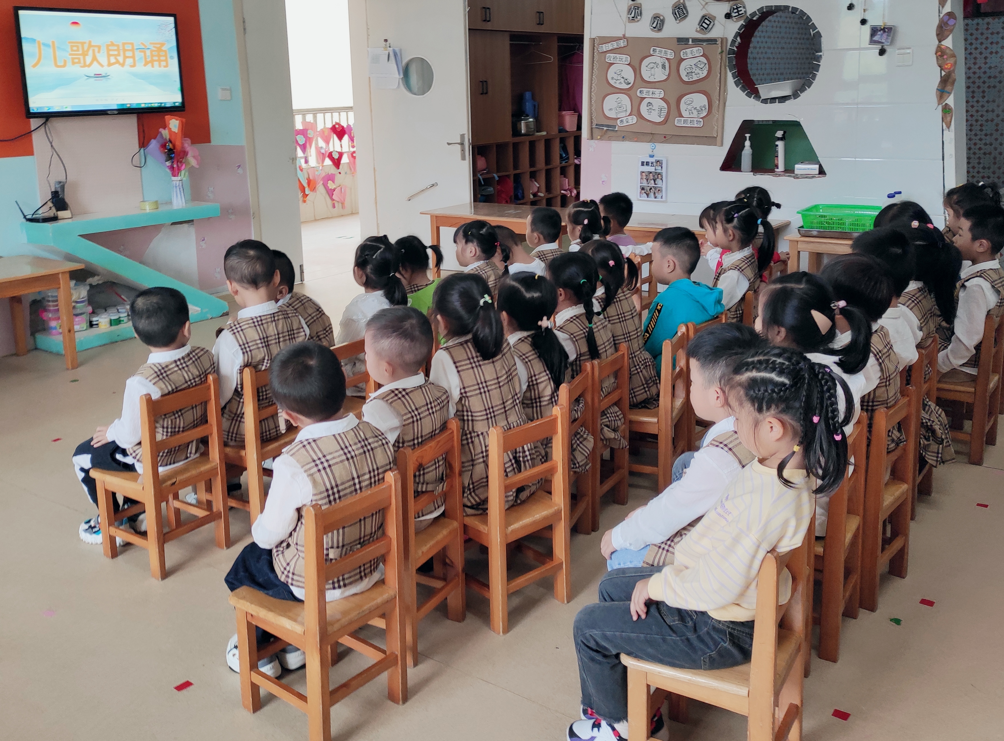根据文件《关于开展“第23届全国推广普通话宣传周”活动的通知》精神,结合我园实际,幼儿园开展主题为“我是中国娃,爱说普通话”的推普周活动,引导孩子和家长规范使用国家通用语言文字,净化家庭语言文字环境,从而促进市民能自觉讲普通话、写规范字、做文明人,提高全民的综合素质,弘扬社会主义核心价值观和中华民族优秀传统文化。我们中班小朋友开展了以下活动: (1)儿歌朗诵:朗诵儿歌、规范孩子的语言,提升他们的普通话运用能力。