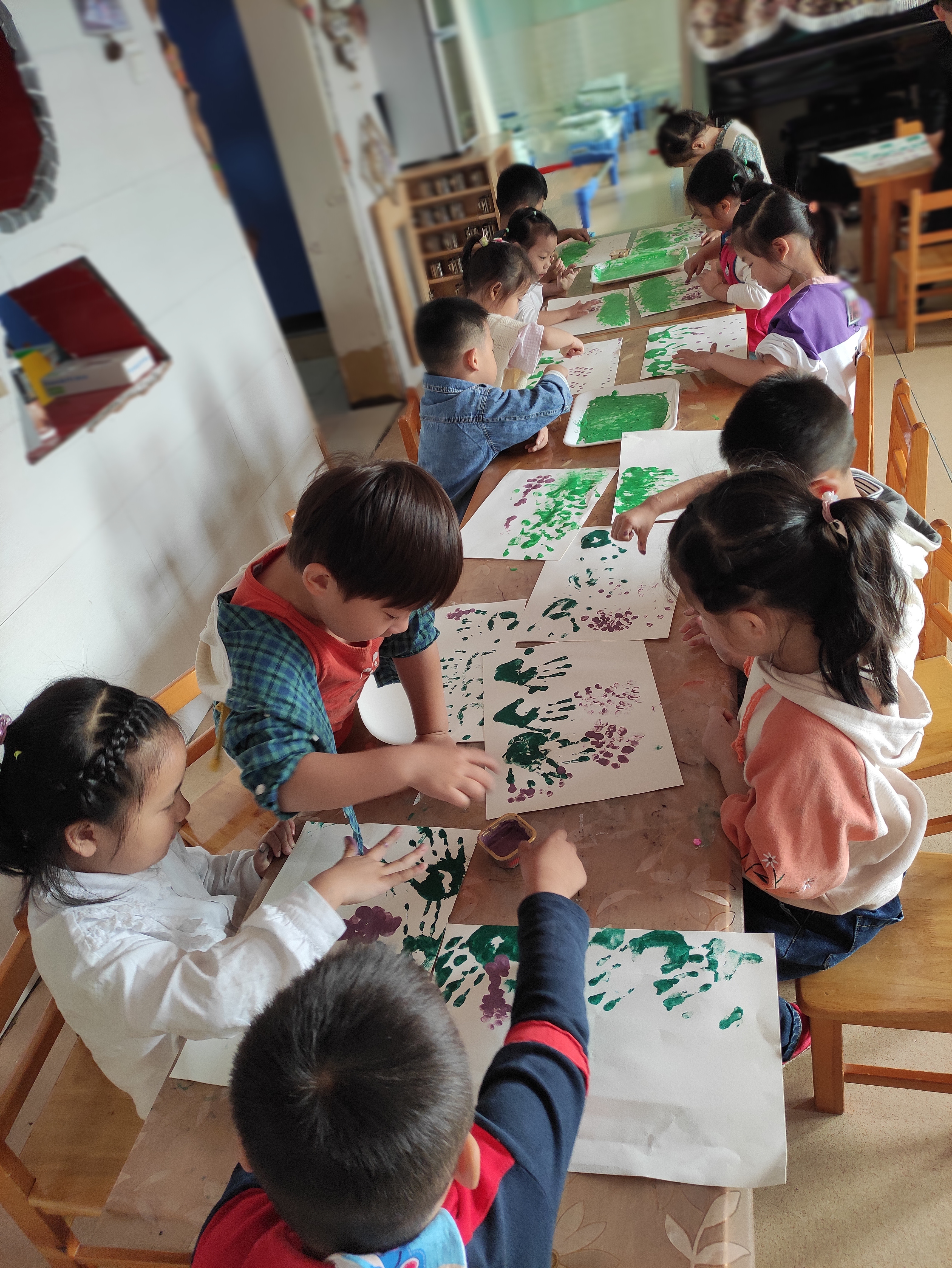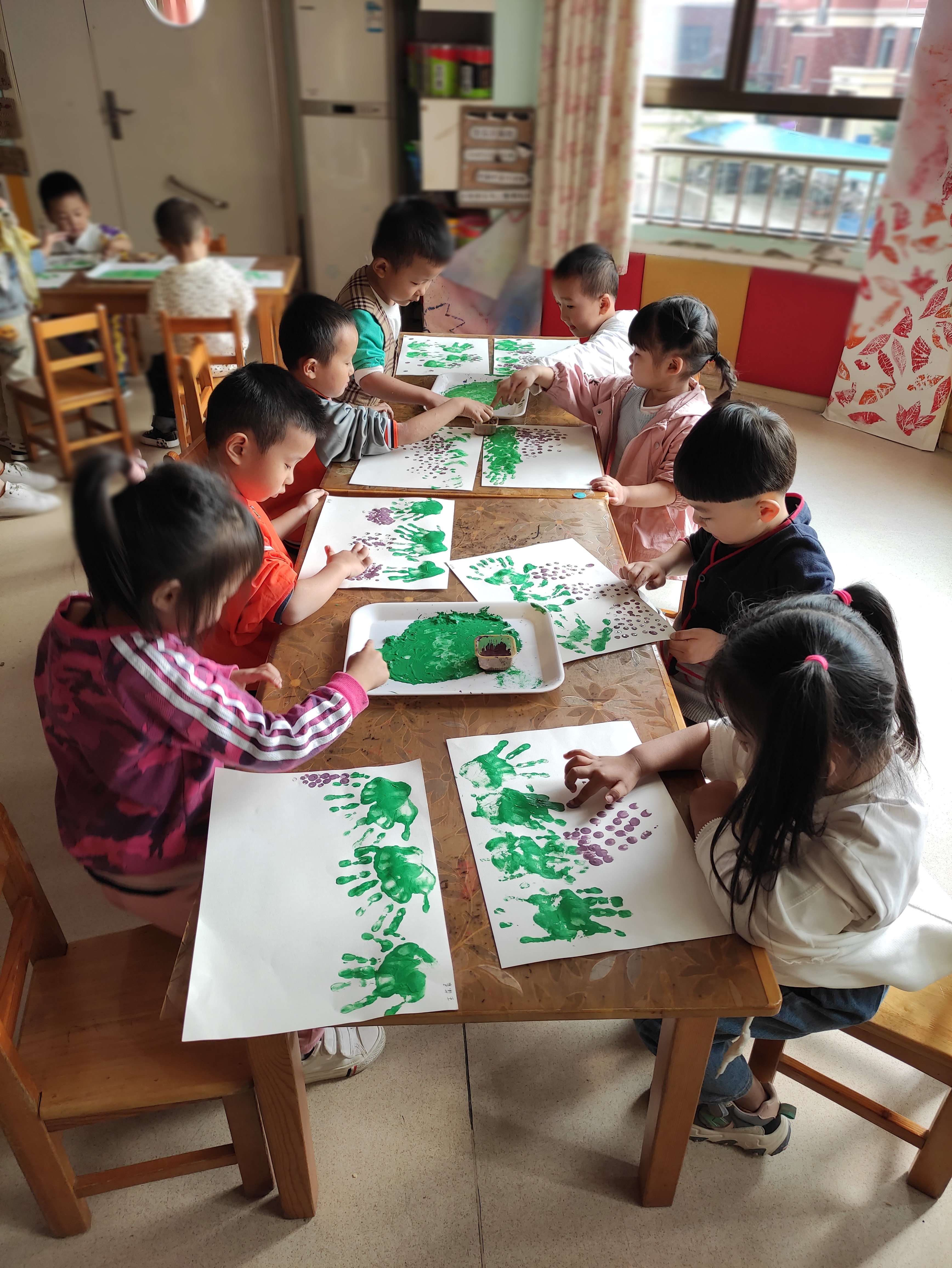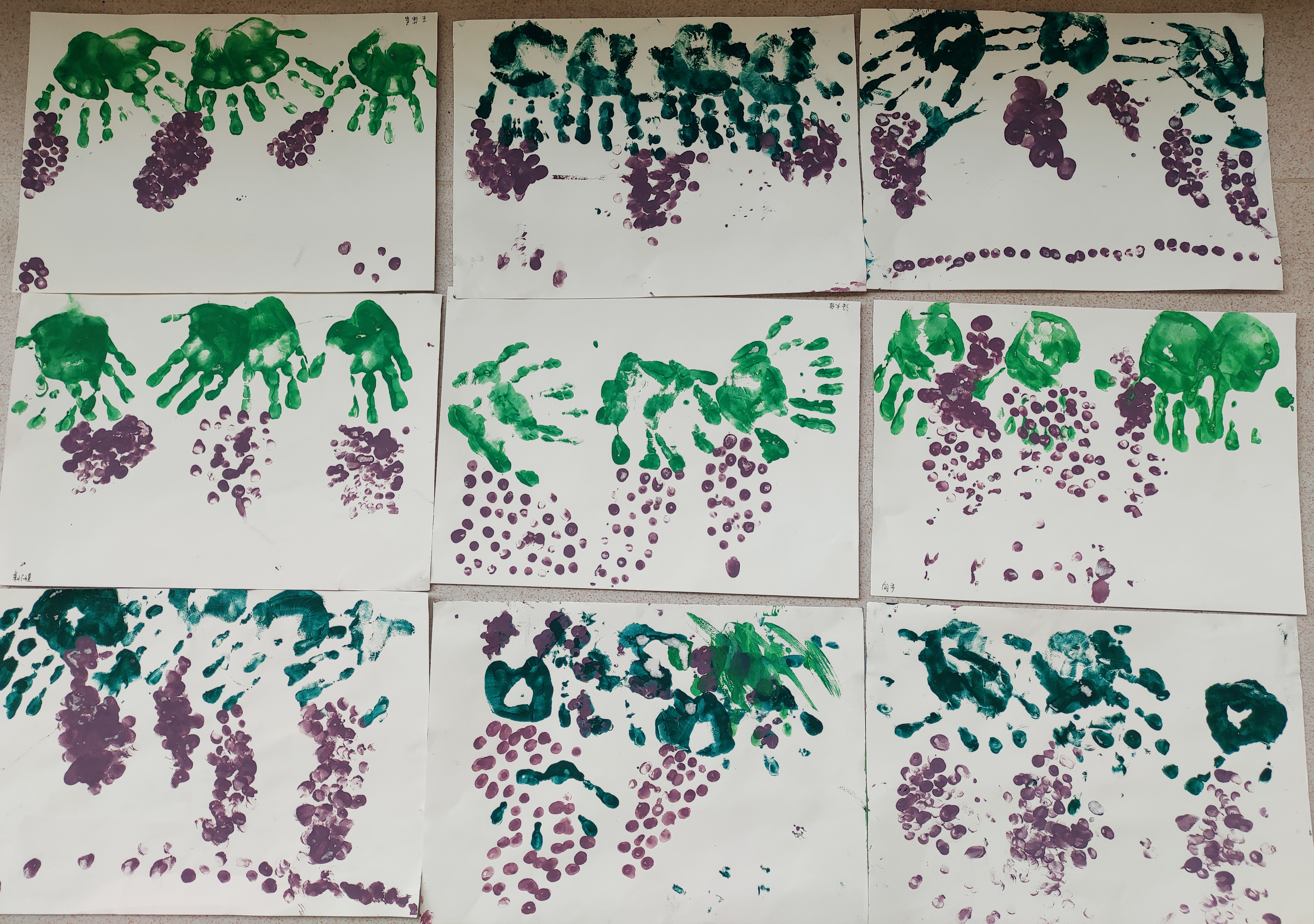 每个人的手指大小、形状、纹理都不一样,但平时小朋友们往往不太注意。本次美术活动:《串串葡萄 》通过看看、印印、想想,引导学生学注意观察身边的事物,师和幼儿讨论小手可以做哪些事情,发现我们的小手很灵活,能做很多事情,还可以用手来画画,平时,我们都是用手抓住笔来画画,今天,我们要用我们的小手来作画《串串葡萄 (手指印画)》。小朋友们一起观察教师的操作过程,学习手指压印的方法,表现出葡萄的外形及一串葡萄的形状,要求圆与圆之间既有空隙,又相互连接。美术活动中的手指印画活动可以锻炼幼儿手指的灵活性,提高幼儿对作品的欣赏能力。小朋友们对本次活动非常感兴趣,看看小朋友们都非常认真啊。 看,手指印葡萄,小朋友画得不亦乐乎呢 !手掌🤲印完绿色用洗干净,再用手指蘸紫色颜料点印葡萄。小朋友都能够掌握手指点画方法和遵守玩色规则。 |