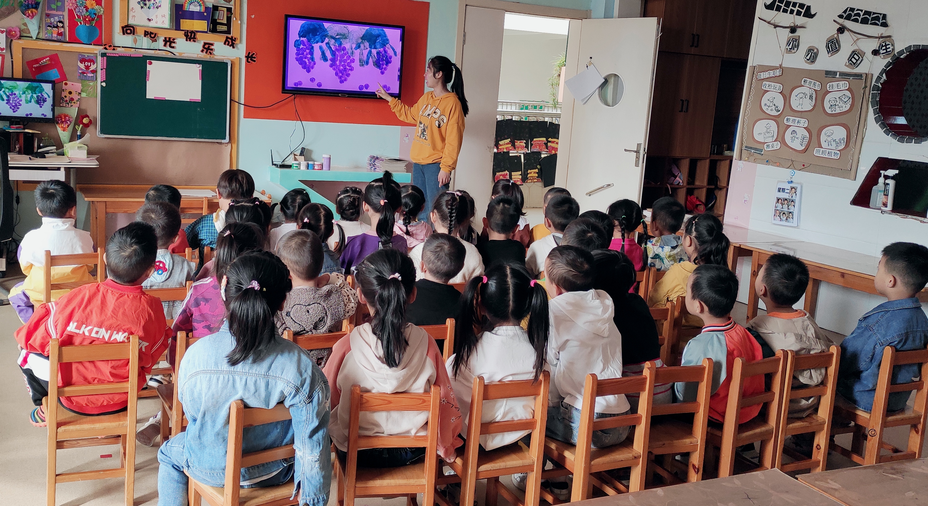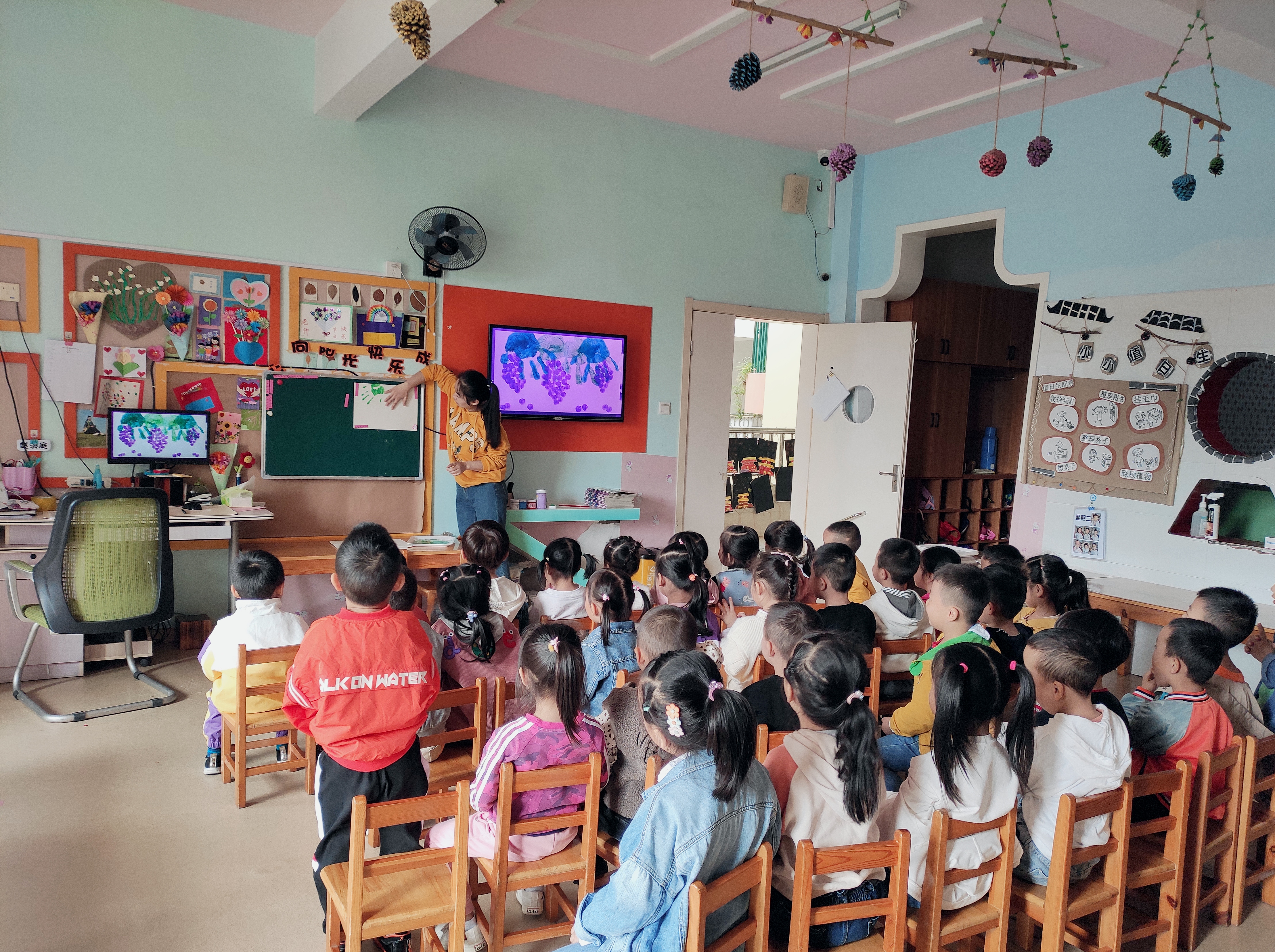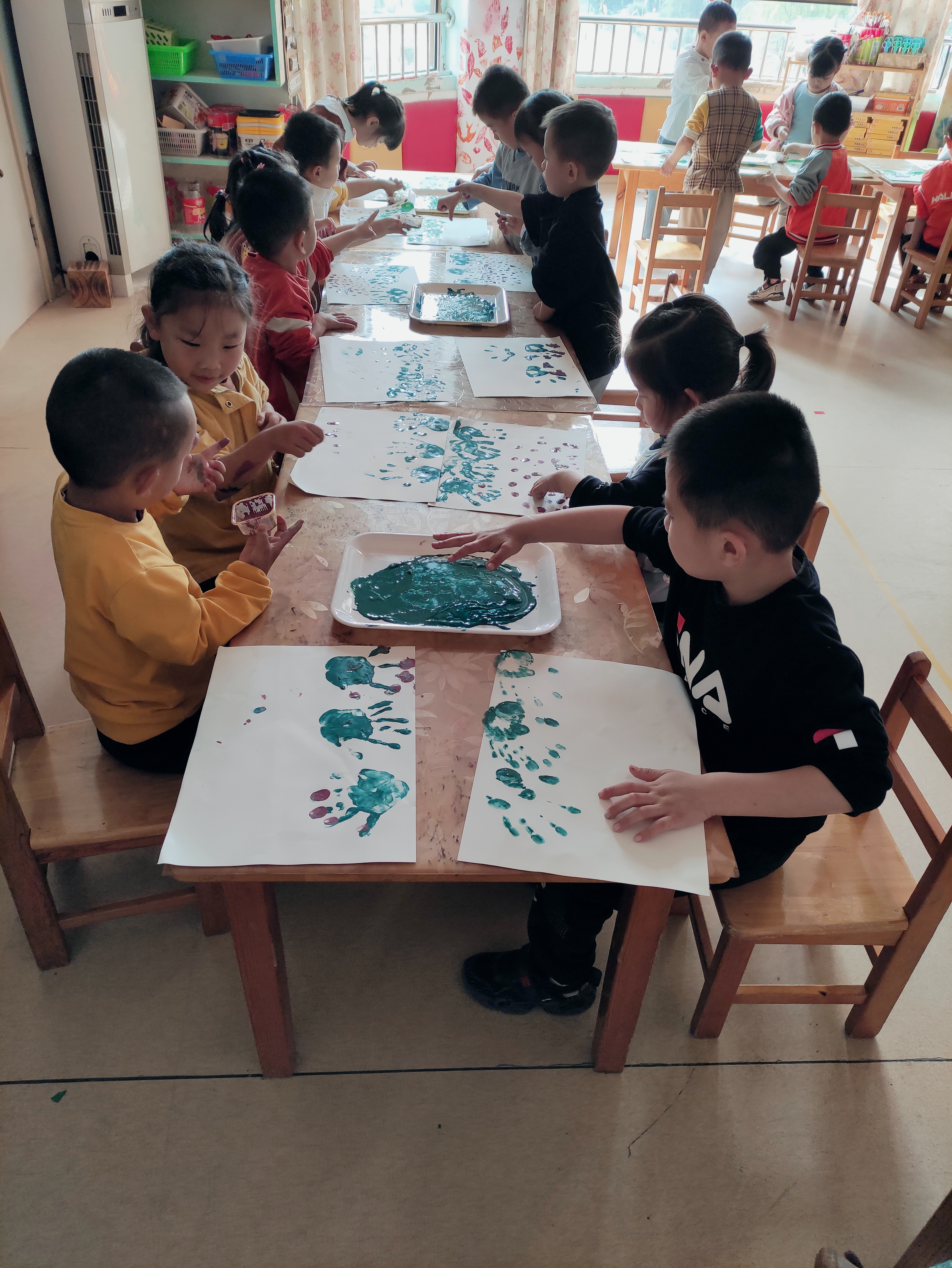 每个人的手指大小、形状、纹理都不一样,但平时小朋友们往往不太注意。本次美术活动:《串串葡萄 》通过看看、印印、想想,引导学生学注意观察身边的事物,师和幼儿讨论小手可以做哪些事情,发现我们的小手很灵活,能做很多事情,还可以用手来画画,平时,我们都是用手抓住笔来画画,今天,我们要用我们的小手来作画《串串葡萄 (手指印画)》。小朋友们一起观察教师的操作过程,学习手指压印的方法,表现出葡萄的外形及一串葡萄的形状,要求圆与圆之间既有空隙,又相互连接。美术活动中的手指印画活动可以锻炼幼儿手指的灵活性,提高幼儿对作品的欣赏能力。小朋友们对本次活动非常感兴趣,看看小朋友们都非常认真啊。 看,手指印葡萄,小朋友画得不亦乐乎呢 !手掌🤲印完绿色用洗干净,再用手指蘸紫色颜料点印葡萄。小朋友都能够掌握手指点画方法和遵守玩色规则。 |