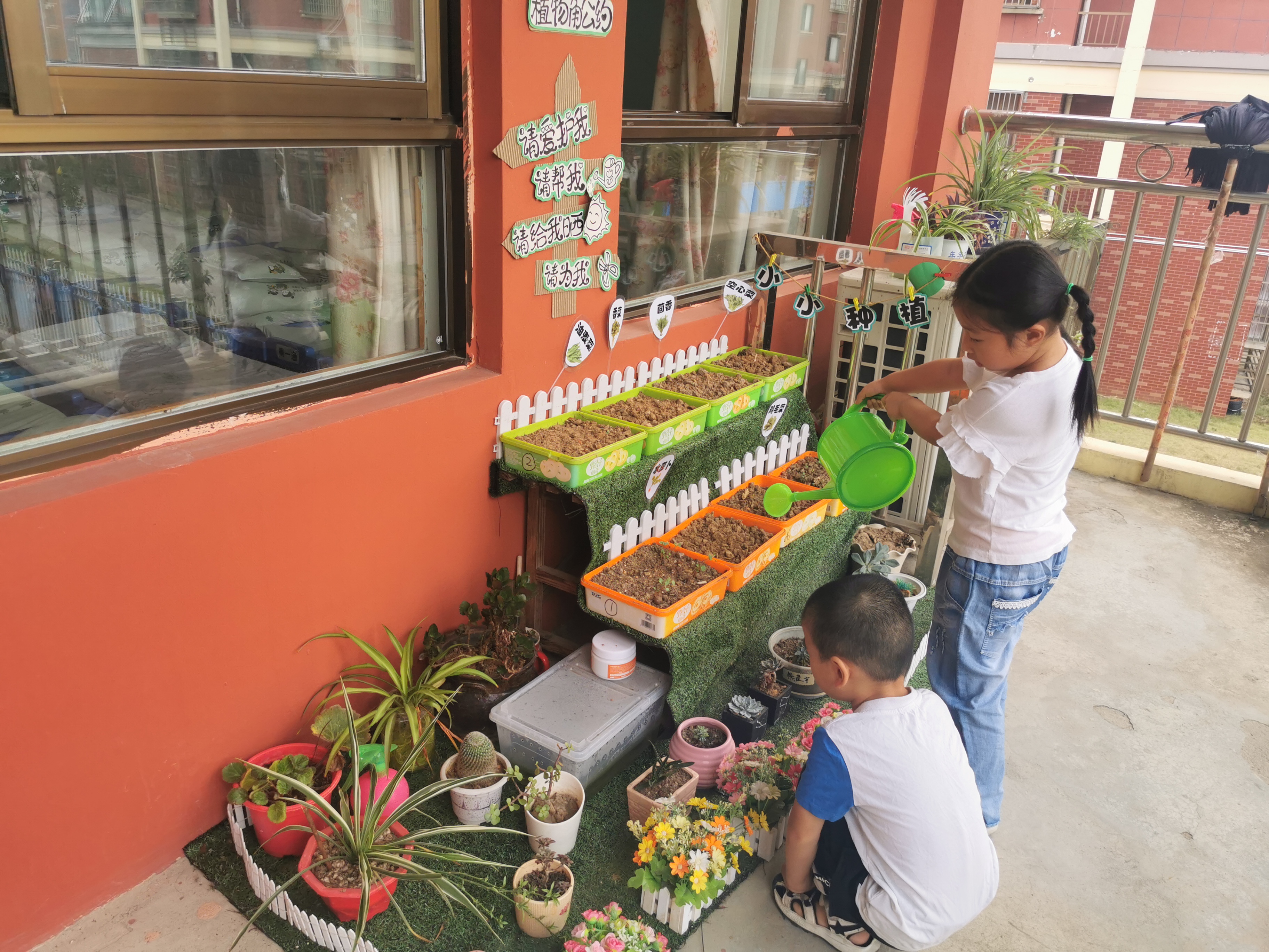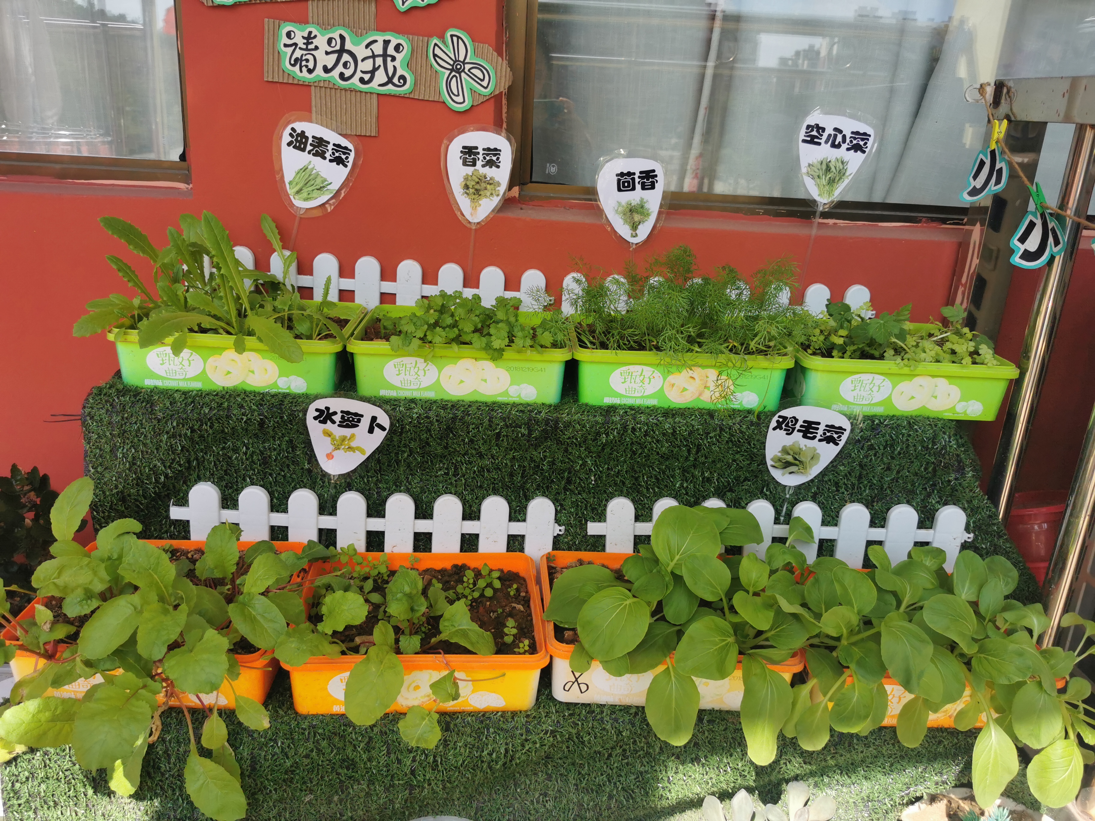 在我们班走廊的一个小小角落,我跟孩子们将小小的种子轻轻地洒下,孩子们每天精心照顾那些小小的生命,浇水、施肥、拔草,偶尔也会惊喜的发现小虫子。这是孩子们绿色的梦想,幸福从这里开始! 我们用自己的小手,搭建起一个属于孩子们自己的一片小菜园,孩子们在这小小的天地里感受劳动的过程、收获的喜悦,感知蔬菜的成长过程,让他们有一个直观、透彻的了解,更加珍惜大家的劳动成果。让幼儿通过自己的眼睛,自己的小手,发现世界的美丽。通过观察,启发幼儿大胆想象、相互讨论等手段,让幼儿了解了蔬菜,从而爱上蔬菜。 过了一段时间,我们收获了各种蔬菜,有青菜、油麦菜、香菜等等。萝卜也在孩子们辛苦的照料下茁壮成长。我们一起体验大丰收的喜悦。当孩子们中午吃到青菜的时候特别兴奋,他们很珍惜自己的劳动成果,都努力的做到吃饭不挑食。 通过小菜园展开系列主题活动:蔬菜大不同,蔬菜真好吃、荤菜素菜与蔬菜、有营养的菜、系列绘画活动等。通过活动,丰富了幼儿的知识。而在蔬菜种植、成长过程中,幼儿学会了用爱去关心、爱护别人,培养了孩子们保护花草树木的意识。整个过程中,孩子不仅享受了种植的乐趣,还直接观察和感受植物生长的过程,增长蔬菜和水果种植方面的知识。 |