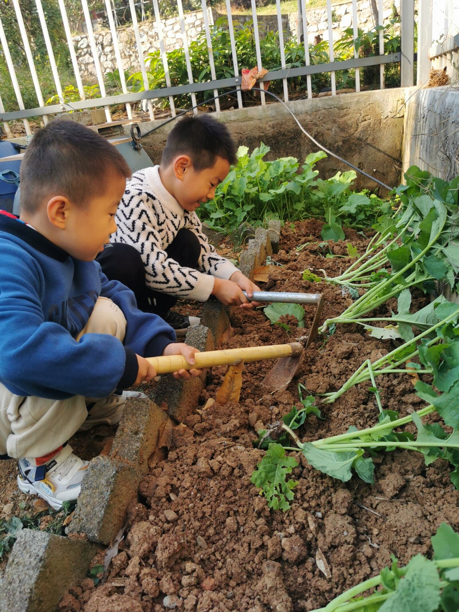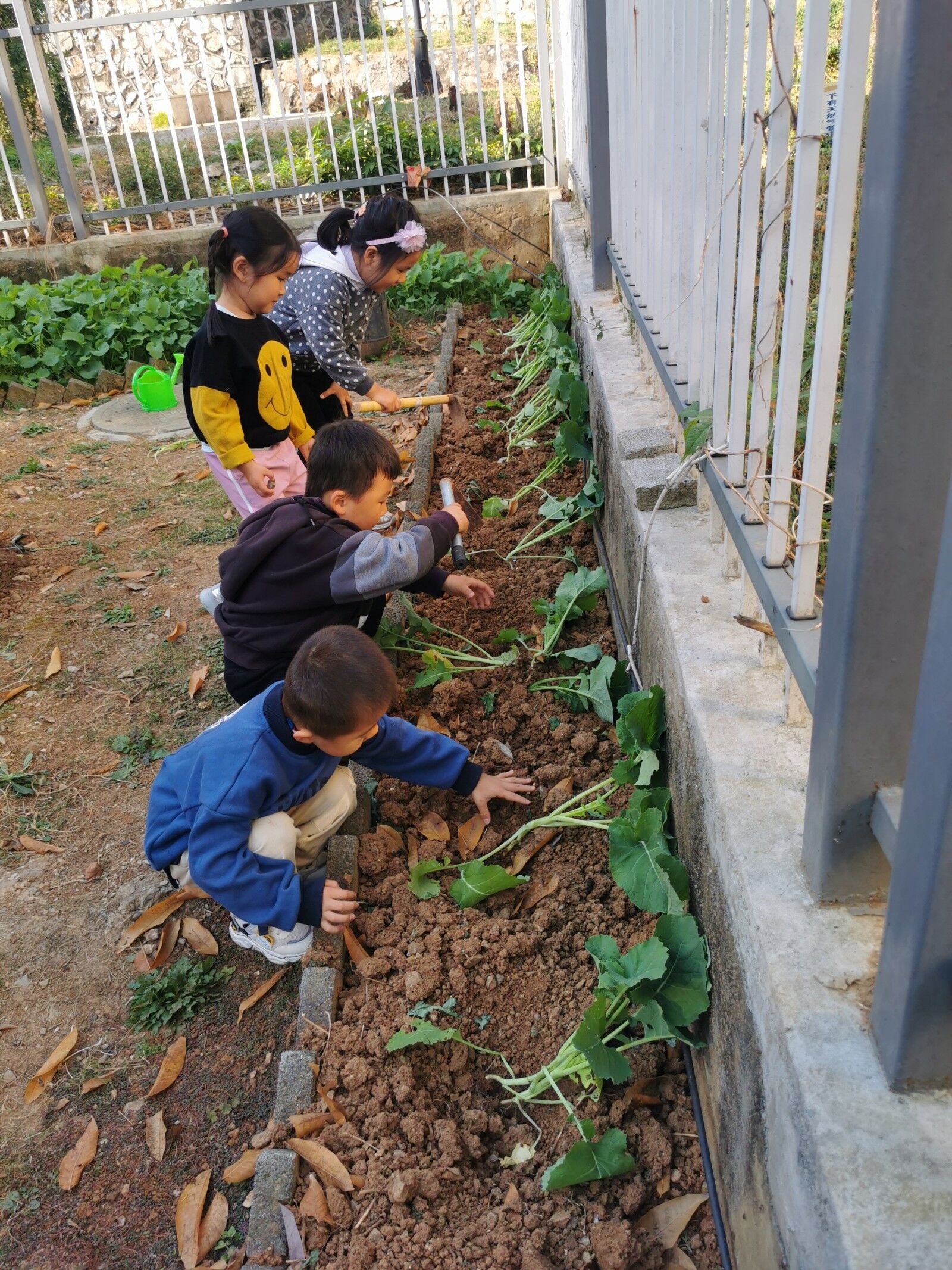 金秋时节,我们园里的小菜园依然一片欣欣向荣的景象,白菜、菠菜、萝卜都长势喜人!一次次的播种,一次次的收获,一年四季,种植园里的生命永远都是勃勃生机! 为使孩子们能够积极地与环境“对话”,主动参与种植的相关活动,亲身体验劳动的乐趣,感受美化环境的意义,增强每个幼儿“与自然和谐共处”以及珍惜粮食的意识。我们中班组开展了油菜的种植活动,让孩子们亲手种下一棵属于自己的油菜苗,从而让孩子们在活动中体验成功的喜悦,感受大自然的奇妙。 活动前,保安爷爷不畏辛苦,进行除草、翻地、挖坑等播种前的准备工作。小朋友们来到种植地,他们在老师的指导和帮助下认真地学着栽苗、浇水等,忙得不亦乐乎。小朋友们种下一棵棵油菜,也种下了一个个希望!