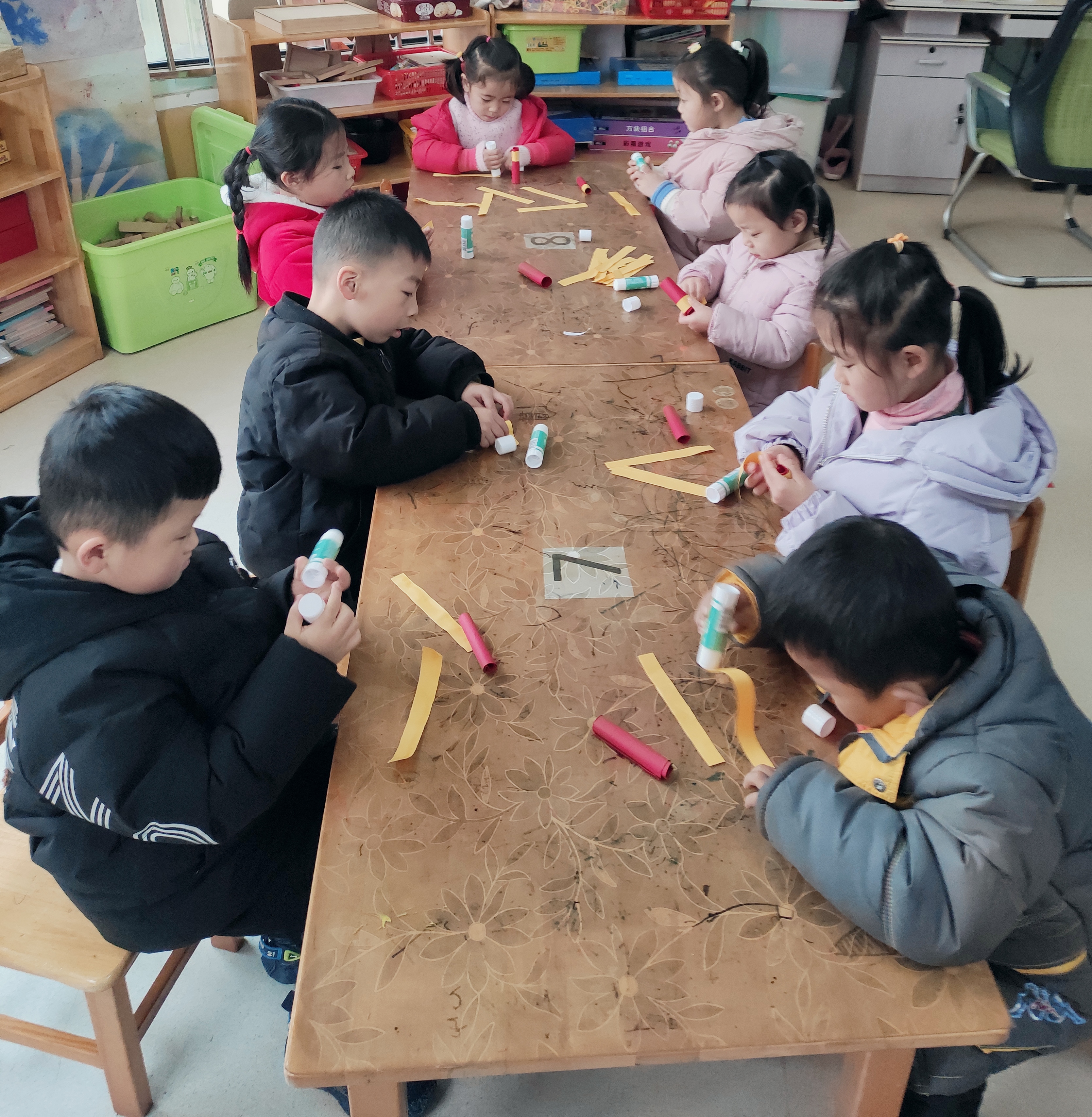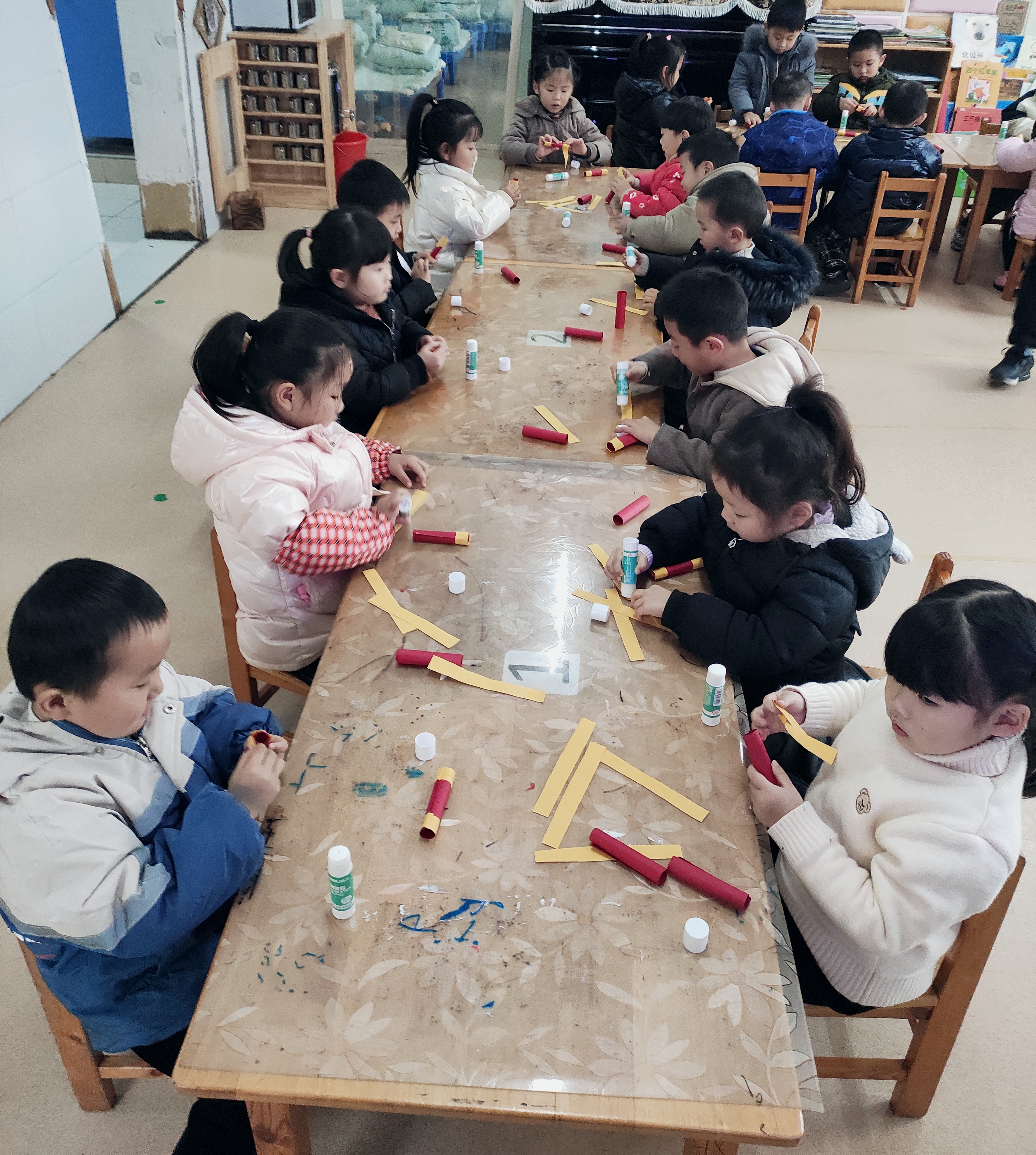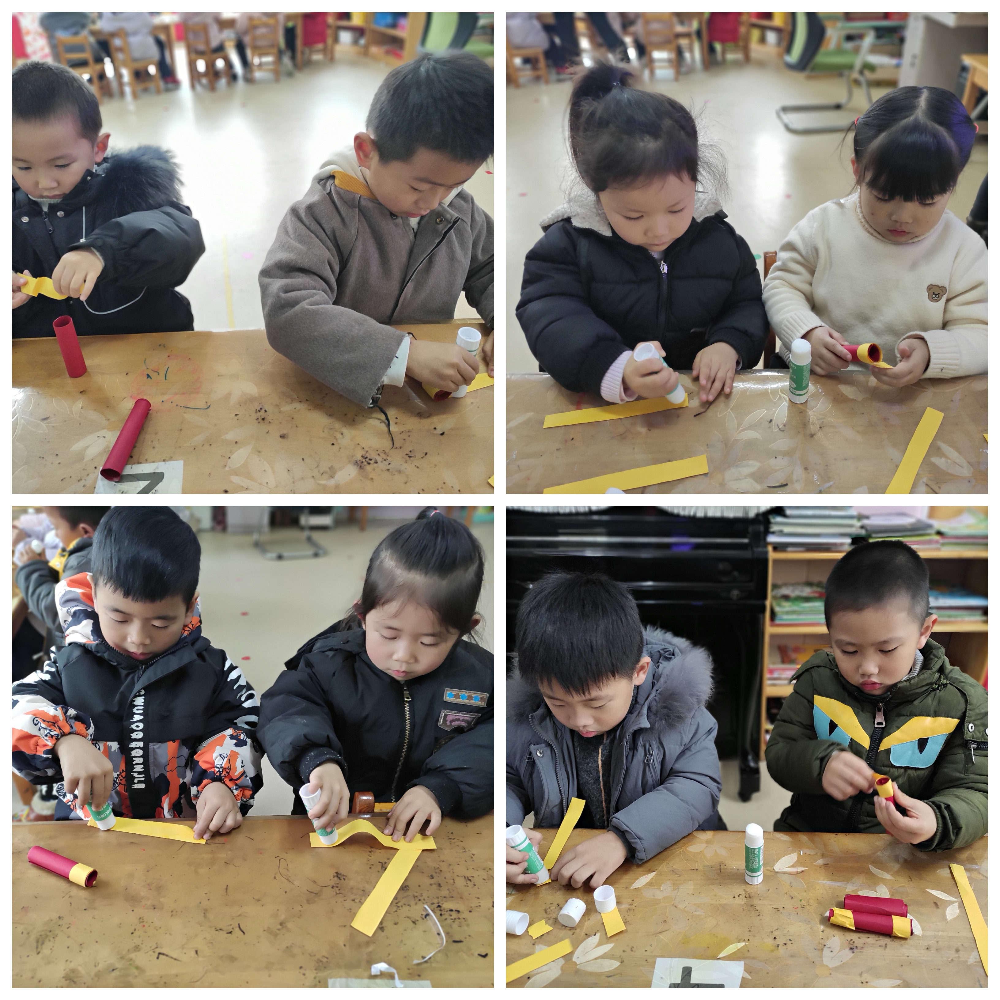 正值元旦、新年来临,家家户户都会放鞭炮,鞭炮起源至今有1000多年的历史。在没有火药和纸张时,古代人便用火烧竹子,使之爆裂发声,以驱逐瘟神。这当然是民俗传说,但却反映了古代中国人民渴求安泰的美好愿望。鞭炮说法上各个历史时期不同,称谓从爆竹、爆竿、炮仗和编炮一直到鞭炮。在现代,华人在传统节日、婚礼喜庆、各类庆典、庙会活动等场合几乎都会燃放鞭炮,孩子们在日常生活中对鞭炮已经有了一定的认识和了解。《纲要》 明确指出:“教师要引导幼儿接触周围环境和生活中美好的人、事、物,丰富他们的感性经验和审美情趣;指导幼儿利用身边的物品或废旧材料制作玩具、手工艺品等来美化自己的生活或开展其他活动。”而本次的教学活动中的鞭炮正是幼儿身边所熟悉的,在活动中,幼儿通过观察、讲解分析,初步了解鞭炮的外形特征,并学习用卷一卷、粘一粘的方法制作鞭炮,体验过年的快乐。 活动过程中引导幼儿观察鞭炮的外表特征;一串串的,鞭炮长长的,它是由炮筒和导火线组成的,炮筒密密的靠在一起,连接在导火线上,像小朋友站队一样,一个一个排的非常整齐,只要一点火在最下面的那颗鞭炮,它们就会一个跟一个地发出响声。接着小朋友们探索制作炮筒的方法:“脱掉白衣服,两手卷-卷,用力粘粘紧,鞭炮完成了。”课堂结合节日课程和幼儿已有生活经验,气氛活跃。先通过观察图片初步了解鞭炮的构造,再实际观察,让孩子尝试个别操作,最后单独操作,循序渐进,最后加入音乐,让孩子们一起挂鞭炮,感受中华传统节日的气氛。