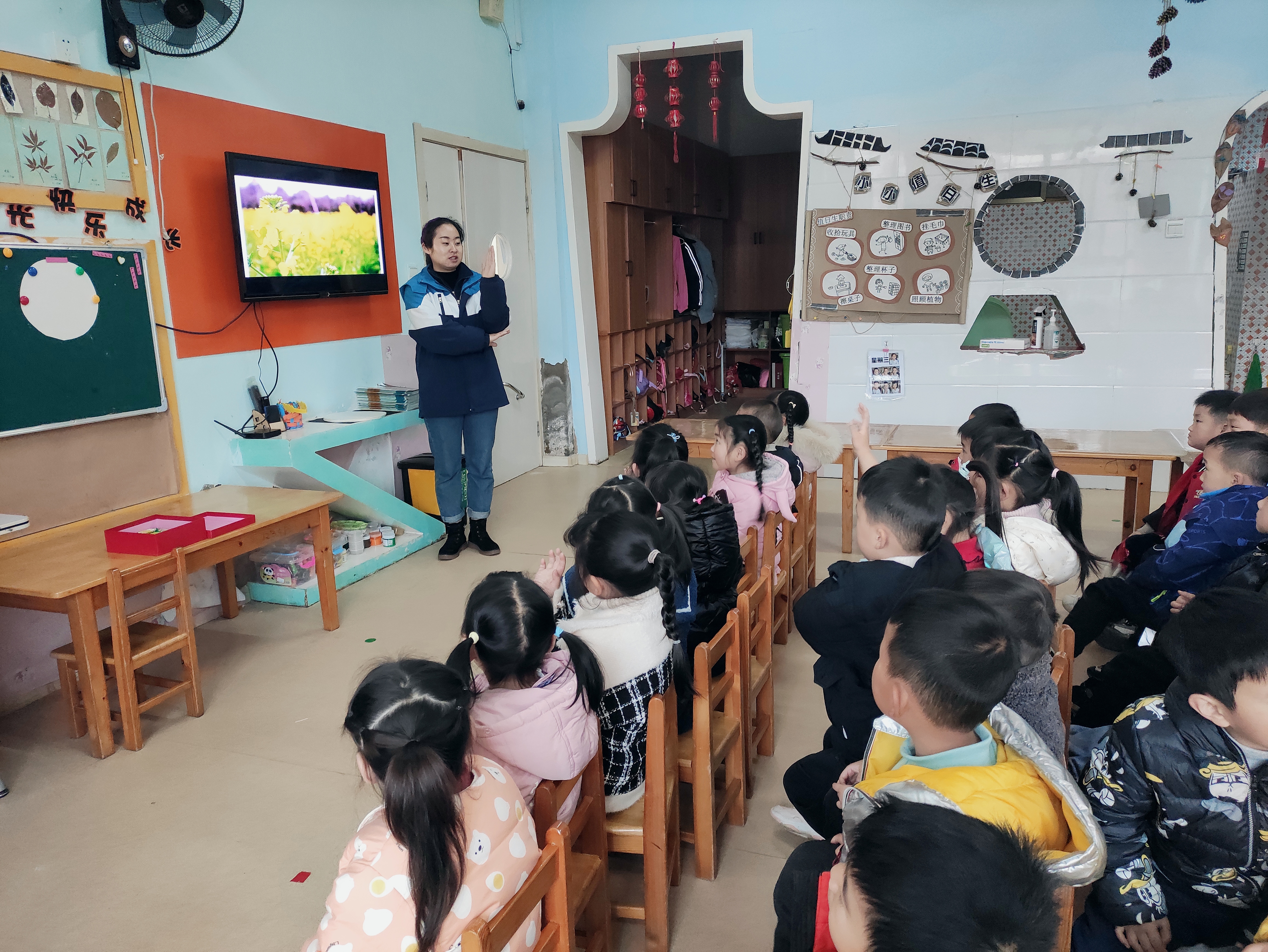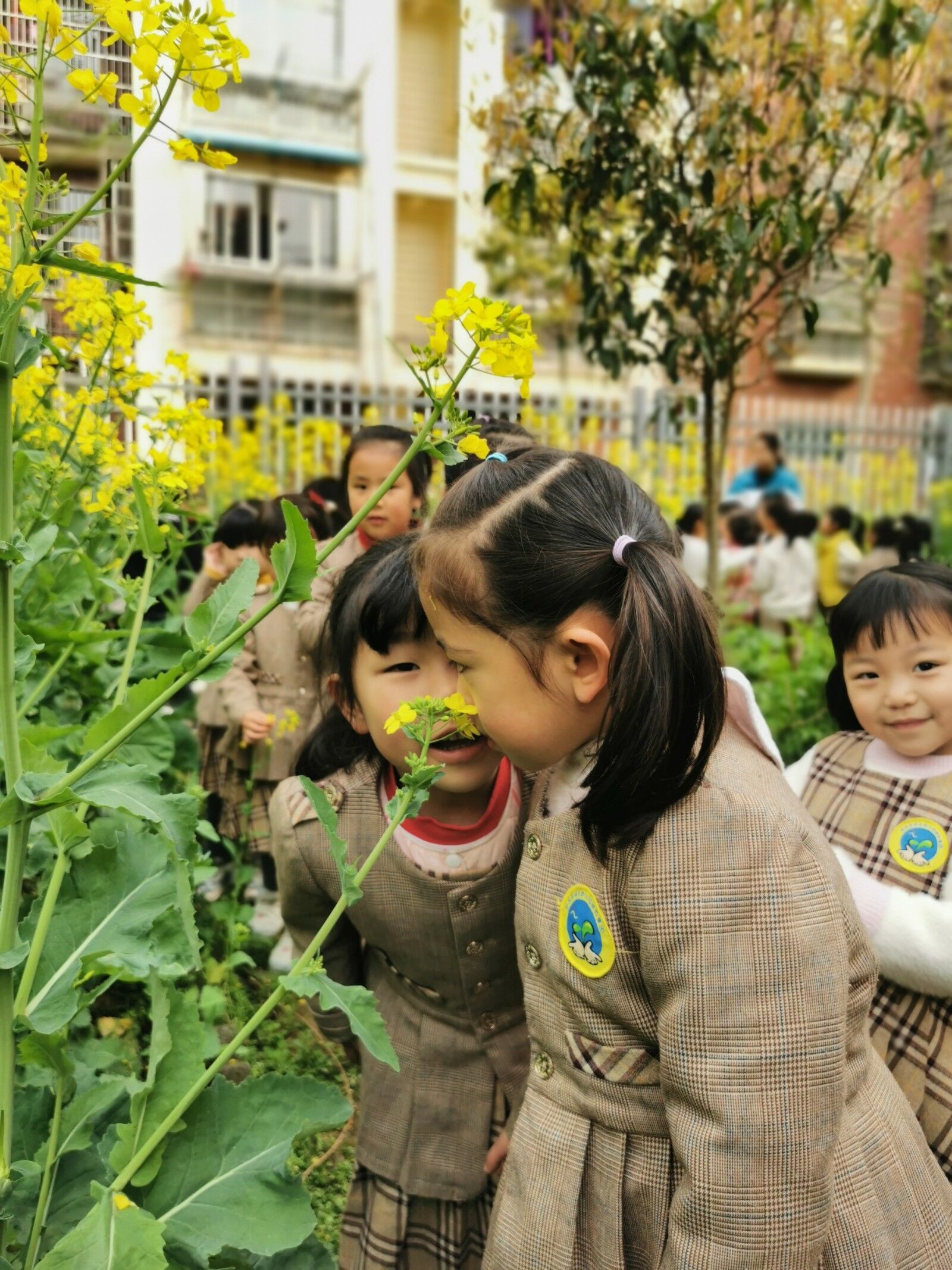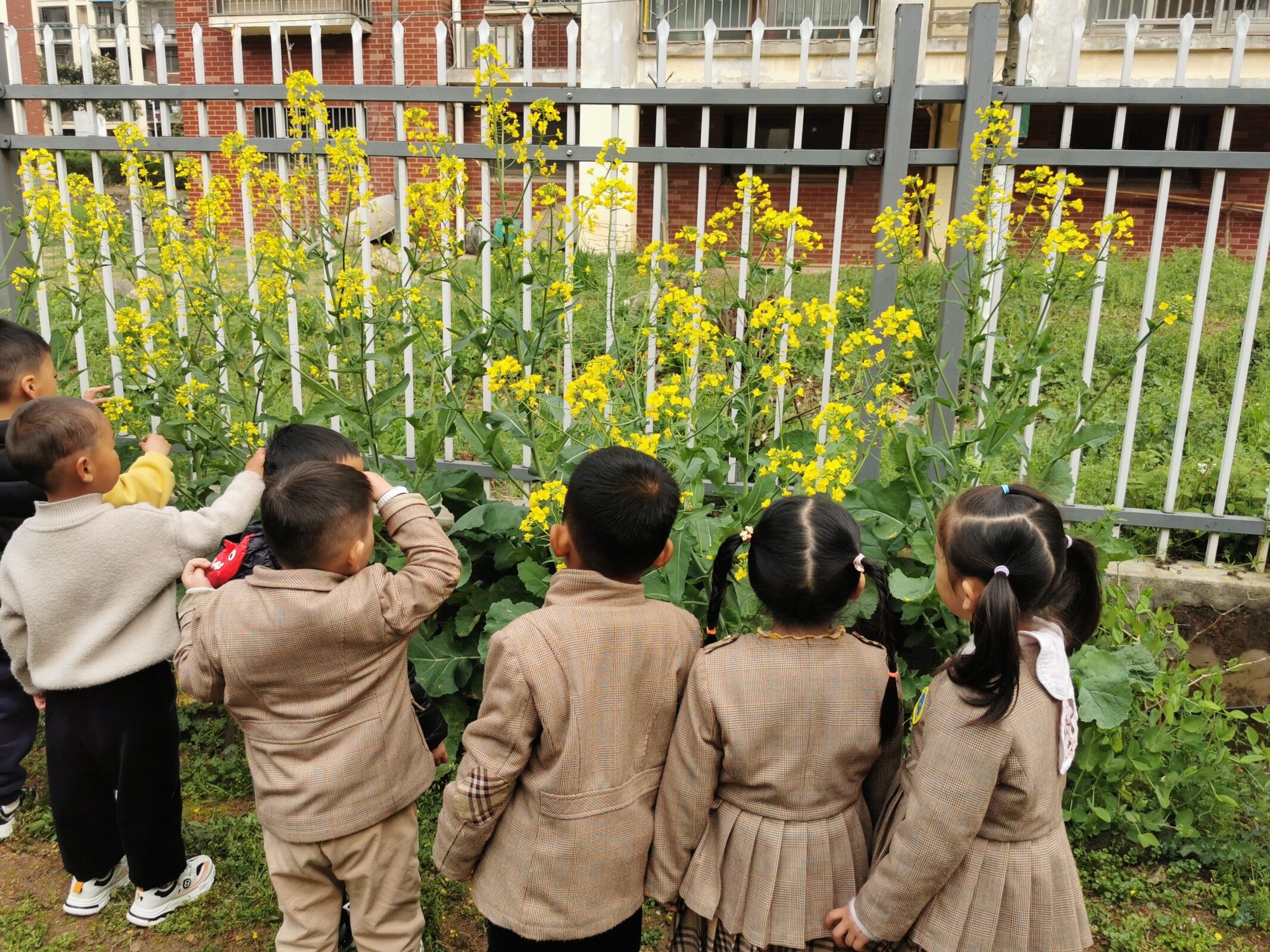 春天来了,百花盛开,万物复苏。油菜花开出金灿灿的花儿,美丽的身姿在春风中摇曳。中班的小朋友们和老师一起来到学校的种植园看油菜花。 一、认一认油菜花: 苏霍姆林斯基说过:语言是智力发展的基础,也是所有知识的宝库。孩子认识世界、吸取知识、扩大眼界,都要家长在平时的生活中加以正确引导。 提问:闻一闻:什么味道? 摸一摸:什么感觉? 看一看:油菜花长什么样子呢? 1.整体观察: 油菜花的身体是由哪些部分组成?分别是什么颜色? 2.细节观察:花的组成,数一数花瓣有几片?