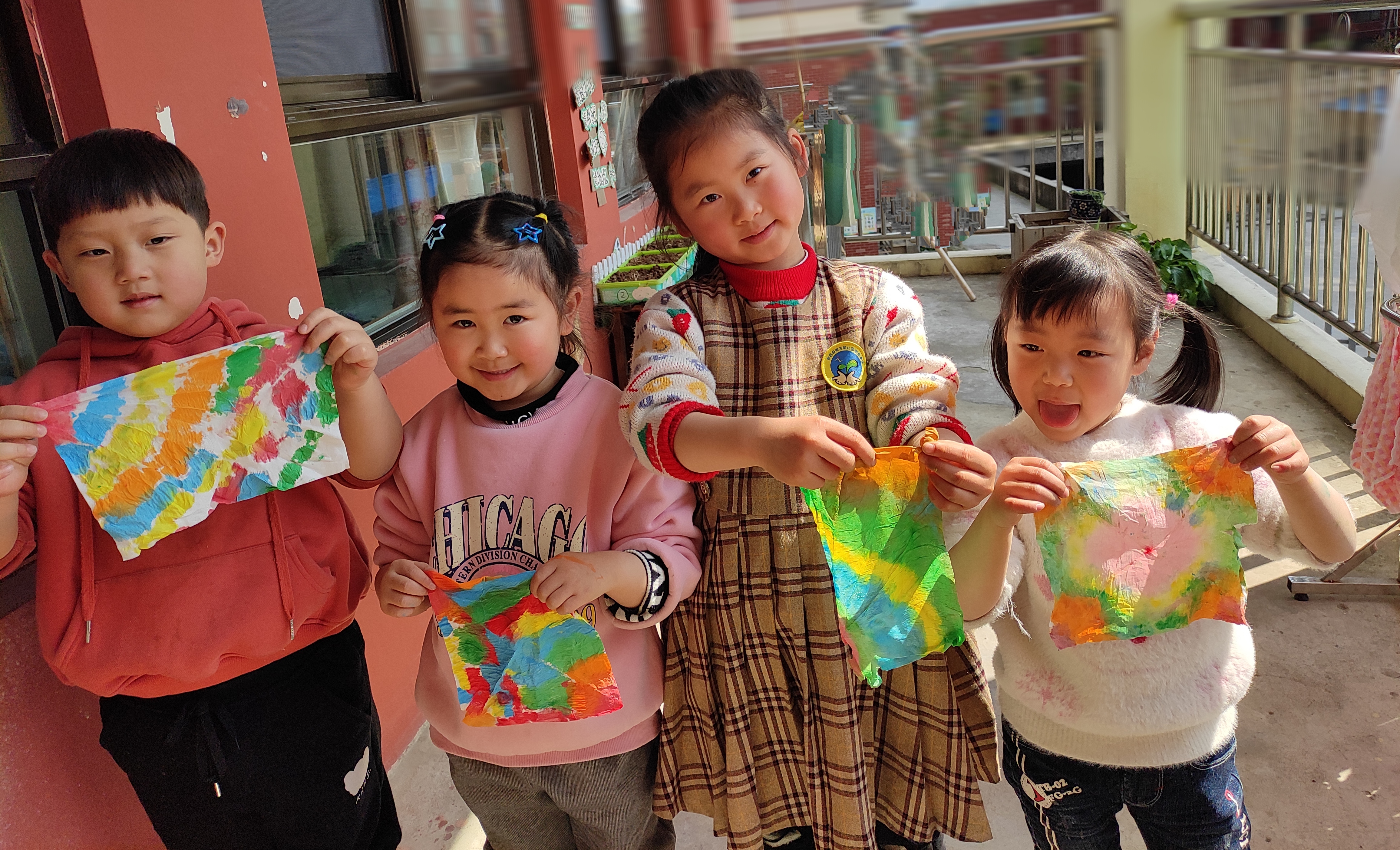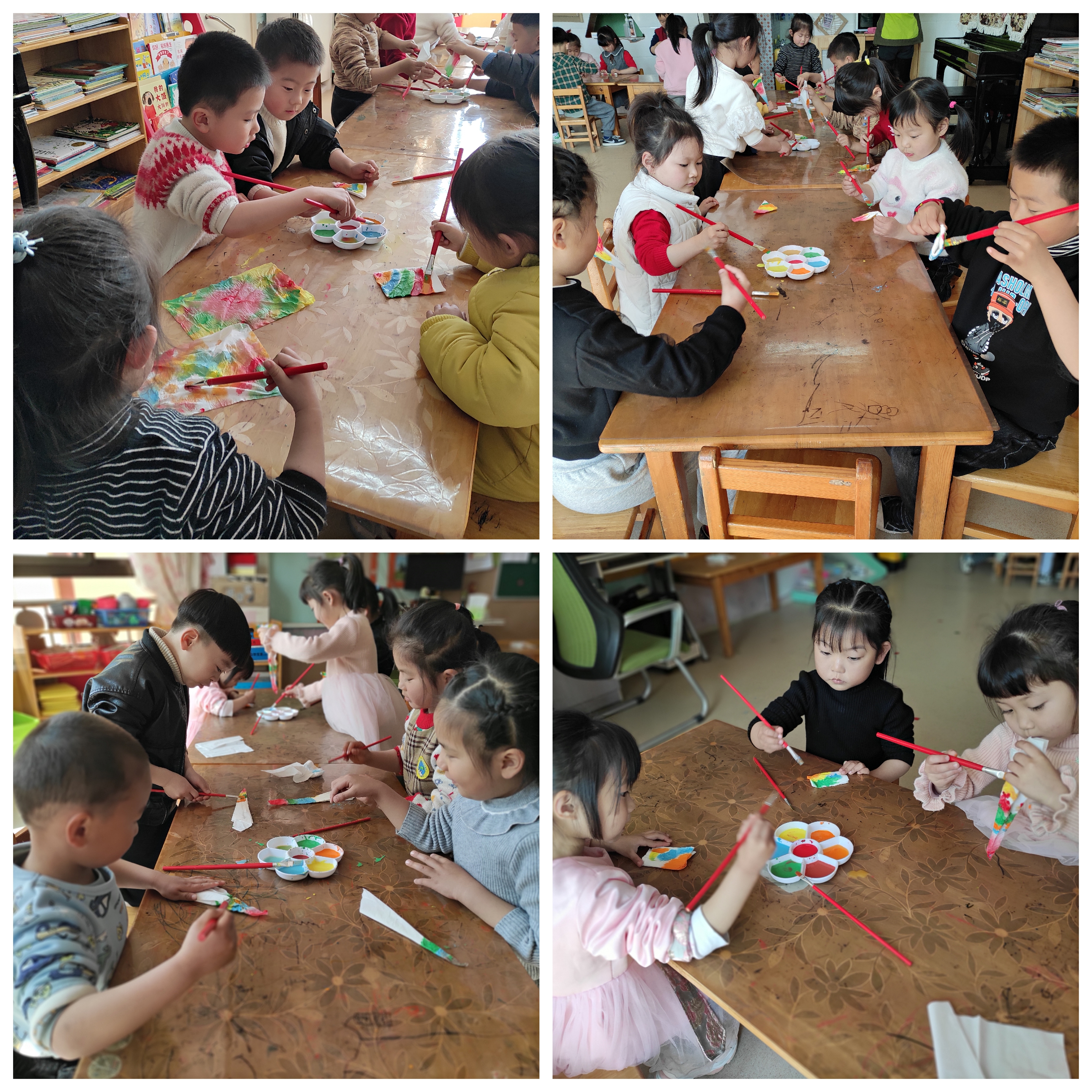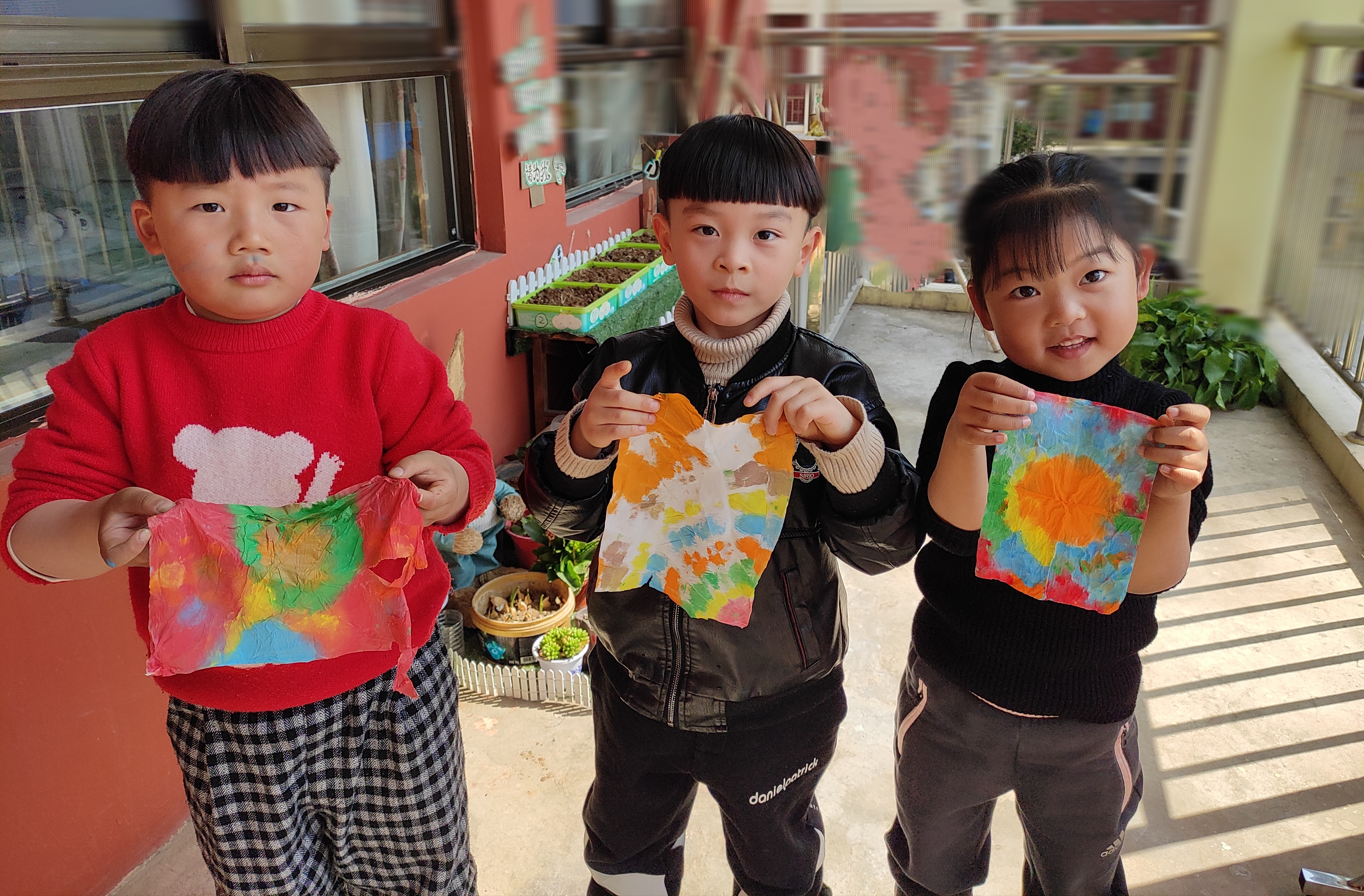 “丢手绢,丢手绢,轻轻地放在小朋友的后面,大家不要告诉他,快点儿快点儿抓住他,快点儿快点儿抓住他……”小朋友们还记得伙伴们玩丢手绢游戏时的儿歌吗?手绢也叫手帕,小朋友们的手帕都是什么样子的呢?今天我们小朋友利用染纸的方法来制作漂亮的手帕啦. “染纸”是中国传统的一种民间美术,由于其艳丽、随意,操作简单而受到人们的喜爱。染纸是将吸水纸经过剪、折、叠、卷、揉皱等方法进行加工,并通过点、浸等方法上色而形成纹样的一种美术创作方法,极富童趣和创造性,因其变化无穷,极能激发幼儿的好奇心和探究欲,吸引幼儿不断的动手动脑,大胆尝试,体会其中颜色和图案的变化万千。每一次尝试都会有不同的惊喜,它操作方便,色彩鲜艳,纹样千变万化,可以产生许多意想不到的效果!一起来跟我们看看吧! 首先进行颜料的调色,然后就开始操作啦!瞧!我们采用了浸染和点染的方法!