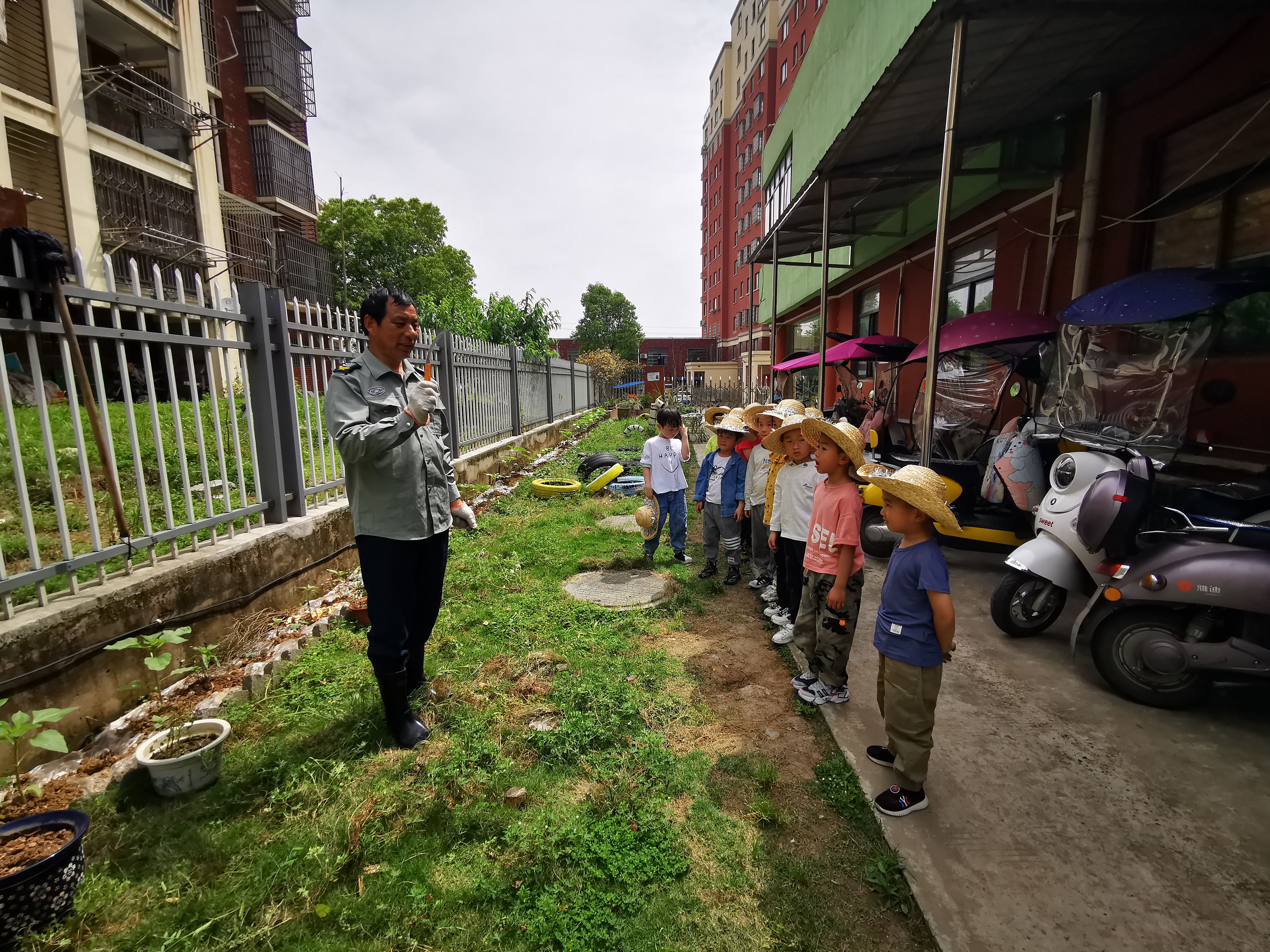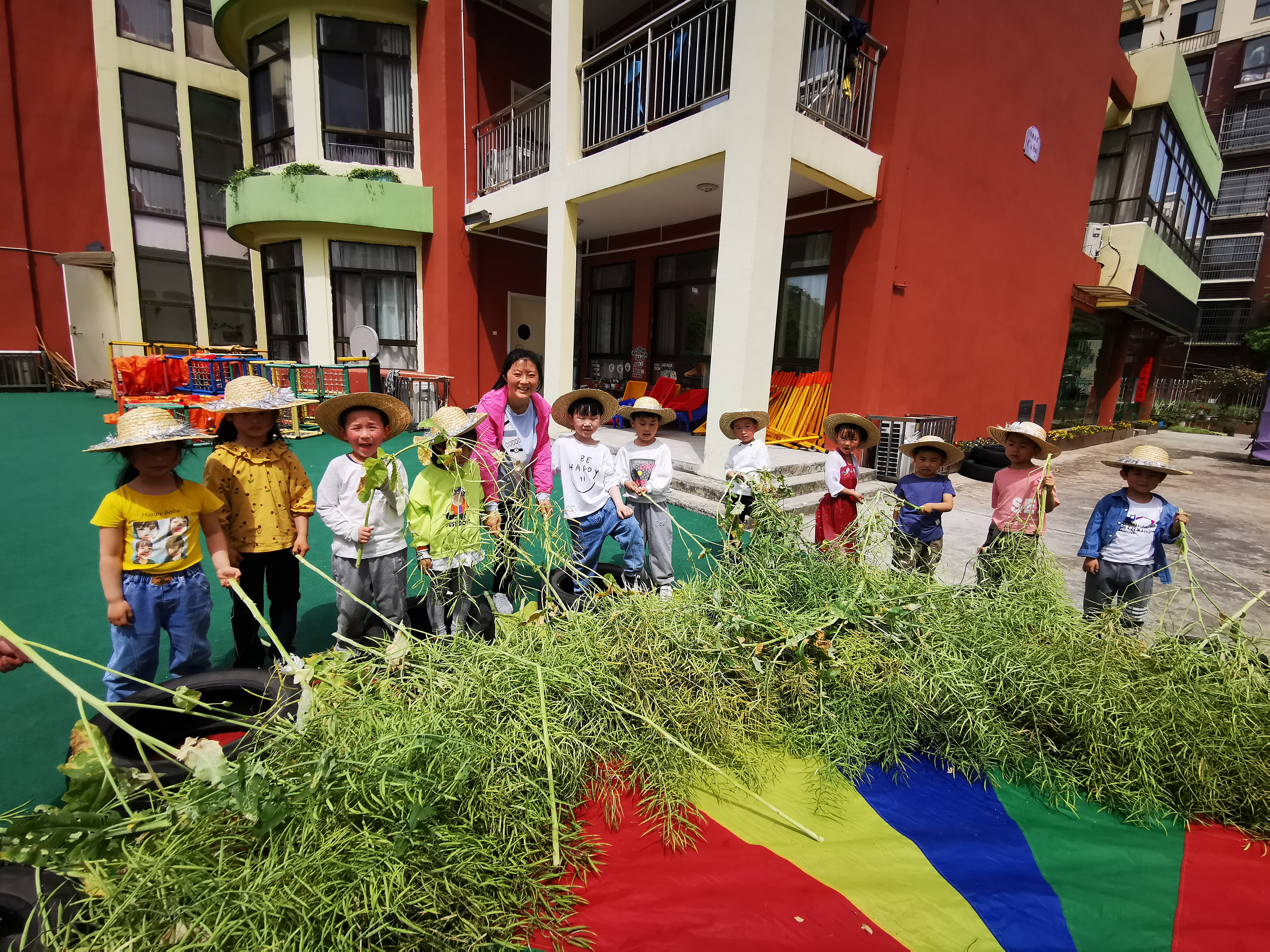 今天,门卫蔡爷爷告诉我们油菜可以收割了,先来认识一下收割工具吧——镰刀,我问孩子们:“你们在哪里见过镰刀?”小水说:“党旗上有镰刀的图案。”棒极了!!!开始劳动了,孩子们戴上草帽,开始把蔡爷爷割倒的油菜运到我们铺好的彩虹伞上,因为蔡爷爷说割倒的油菜要晒上好几天才能把菜籽打出来。人多力量大,不一会儿,油菜的秸秆就乖乖的躺在彩虹伞上晒太阳了!让我们再等两天吧!