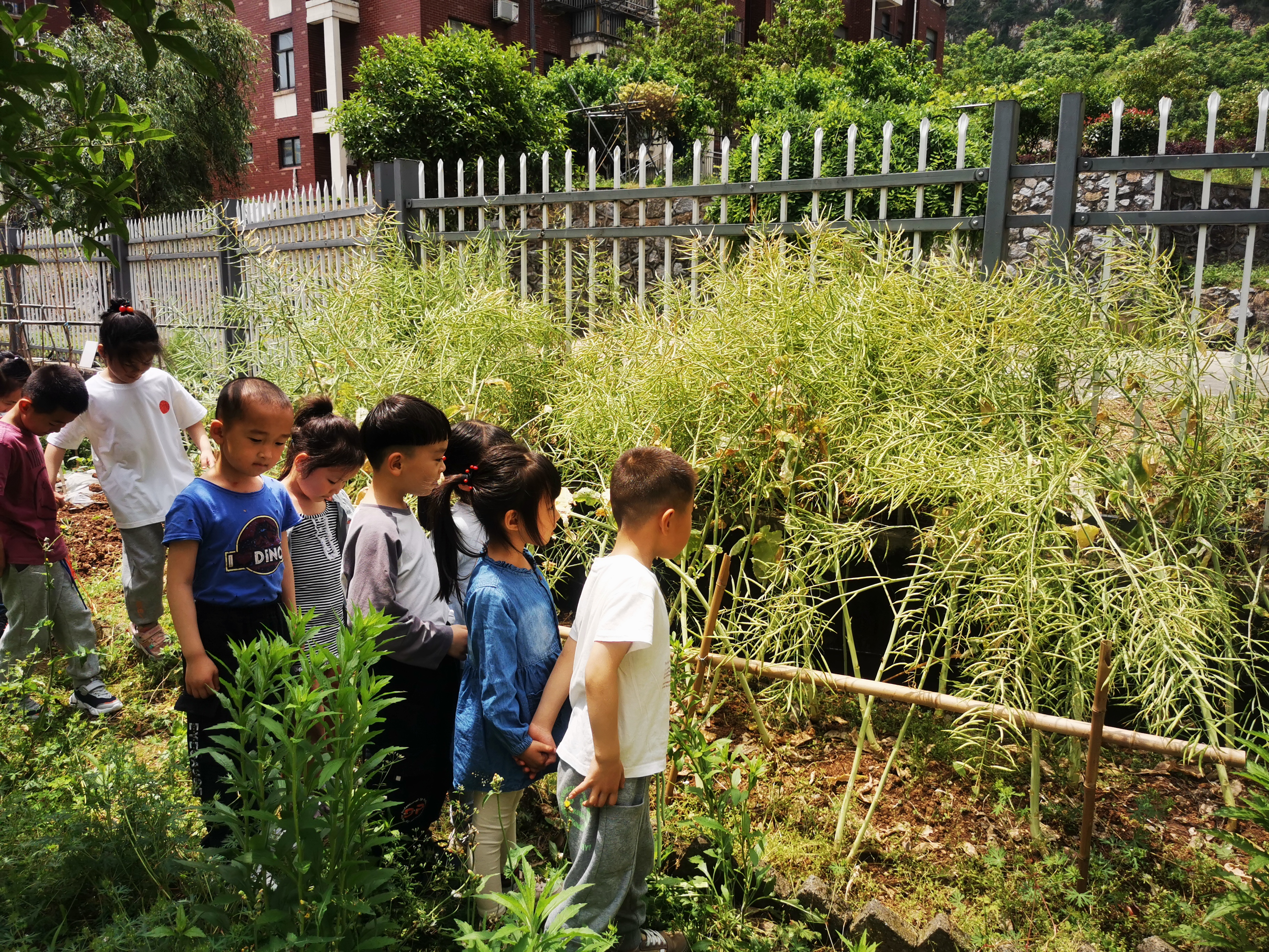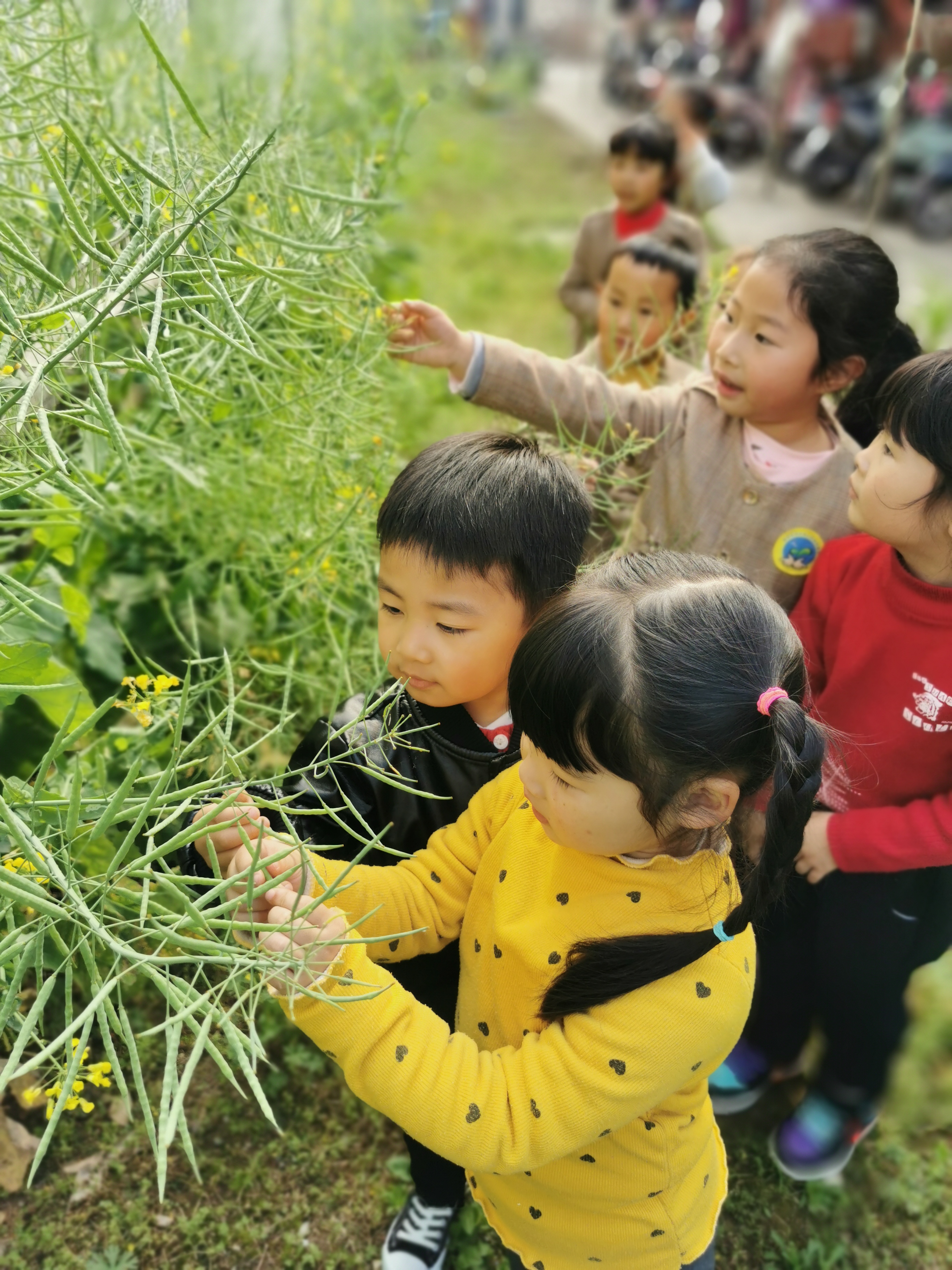 每天午饭后我们都会散步到小菜园,观察油菜的长势情况。在这个过程中,孩子们知道了,油菜花有四个花瓣;看到了辛勤的小蜜蜂是怎样采花蜜的;了解了油菜花的花期很长,大概有二十多天;从开花到油菜籽成熟大概要两个月,等等......