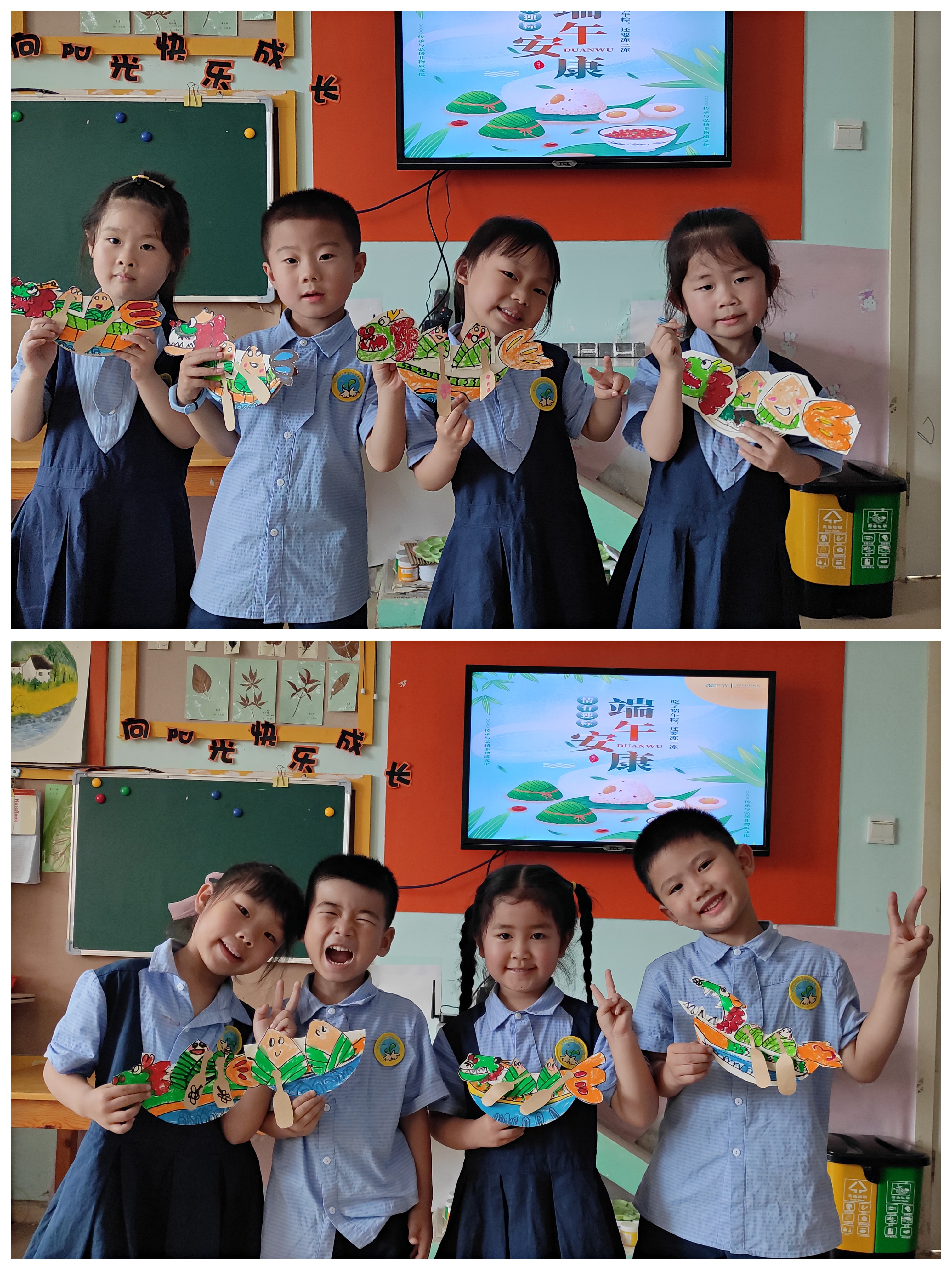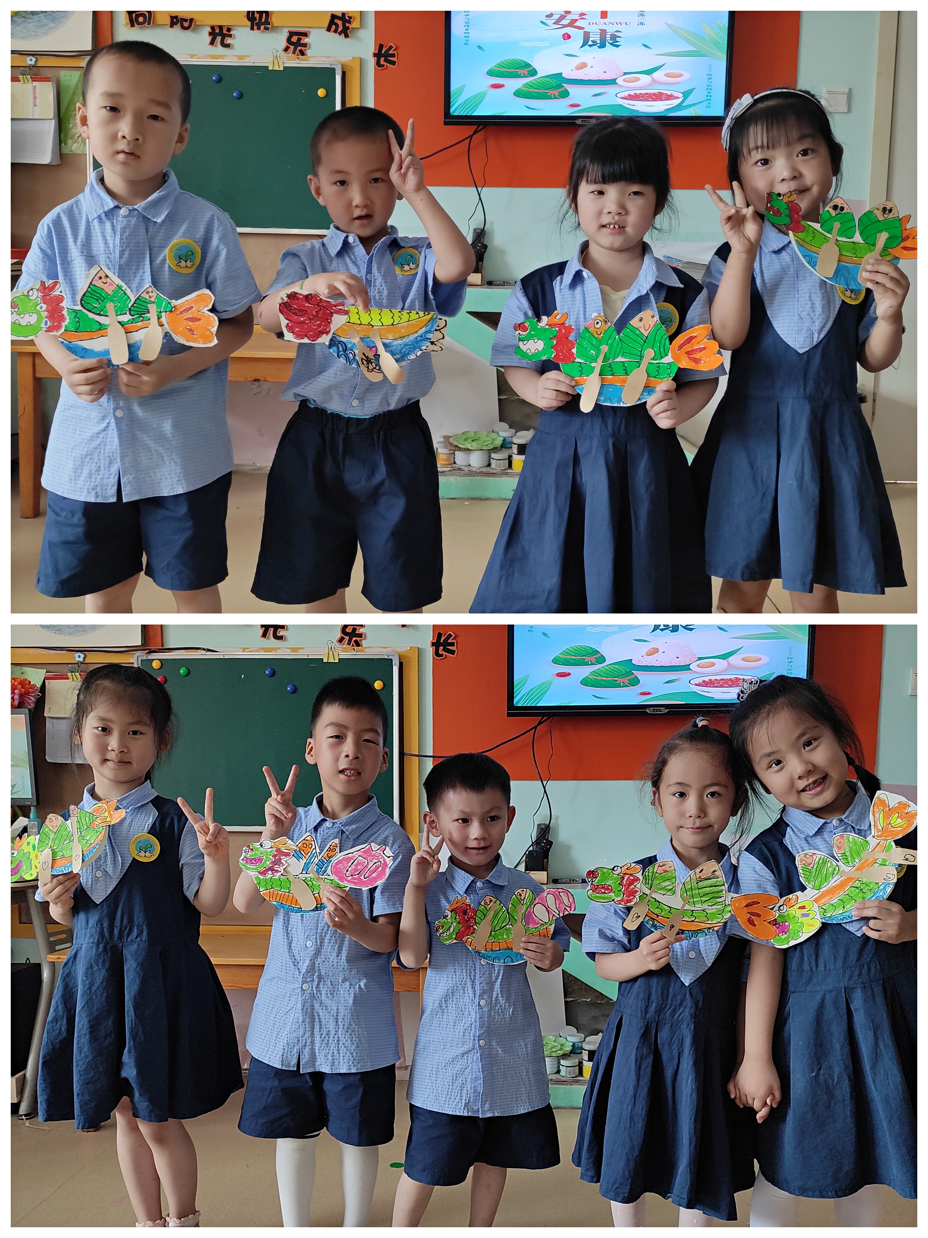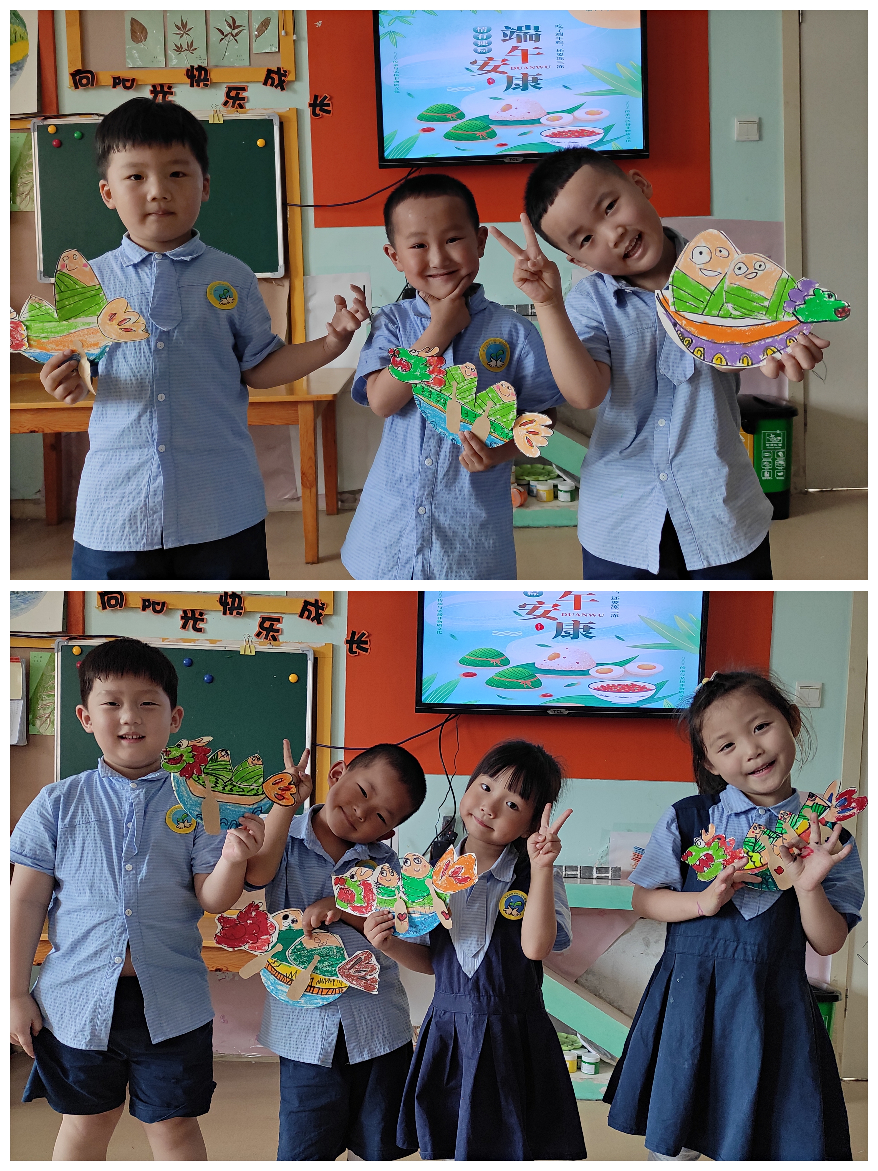 孩子们还在老师的引导下,动手做起了端午节小手工。折一折、画一画、剪一剪、贴一贴,不一会儿,形态各异的粽子和龙舟就做好了。看着自己亲手做出来的小粽子和小龙舟,孩子们个个成就感十足!