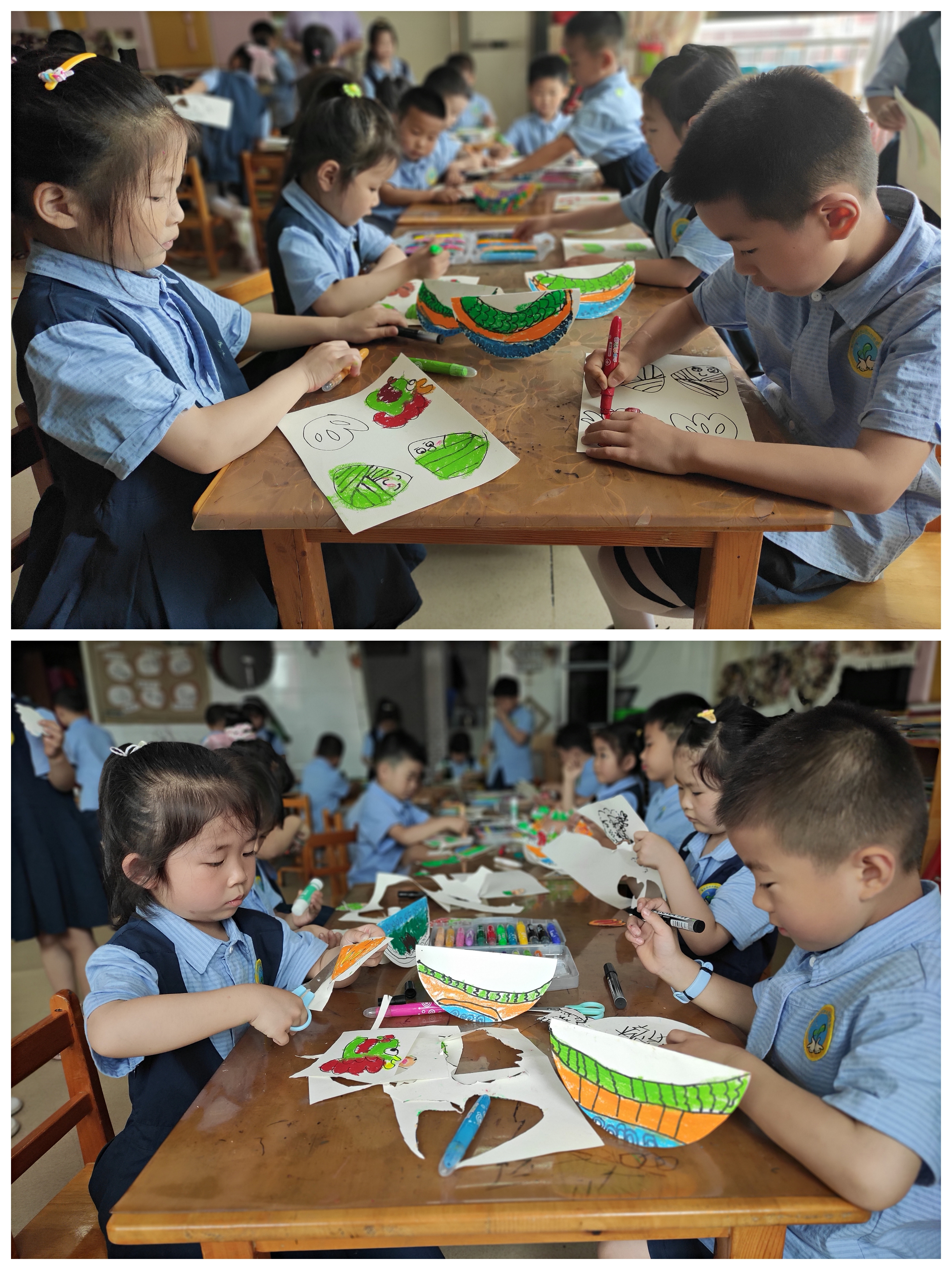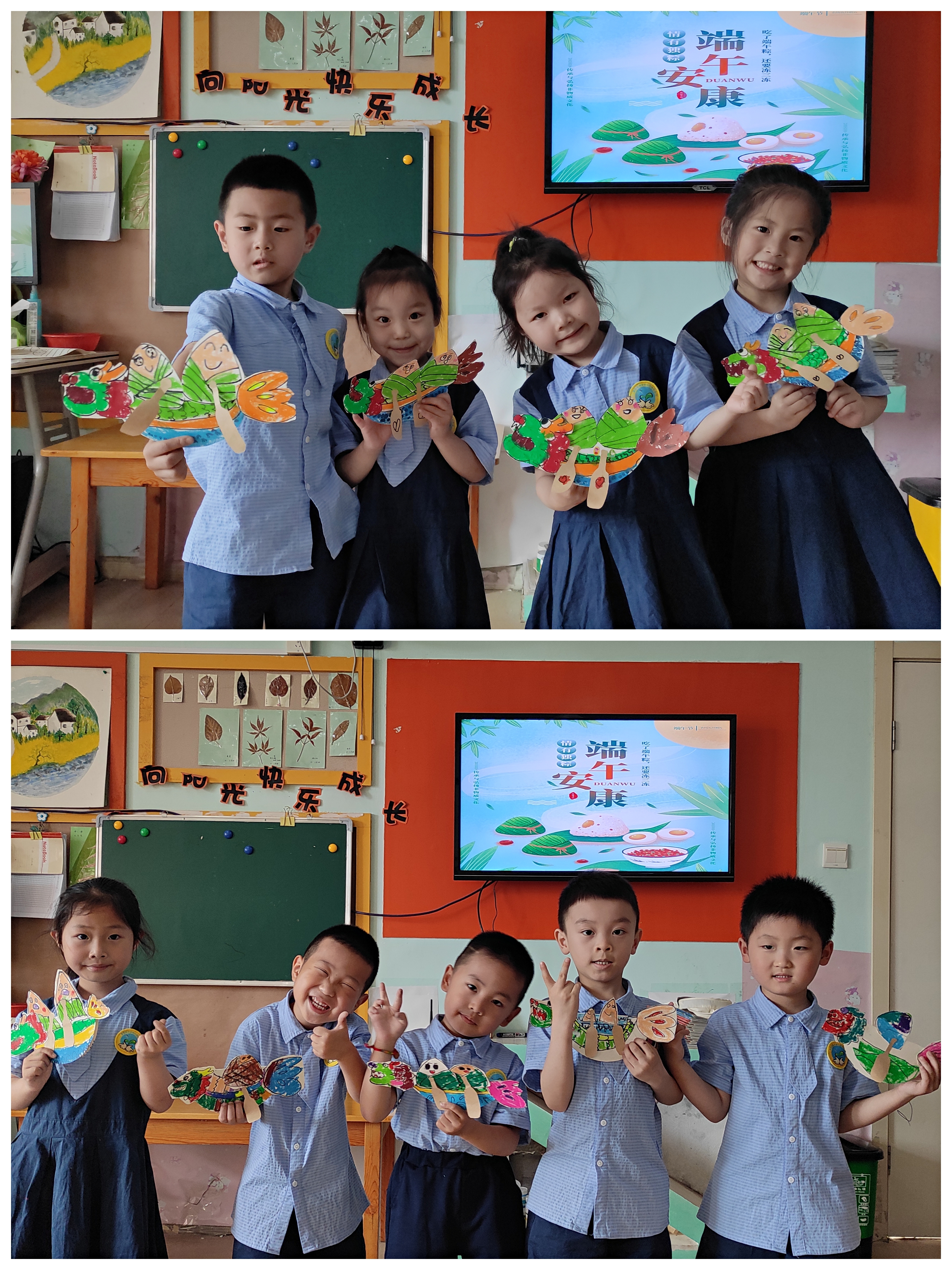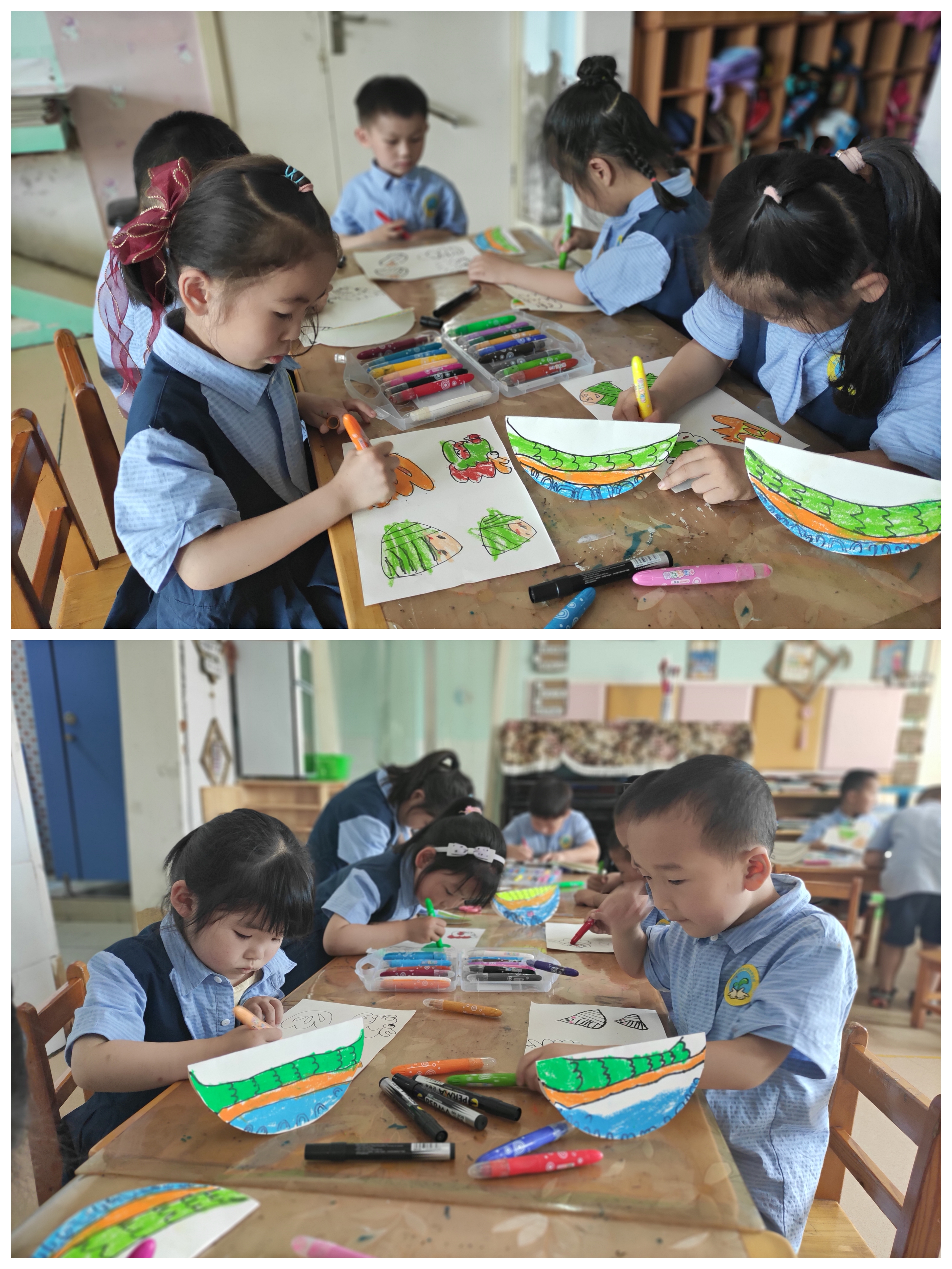 孩子们还在老师的引导下,动手做起了端午节小手工。折一折、画一画、剪一剪、贴一贴,不一会儿,形态各异的粽子和龙舟就做好了。看着自己亲手做出来的小粽子和小龙舟,孩子们个个成就感十足!
