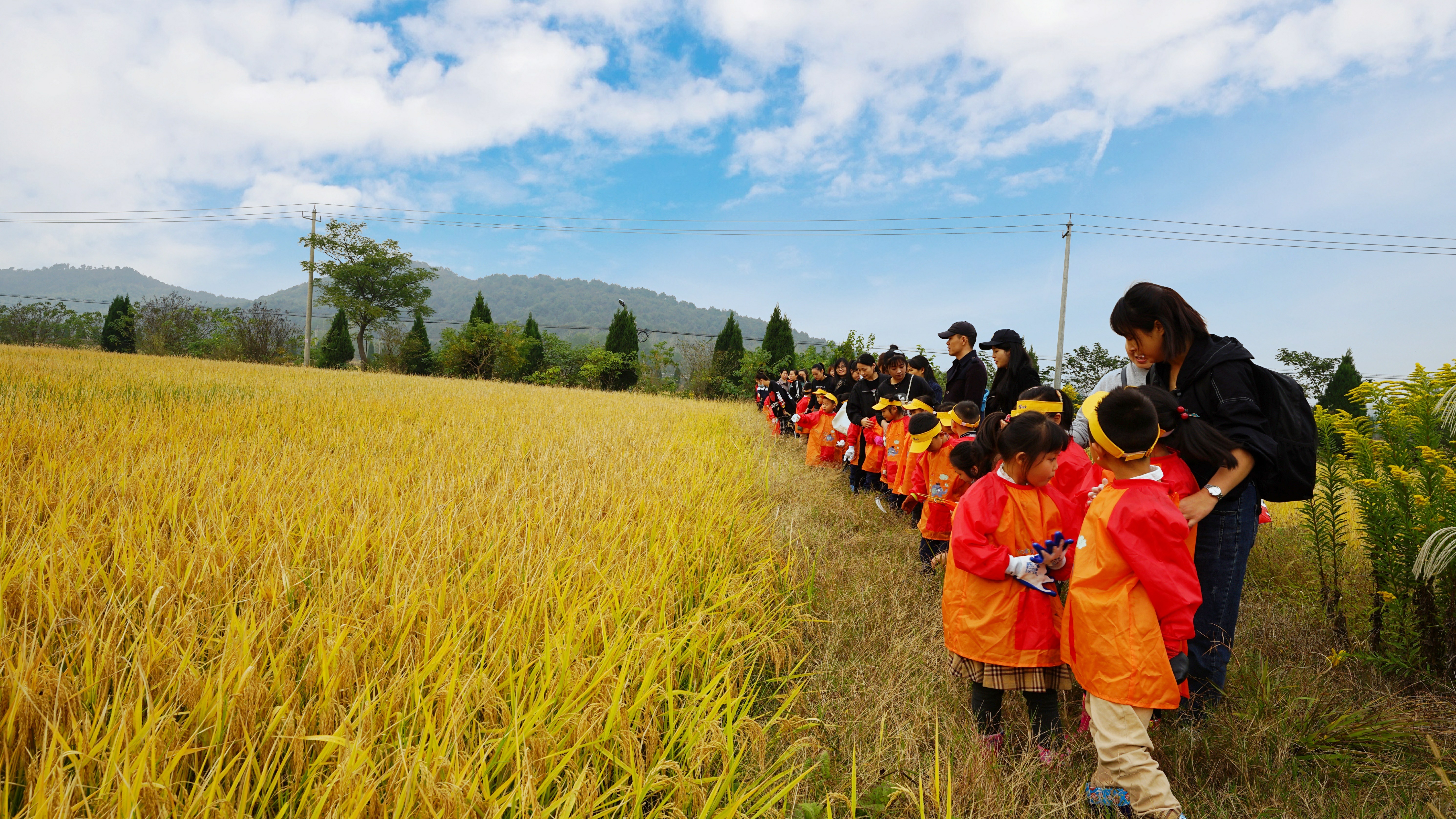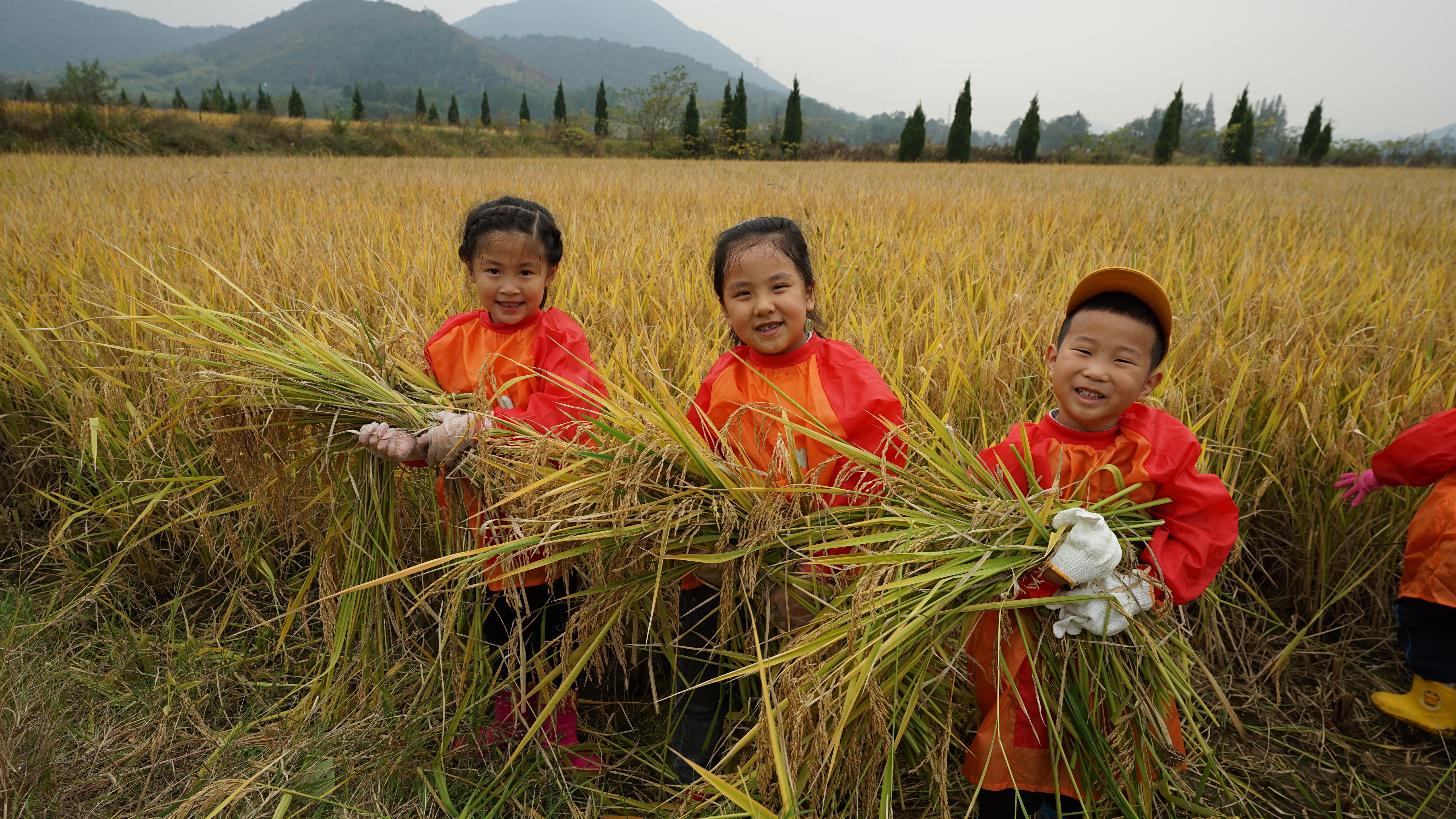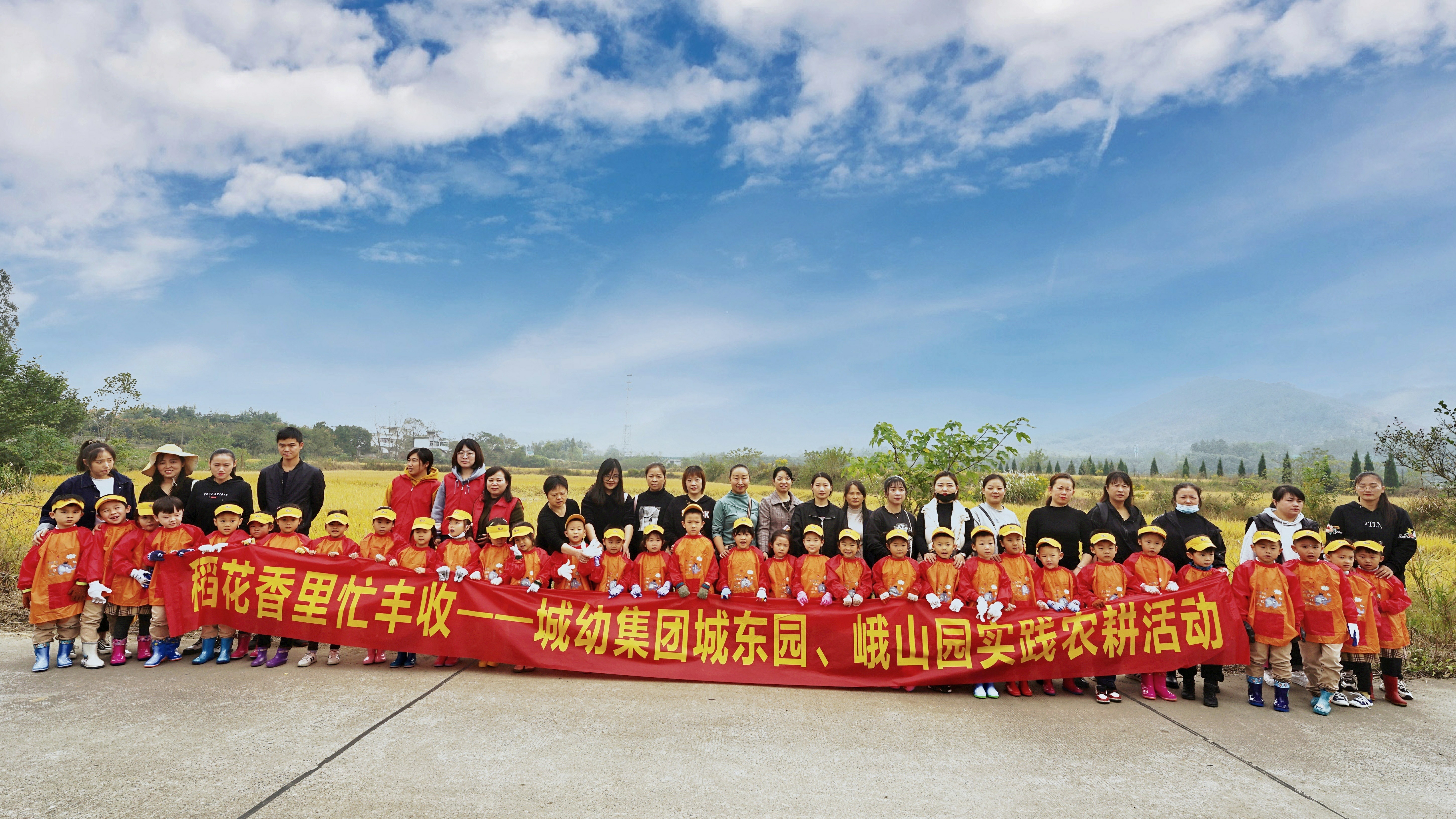 大自然是孩子最广阔的教室,赋予孩子们取之不尽的源泉。为了让孩子走进大自然 ,感受秋季收获的喜悦,享受大自然带给我们的幸福, 从而激发幼儿热爱大自然的情感。10 月27日我们带大班的小朋友们踏着快乐的步伐来到了乡间稻田。 出发前一天老师给孩子们提前上了一节《认识水稻》课程,孩子们在课堂上基本观察、解剖、区分水稻的根、茎、叶、果实,进一步梳理植物特点。为第二天去稻田实践活动做准备。 春种一粒粟,秋收万颗子。瞧,稻谷成熟啦!颗粒饱满,沉甸甸地随风摇曳,飘散出醉人的香,就像金色的海洋,翻腾着滚滚的金波。乘着秋风,孩子们在欢声笑语中,踏着轻快的步伐来到了田埂上,迫不及待地跑向金灿灿的稻田。 稻田里,小朋友欢声笑语,像小鸟一样叽叽喳喳。有的摸一摸,有的闻一闻,有的咬一咬,用各种感官去探索、感受稻田的秘密。“嗯,好香啊!好喜欢的味道。”“好多稻谷,我来数一数,上面有几粒米,一二三……哎呀,太多了,我数不清楚了。” “让幼儿在体验中成长”,孩子们在家长的指导下体验割稻子,带孩子们感受大自然的神奇,体验劳动者的辛苦以及收获的喜悦,感悟到劳动成果来之不易,同时也培养了孩子们懂得珍惜粮食,爱惜粮食!