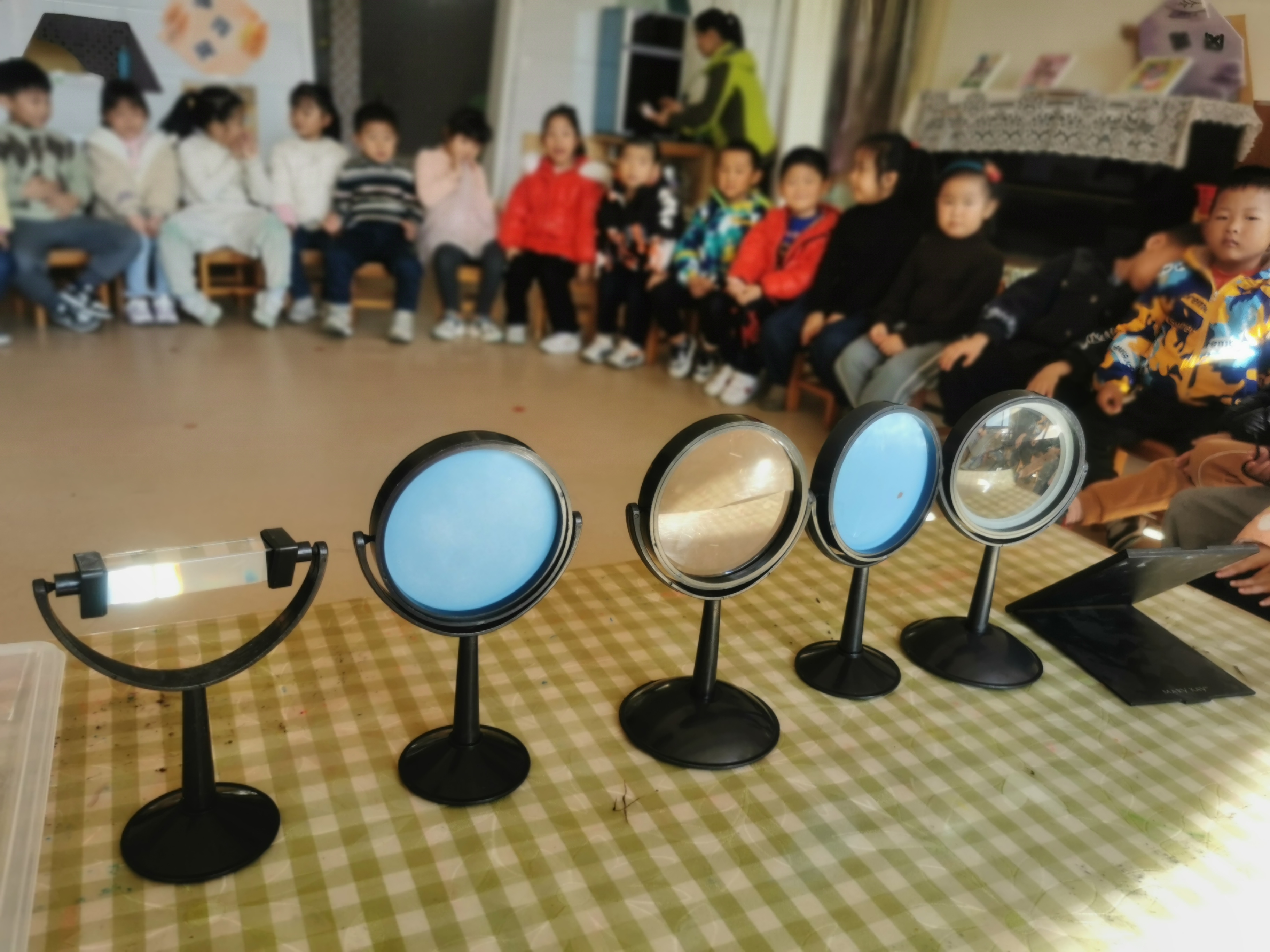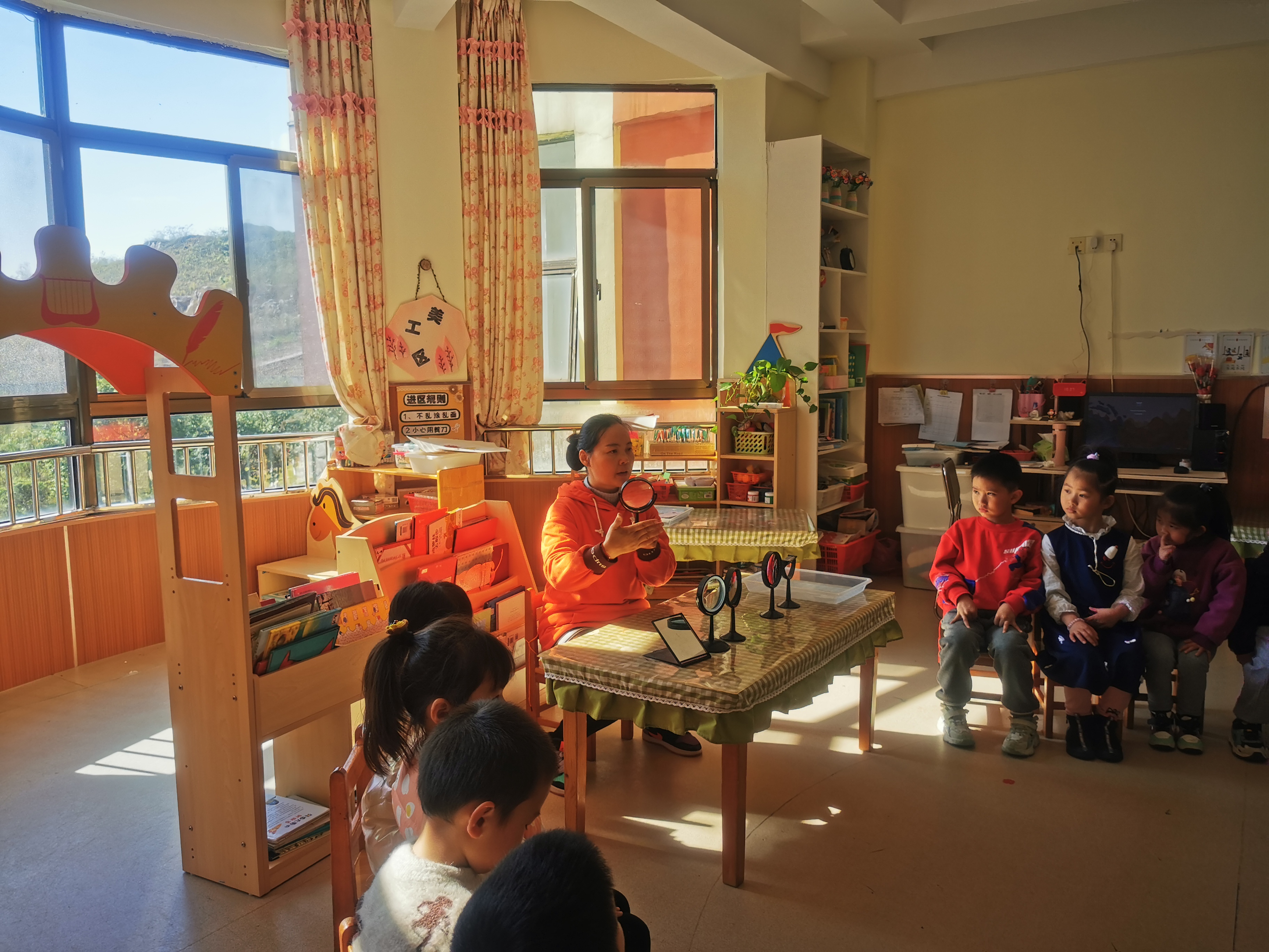因为幼儿对照镜子特别喜欢,所以,他们在今天的活动中能够在老师的引领下积极实行观察和探索,始终保持较高的兴趣。兴趣是最好的老师,所以,在活动开始环节,我以猜谜的方式引出活动,激发了幼儿的活动兴趣。探索学习是协助幼儿形成直接经验的有效方式。幼儿在活动中带着问题和已有经验自主操作材料、亲自感受与直接体验、发现并自己得出结论,形成对事物的感性理解,这种学习方式对幼儿科学教育实践有着重要的意义。我在活动中特别注重激发幼儿这种自主学习的兴趣,让幼儿成为活动的主人,把活动和学习的主动权交给孩子。所以,在活动设计之初,我就根据幼儿学习发展目标,设计了能够引发幼儿思考和探究的问题,注重幼儿的操作感知和体验。如:教师引导幼儿观察你的镜子是什么形状的?用手摸一-摸,你有什么感觉?说说这面镜子有什么特别?请小草莓再来照- -照镜子,看看谁能发现镜子里的小草莓不一样大的秘密,平面镜照的影子跟实物一样大,凹透镜会让小草莓变小,凸透镜会让草莓变大等等。 作为教师的我在活动中起到了-一个组织者、引领者和点拨者的作用。活动中我力求形成合作探究的师生互动、生生互动。除了以可爱、亲切的形象、饱满的情绪影响孩子外,还使用了以下几种教法,如:1.操作法:幼儿自己动手通过看一看、摸一摸、照一照等活动,了解镜子的种类,自主探索,获得感性理解和实践经验。2.演示法:通过演示凸透镜和凹透镜,让幼儿了解它们的作用,并在生活中寻找这些镜子。