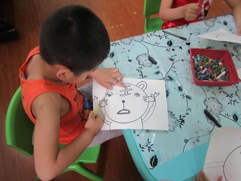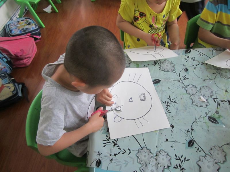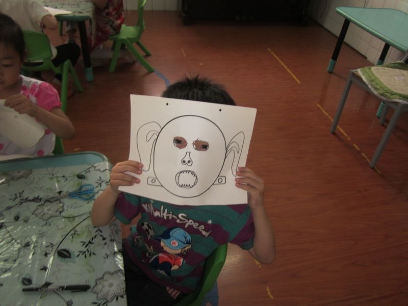 今天下午的美术室活动内容是----做一个面具。一听说要亲自做面具,孩子们兴奋极了,我给孩子们准备了一张画有一个圆形的白纸,发给了他们,孩子们根据自己的喜好创作出了一个个不同形象不同颜色的面具,我让孩子们把面具戴在头上玩,孩子们真的是非常的高兴。