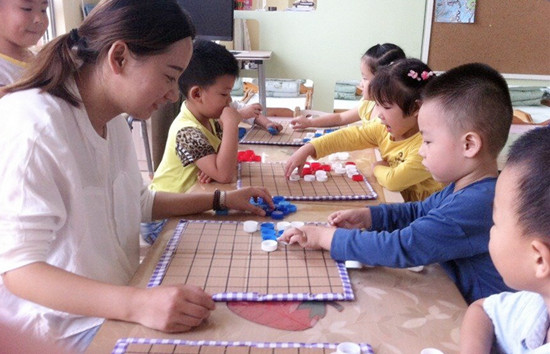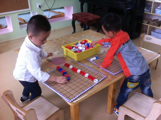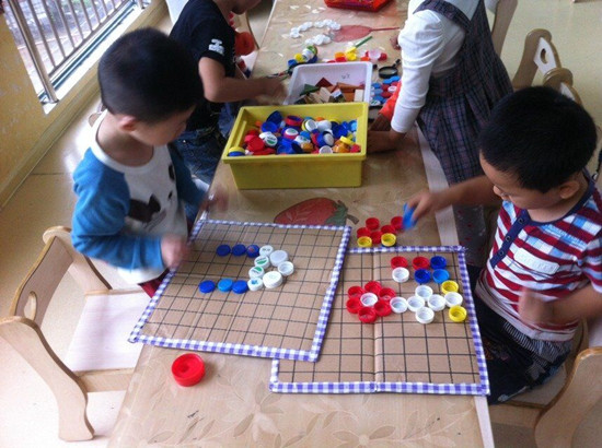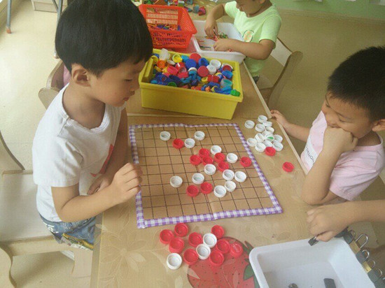 升入中班后,我班开设了“乐在棋中”活动区域,为了在区域活动中充分调动幼儿动手、动脑、动口的积极性,提高幼儿的智力发展水平。我们选用各类废旧瓶盖和纸板创设了“益智棋类系列”,以幼儿为出发点,迎合孩子兴趣,适合孩子特点,充分体现了区域活动的特色。该棋类系列自投放以来,深受孩子喜爱. 目标: 1、培养幼儿的观察力,提高思维的灵活性和敏捷性。 2、熟悉规则,能按规则游戏。 准备材料: 1、在废旧纸板上划线,做成棋盘。 2、 废旧瓶盖两色做棋子。 玩法一:两人各执一色棋子,每人都要尽快把自己的棋子摆成五子相连的一排(横、竖、斜排均可),同时阻断对方的五子连接,最后五子相连排数多者为赢。