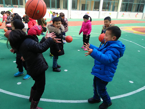 二.练习自抛自接球: 在活动中一开始发现大部分小朋友有的抛得太高,接不住,还有的抛得太低离开双手的距离只有两三厘米远,还有两位小朋友更有意思,将球往上抛时还把球抱得紧紧地,害怕皮球跑掉无论老师怎样引导都无济于事,无奈只好弃权。经过反复的练习,大部分的孩子掌握了抛接球的技巧。 三、练习你抛球我接球: 教师讲解技巧,活动中要求幼儿两脚分开,身体自然站立,两手自然分开中心向上。 投掷动作包含了手部的伸展和眼睛的瞄准等,是一个需要手脚协调,眼脑并用以及合作的运动,幼儿刚开始可能还掌握不好,所以在讲解时要重点讲,让幼儿多练习,教师示范演示几遍,并讲解要点:双手抱球往上抛,看准球,双手接住。 通过教师的正确讲解、演示,展示两人合作抛接球的正确方法和姿势。 然后请一半幼儿先把球放下,教师示范抛接球,重点介绍,两人间要注意拉开距离,抛者的球要注意力度与高度,接者要提前把双手准备好,随时等待接球,来回地抛与接。幼儿分散练习。大部分孩子掌握的较好,也有部分幼儿掌握不好抛球的力度,导致将球砸到接球幼儿的脸部及身上。这就要求孩子们在合作过程中要和小伙伴寻找默契,用球的力度自己在运动的过程中慢慢的去把握。 四:游戏“袋鼠妈妈接球” 玩法:幼儿围成一个大圆,教师手持球站在圆心,教师随意叫一个幼儿的名字,同时把球抛向那位幼儿,被叫到的幼儿接住球后,又把球抛向教师,游戏反复进行。孩子们在游戏的过程中兴趣很高,合作能力也得到提高。在以后的户外活动时将继续利用其他器材,如:小纸箱、塑料筐等练习抛接球,提高游戏的趣味性和难度。