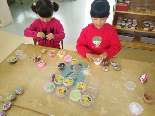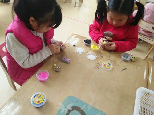 中班组区域活动简介 -----中四班 《3-6岁儿童学习与发展指南》指出:“幼儿的学习就是幼儿通过自己特有的方式与周围环境互动的过程,是幼儿主动地探索周围的社会环境、自然环境和物质世界的过程。”幼儿的学习是以直接经验为基础,在游戏和日常生活中进行。由此可见,环境在幼儿学习过程中有着举足轻重的作用,而游戏又是孩子最感兴趣的学习方式,珍视游戏和生活的独特价值,创设与幼儿的学习相适宜的环境,鼓励和支持幼儿亲身体验、实际操作,使之在模仿、感知、探究中获得经验,是每个幼教工作者的责任和义务。区域游戏活动是幼儿园教育的重要组成部分,是孩子们每天游戏、学习不可缺少的活动。区域游戏作为幼儿园游戏的形式之一,是幼儿最喜爱的游戏。 四月份根据我班幼儿的年龄发展特征、主题活动的开展以及幼儿的兴趣需要,我班开设了美工区、操作区(自由墙)、益智区、实景区(木偶剧场)、建构区。 一、 美工区:石头娃娃 材料准备:石头、轻粘土 玩法:学习用轻粘土粘贴的方式装饰石头,引导幼儿大胆发挥想象。