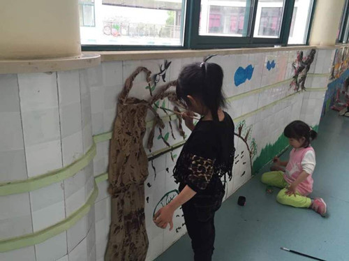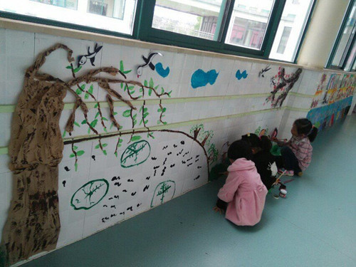 四、 自由墙操作区:美丽的春天 准备材料:水粉、粘土、牛皮纸,白纸、记号笔等。 玩法:幼儿在自由墙上自由操作,发挥自己的想象,创作出美丽的春天的情景。