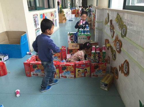二、 建构区:快乐建构 材料准备:奶杯、纸盒、木块 玩法:提供奶杯和各种薯片桶,继续鼓励幼儿进行跨合作搭建,引导他们相互交流,培养幼儿学分享合作的品质。