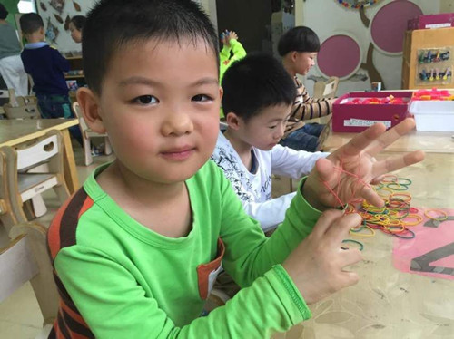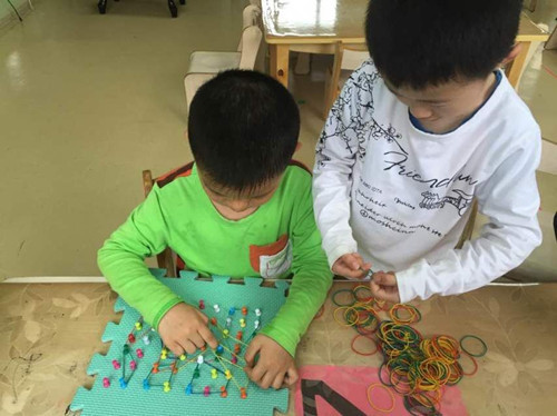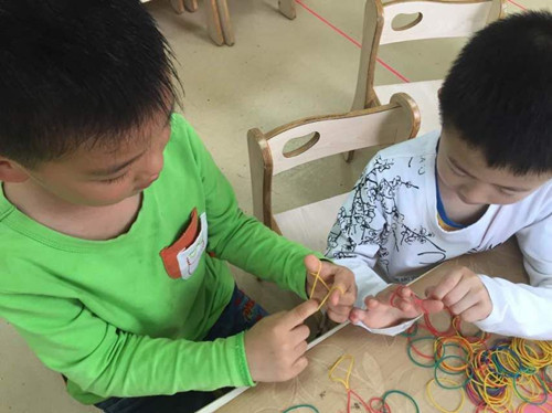 橡皮筋是日常生活中常常可見的东西,可是我们往往轻易的就將它随手一扔。可是你知道吗?不要小看它,瞧!我们班孩子把橡皮筋玩出各种新花样! 游戏目标: 1、了解皮筋的特性(弹性)以及在生活中的作用。 2、尝试运用皮筋在小手上造出不同形状,在此基础上,寻找在纸板上造型的方法。 3、 通过多次的探索体会玩皮筋的乐趣。 游戏准备: 彩色橡皮筋、泡沫板、蘑菇钉 玩法一:百变拼图 幼儿根据自己想象大胆在蘑菇钉上拉出各种图案,鼓励幼儿拉出造型独特的图案,并说说你造型像什么。