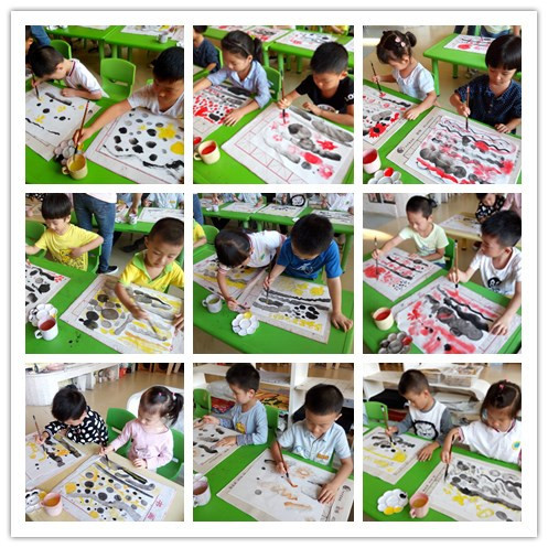 今天是第一次带孩子们上水墨画课,让孩子们对水墨画产生兴趣是本课的重点。我特意在美术室里挂上了一些水墨画作品,孩子走进美术室对这种不一样的作品产生了极强的好奇心,在孩子们叽叽喳喳猜想这些作品是用什么笔画出来的时候,我出示了油画棒画、线描画两幅作品,让幼儿观察颜色上和水墨画有什么不同,通过对比让孩子们初步接感知水墨画的特殊艺术效果。 接着介绍水墨画的工具,在这一环节没作太多缀述,只让幼儿有一个初步的了解。不一样的绘画工具激发了幼儿产生玩水墨的兴趣。刚拿毛笔的他们有一种欲书欲画的喜悦感,我便决定顺从他们,先让他们尽情地写画,不强行教孩子如何执笔,如何运笔。当“水和墨做游戏会有什么变化?”的问题一提出,孩子们更是跃跃欲试,于是让他们大胆尝试,自由探索墨和水的关系,不求效果只要敢于操作。虽然我没有要求孩子什么中锋、侧锋等等,但幼儿在活动时自己发现:笔在宣纸上停留的时间长圆点就大,停留的时间短圆点就小,笔竖直画的线条要细一点,笔侧着画出来的线条会很粗而且会有浓淡的变化,这种墨的神奇变化让孩子们惊喜不已。