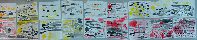 进入下一个环节,给出一个游戏主题“下雨的时候是什么样子呢?”任幼儿尽情议论着下雨时的情境,然后引导幼儿想想“如何用墨来表现?”让幼儿在想像空间里玩水墨游戏,孩子们陶醉在自己的世界里海阔天空——小圆点是“滴哒滴哒”的小雨、斜线是“沙沙的”细雨、绕成圈圈的是“呼呼呼”的大风……所有的线条与墨块都被赋予了生命和灵动,孩子们的脸上一片快乐。