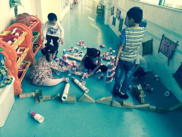 区域名称:我们一起搭高房 材料:奶杯、木制积木。 玩法:幼儿合作搭建高房。