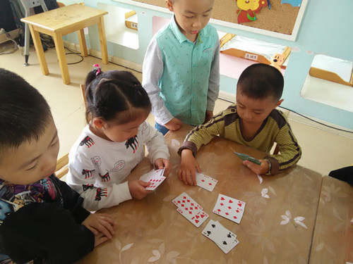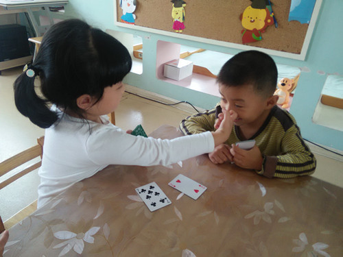 孩子们对扑克牌的游戏兴趣大增,在游戏中还有的孩子玩出了新花样,如:在“大吃小”游戏中,拿大牌的孩子可以用手去刮拿小牌的孩子的鼻子。从孩子们的表情上看的出来,他们非常喜欢这样的游戏,很有趣味性。扑克牌的投放不但促进幼儿自主性探索能力的发展,而且数学(认识数字、数数、比大小、相邻数等)思维能力和两两合作能力也得到了发展。 |