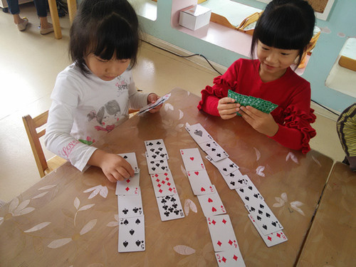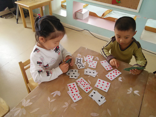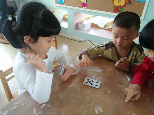 游戏四:配对子 目的:认识数目;比较数量的多、少、相等;培养记忆力。 玩法:两名孩子各拿一半牌,轮流出牌,每次只能各出一张牌,然后根据出好的牌,双方各自在自家牌里找出与之数目一致的牌,使之成为一对。先配成一对的为胜,将牌收回家。如此轮流出牌,直到把对方的牌都配成对子取走。最后就分出胜负了。