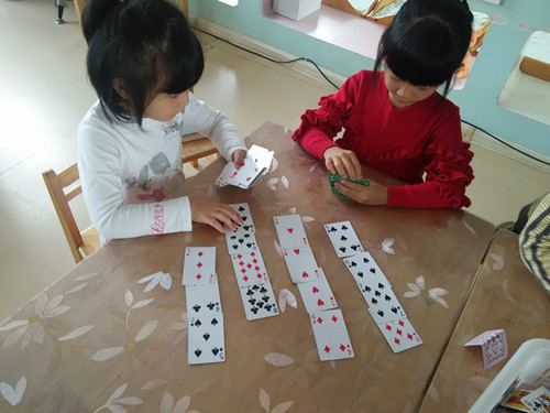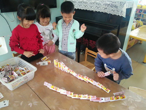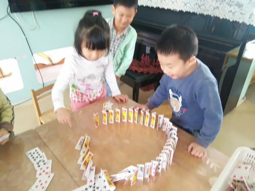 扑克牌是生活中常见的物品,取材简易,经久耐用不易损坏,玩法多样,不受人数限制,深受幼儿喜爱。大班孩子爱探索,喜尝试,用扑克牌玩出了各种各样的花样。 游戏一:多米诺骨牌 目标:培养幼儿的耐性和专注性,体验游戏的快乐。 玩法:将扑克牌直立于桌面,按照一定的间距排成单行或分行排成一片。触击一枚扑克牌,其余发生连锁反应,依次倒下,形成一幅图案.