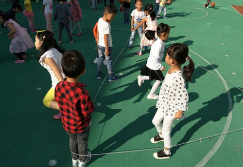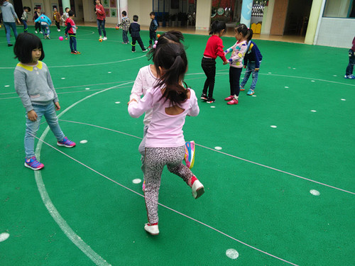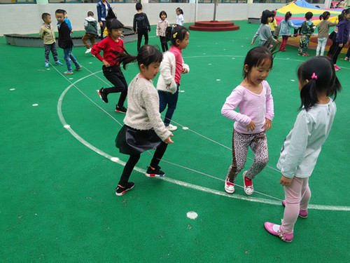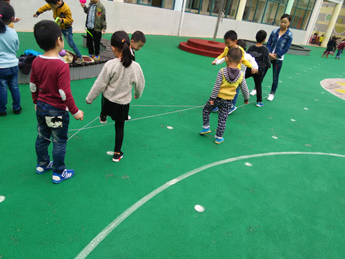生成背景: 升入大班后,根据孩子们的兴趣,确定了我们大四班的体育特色——跳皮筋。跳皮筋是幼儿喜欢的一种民间游戏,能锻炼幼儿的腿部力量,提高幼儿身体动作的协调性和灵活性,并能激发幼儿对民间体育游戏的兴趣以及体验合作游戏的快乐。为了让孩子们能更快、更好地掌握跳皮筋的技能,我们开展了体育健康活动:跳皮筋 活动目标: 进行基本队列练习,幼儿由一路纵队站成六队:立正、向前看齐、成体操队形散开。 2、进行热身运动。 教师带领幼儿做上肢运动、下蹲运动、体侧运动、体转运动、腹背运动、跳跃运动、放松整理。 3、教师出示皮筋给幼儿看,引导幼儿探索皮筋的玩法:皮筋可以怎么玩呢?请每五个人拿一根皮筋,找一块空地试试怎样玩。 教师:(集中幼儿)你们刚才是怎样玩法? 请幼儿说说自己的玩法。 4、教师重点讲解两人用腿绷住皮筋,其余三人跳的方法:两人用腿绷住皮筋,其余三人在皮筋上跳,皮筋不要拉得太紧,也不要拉得太松。 5、尝试在皮筋上用勾、踩、跃的方法跳。 教师:我们用刚才学习的方法跳皮筋,想一想在皮筋上可以怎样跳? 6、幼儿五人一组分散探索,教师巡回观察。 7、幼儿集中,教师:大家刚才发现了什么玩法? 8、幼儿在集体前展示。 教师边示范边小结:可以踩在皮筋上,可以越过皮筋,可以勾住皮筋跳过去。 9、结合儿歌运用踩、勾、跃的方法跳皮筋。 (1)、教师:我们都学会了双脚并拢,用勾、踩、跃过皮筋的玩法。你们看,老师还可以一边念儿歌一边跳皮筋呢:双脚站在皮筋左侧,右脚迈入皮筋里,左脚跟上,右脚在左脚之后向皮筋外侧点, 接着右脚收回,同时左脚跳出,右脚跟着跳皮筋。(一二三四五六七,马兰花开二十一,二五六,二五七,二八二九三十一。。。。。。九八九九一百零一。)边唱边跳。 小朋友们真爱玩(双脚踩在第一道皮筋上再跳到第二道皮筋上),弯弯腿、跳小河(跳下皮筋,再跃过两道皮筋跳到对面去);蹦一蹦,跳土坡(同第一个动作);跨一跨,过山冈(同第二个动作);勾一勾,不要放(双脚勾住一边皮筋,跳跃,把这根皮筋带到另一根皮筋外面)。 (2)、请个别幼儿试一试。 (3)、幼儿分组边念儿歌边跳皮筋,教师提醒幼儿用轮流的方法合作玩跳皮筋。 规则:如果勾皮筋时勾住了,就将皮筋的高度往上升一拳继续跳;如果有没有勾住皮筋的幼儿就被罚下场,其余的人再接着跳。一轮完了,替换绷皮筋的两个人。 (4)、组织幼儿进行游戏。 (5)、教师评价幼儿游戏比赛情况。表扬能够克服困难,有团队精神的幼儿。 10、结束部分: 幼儿自由结伴,互相轻捶腿部,放松下肢肌肉。 活动反思: 跳皮筋是一项民间传统的游戏活动,较为普及。经常参加跳皮筋游戏活动,不但能够提高跳跃能力,同时也能发展协调性和灵敏性,跳皮筋的方法很多,有单人跳、双人跳、多人跳,以及单脚跳、双脚跳、花式跳等。还可以自己创编一些跳跃方法来跳皮筋。 本次活动中,孩子们能积极地参与游戏。也体验了合作游戏的快乐。在第一次探索皮筋的玩法时,只有少部分幼儿在认真探索,大部分孩子只是绕着皮筋乱跑。在老师的引导下,孩子们能继续探索皮筋的跳法,学会基本的双起双落动作。大部分的孩子能根据唱儿歌时的节奏边唱边跳;还有个别孩子玩出了花样,用自编的跳跃方法跳皮筋,加强了同伴间的合作。在练习前的准备活动中,引导学生模仿动物的跳,充分活动学生的各关节部位,避免因活动不充分,导致跳跃时扭伤踝关节等意外事故的发生。但在练习中,还是有部分幼儿不能很好地与同伴交流合作,表现出排斥同伴、强占练习次数、不架皮筋等不良行为,针对这种现象,老师细心做工作,多教育鼓励孩子,更要正确的引导幼儿同伴之间要和睦相处,友好合作,共同进步,体验关心帮助他人的快乐。